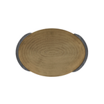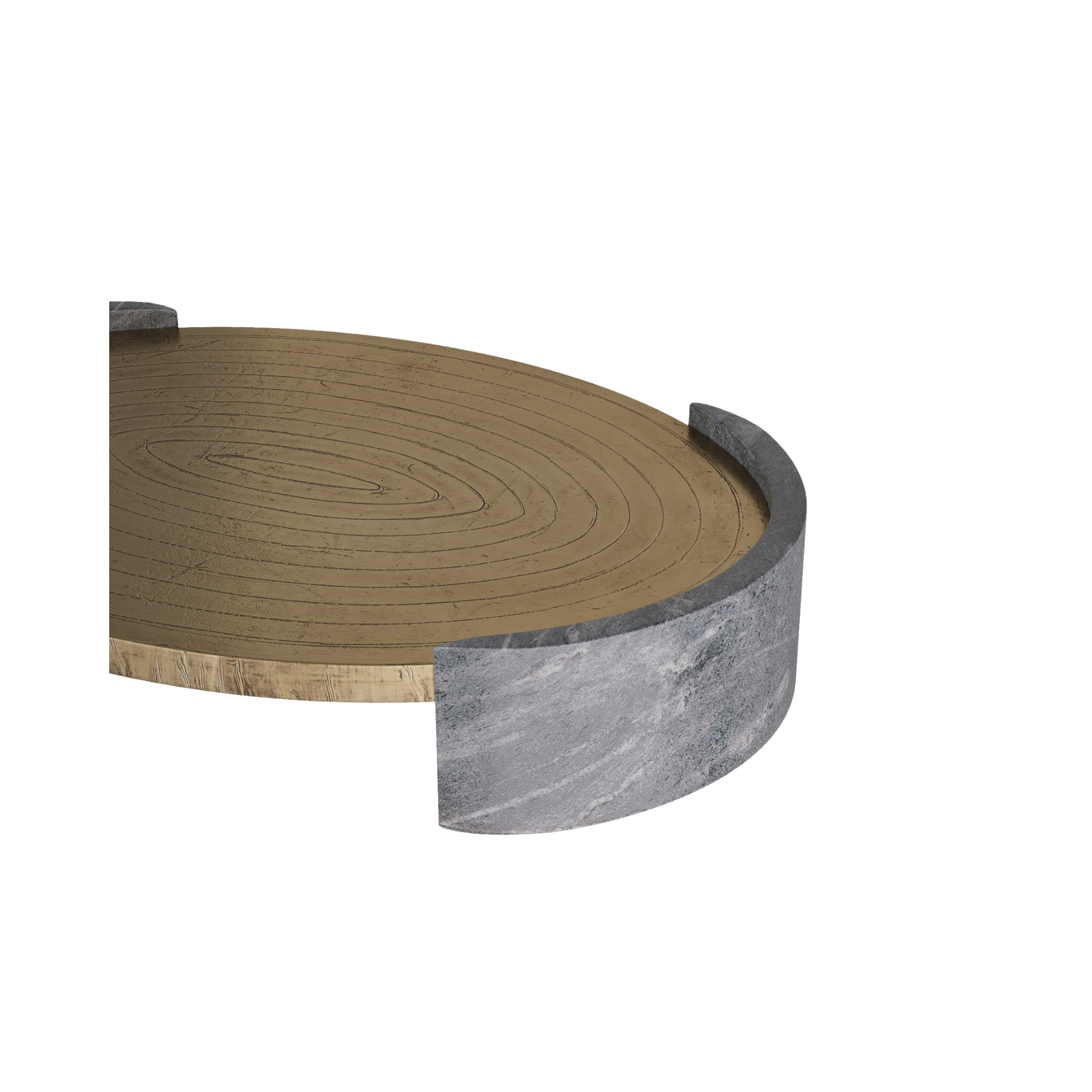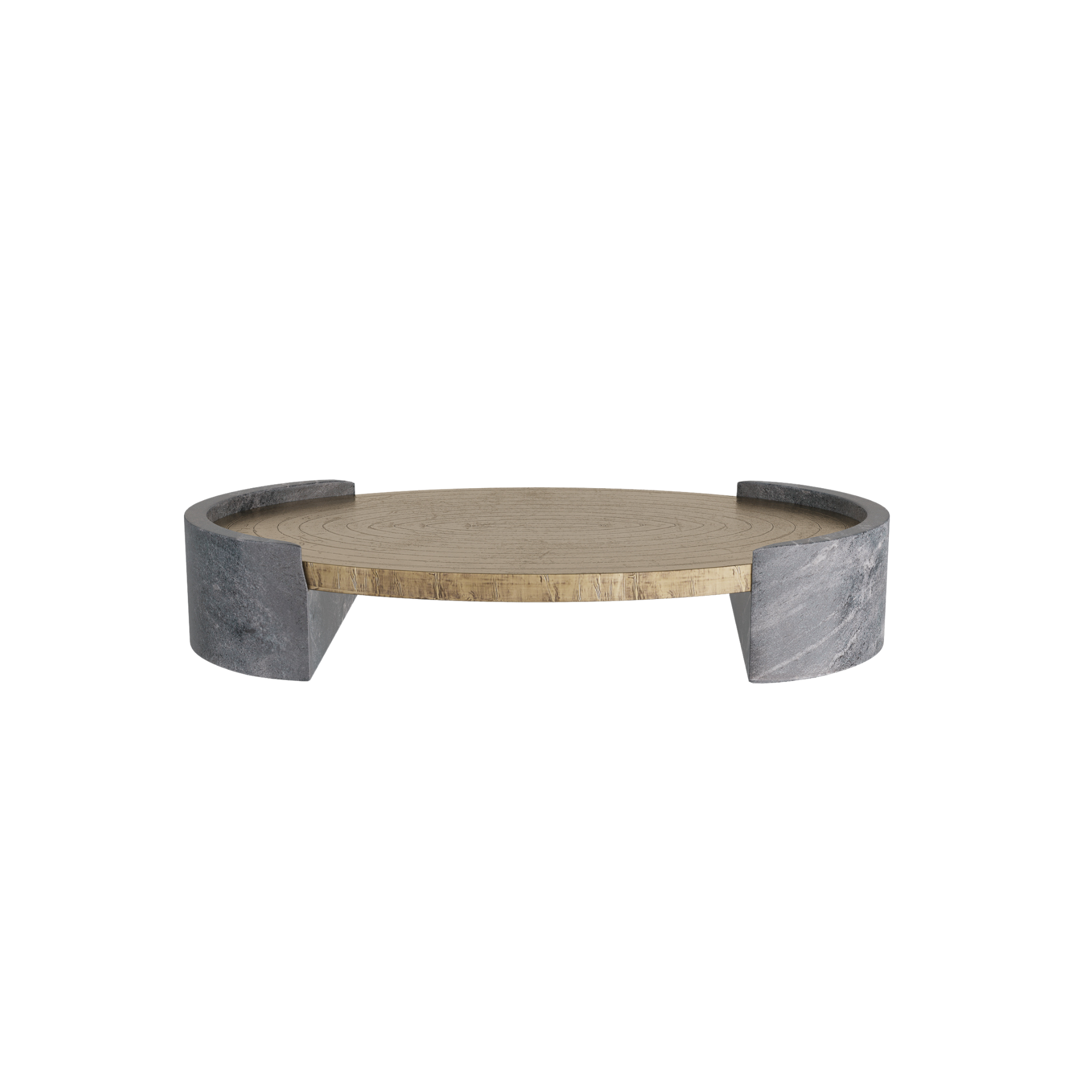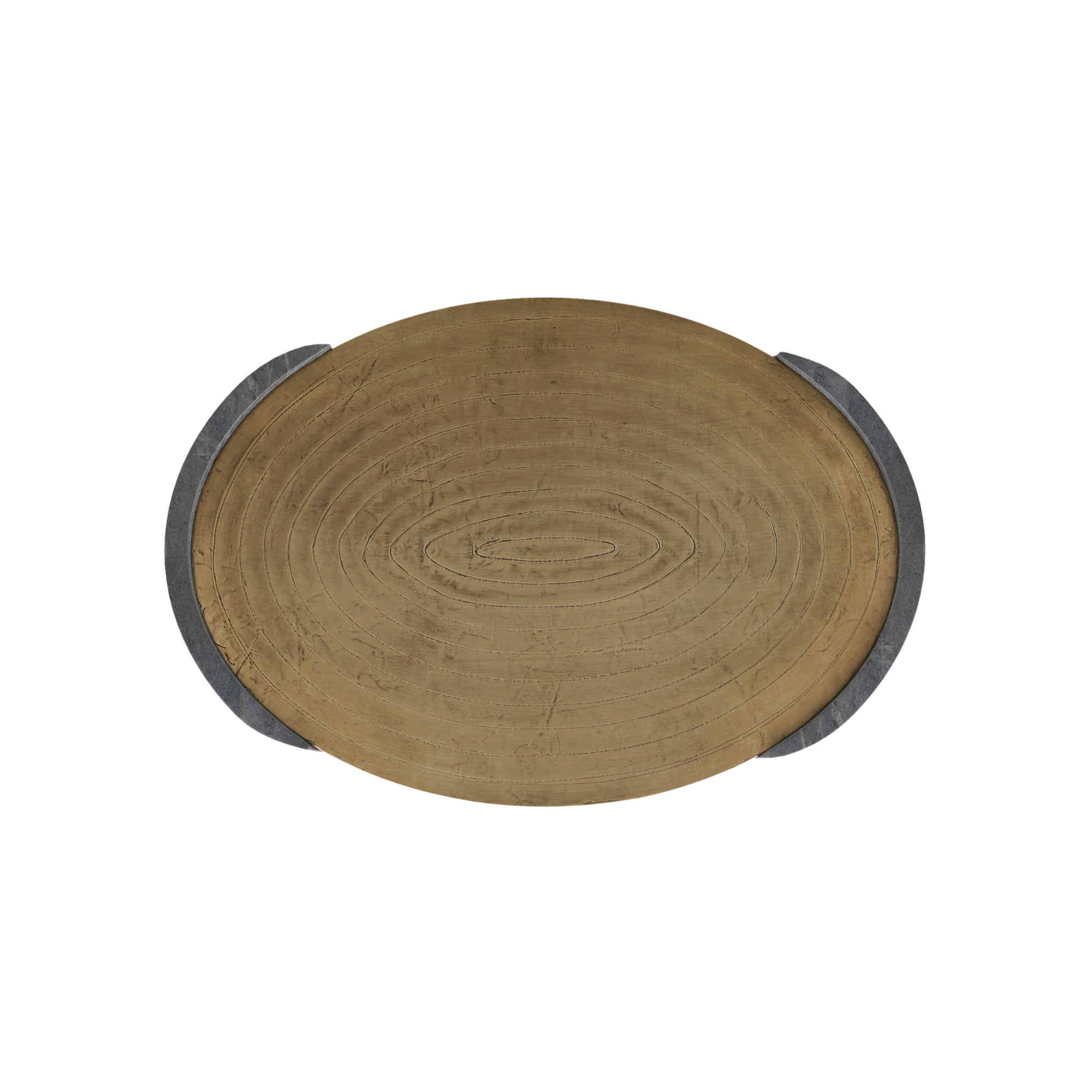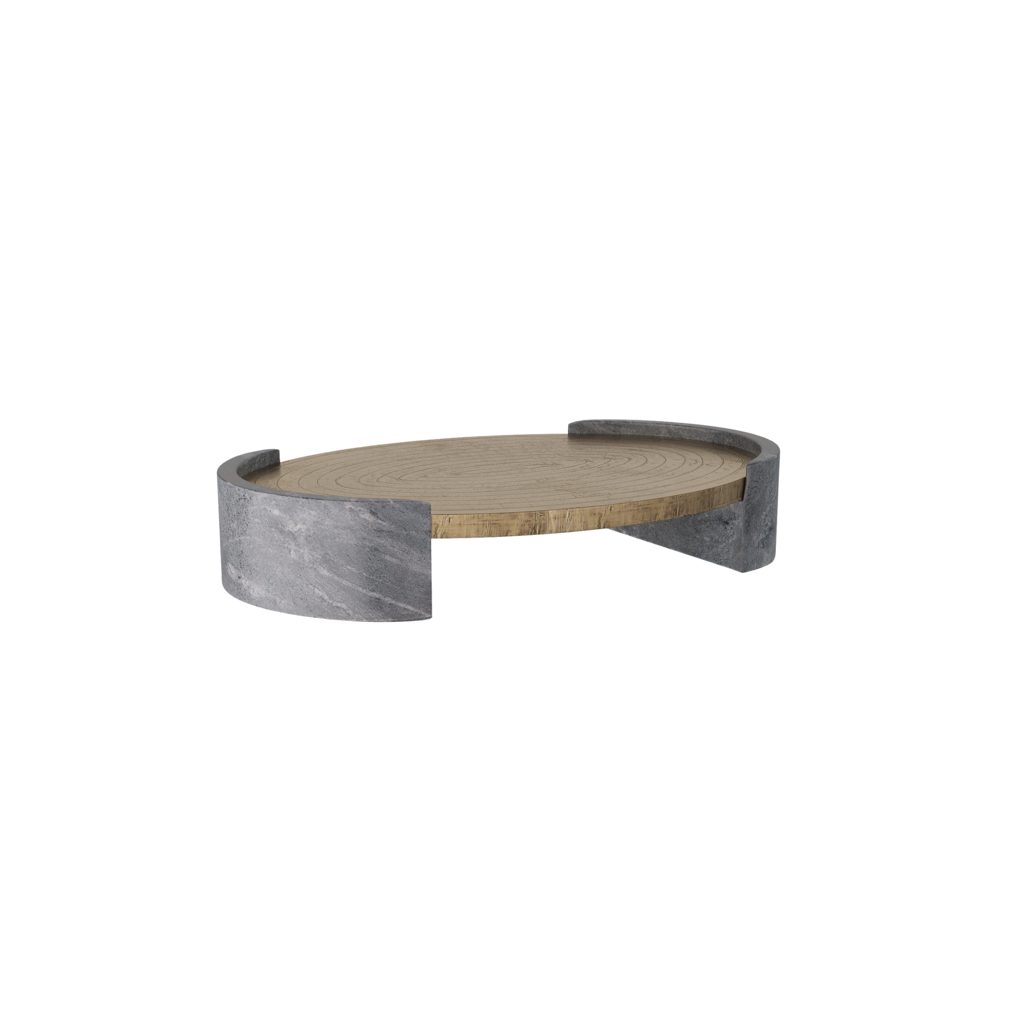 Suspended with supports of grey marble, an antique brass clad oval offers a pleasing mix of materials. Carved at the top with a concentric pattern, it is an impactful accessory for any surface. Finish will vary.