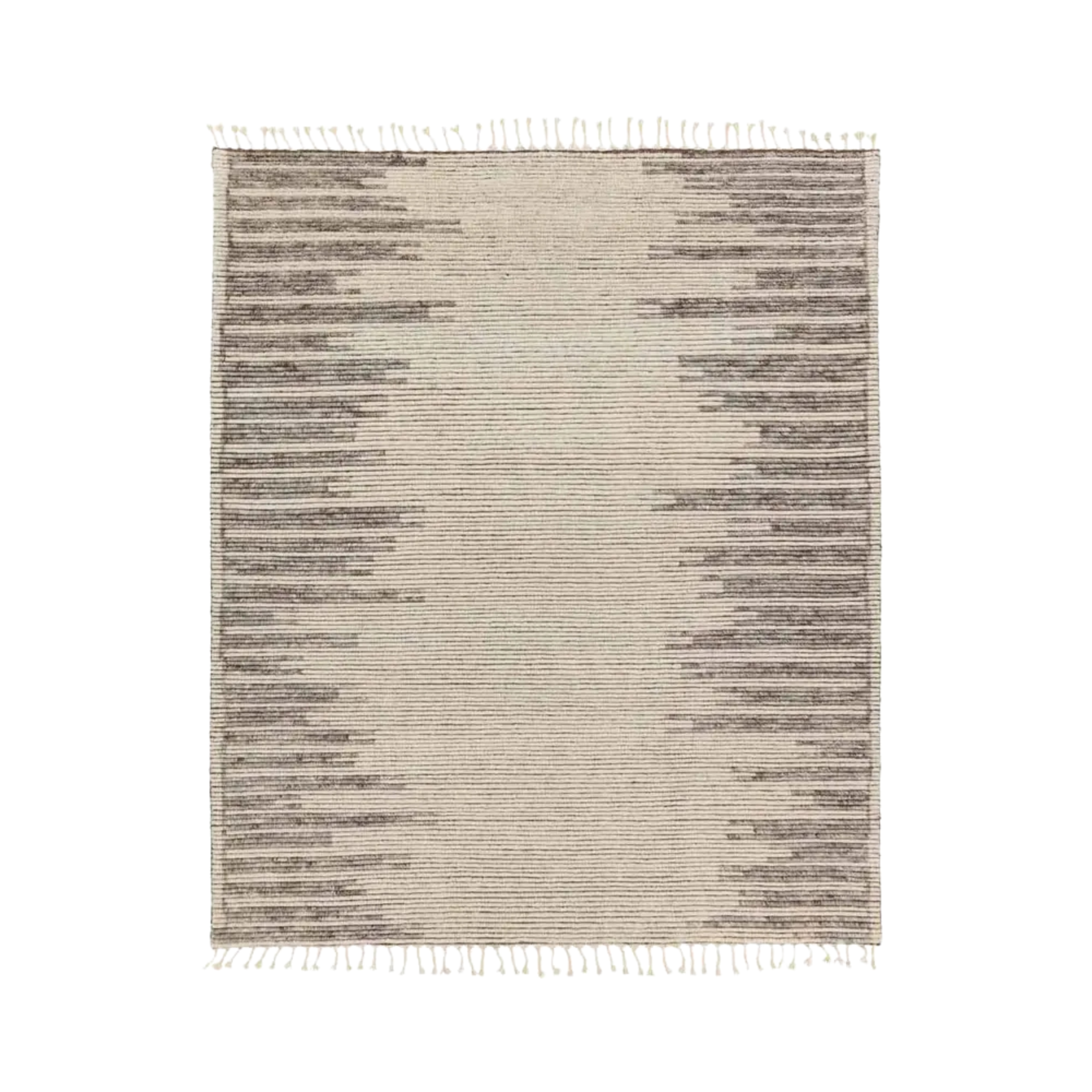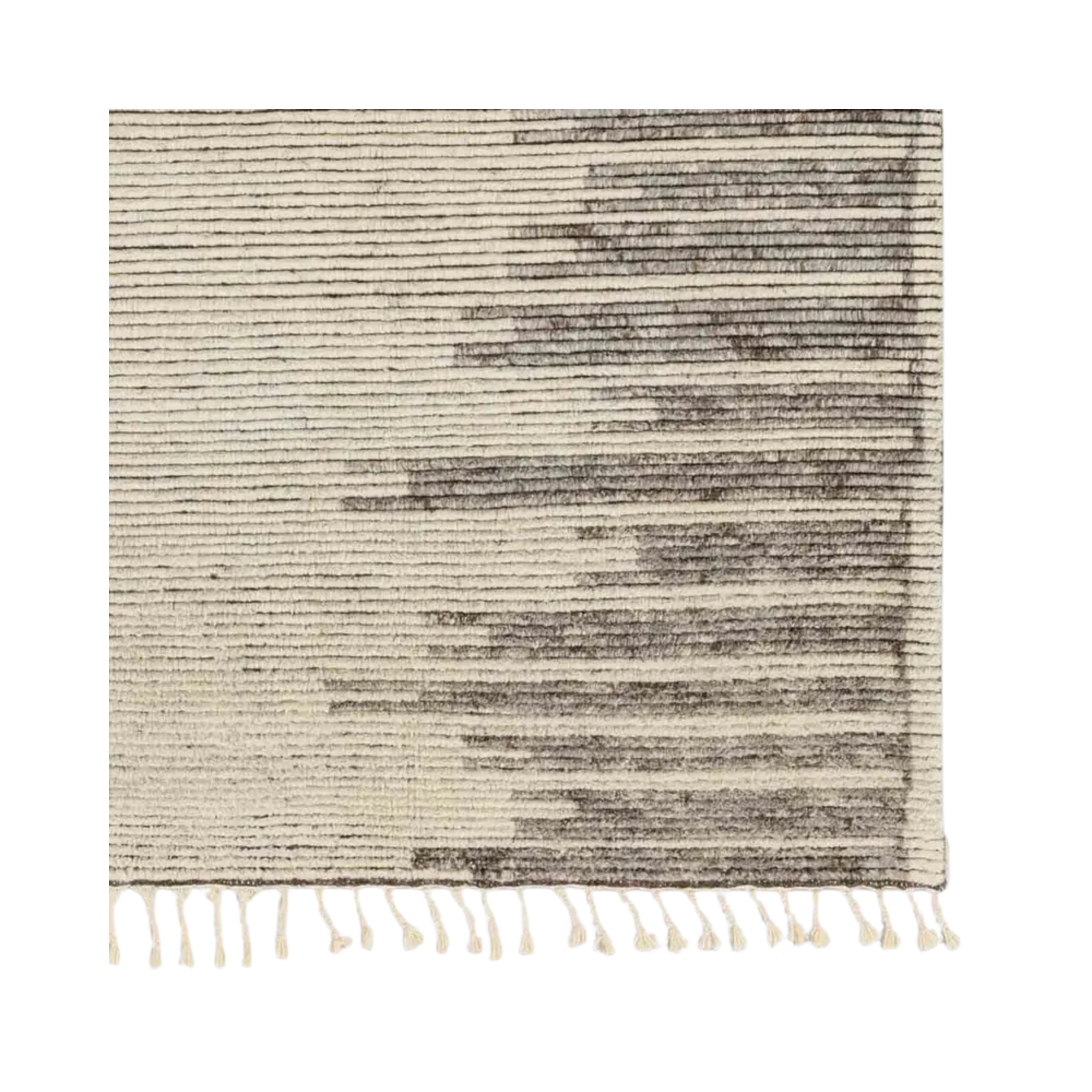 Inspired by textiles from the Tullu region in Morocco, the Patra area rug showcases a linear design in neutral shades of cream, taupe, brown, and gray. This high-piled accent lends warmth and comfort to any space with durable wool hand-knotted onto a cotton foundation. Braided fringe trims the edges for a touch of boho charm. This indoor rug thrives in medium traffic areas of the home such as bedrooms, formal dining areas, and formal living rooms.