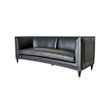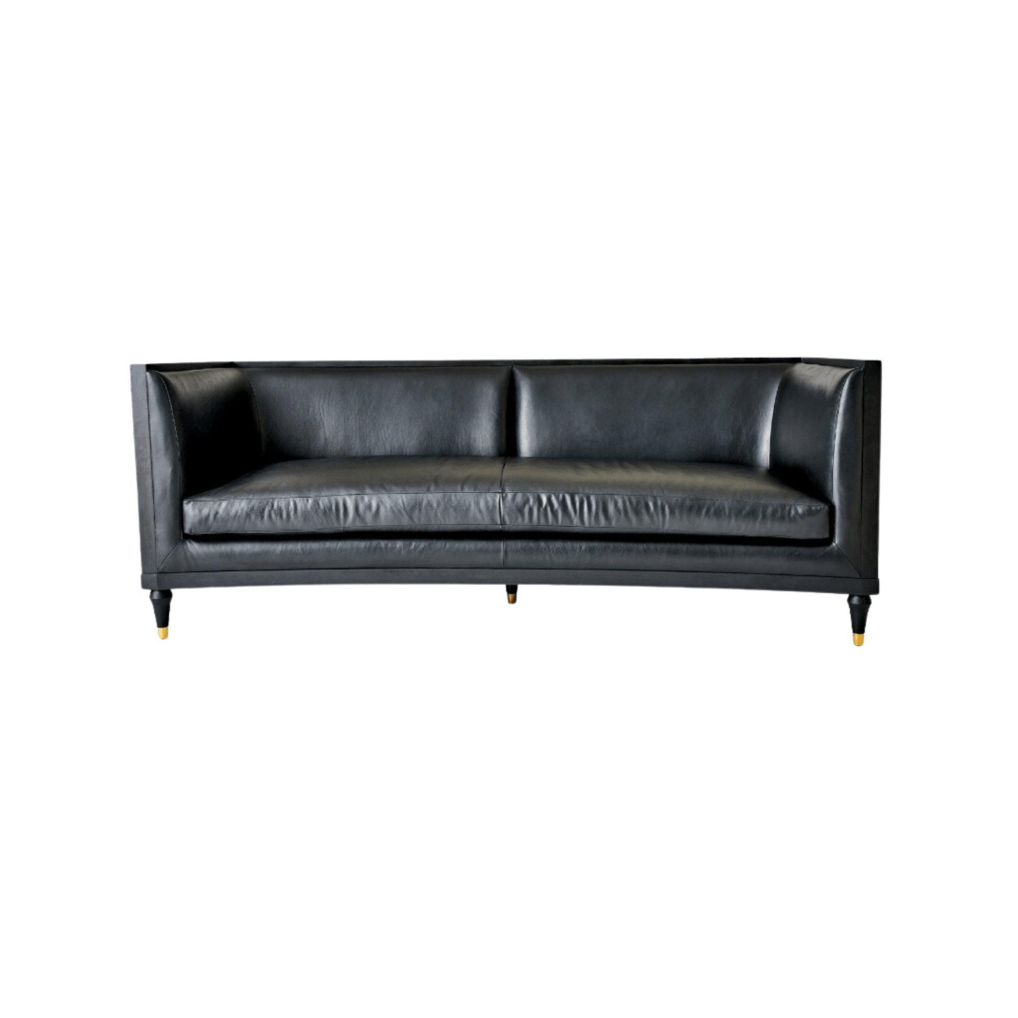 The Arc Sofa boasts a sturdy ash wood frame, luxurious top-grain leather upholstery, and elegant brass sabots for exceptional craftsmanship. Its beautiful back finish allows for graceful placement in any living space, making it a striking centerpiece.