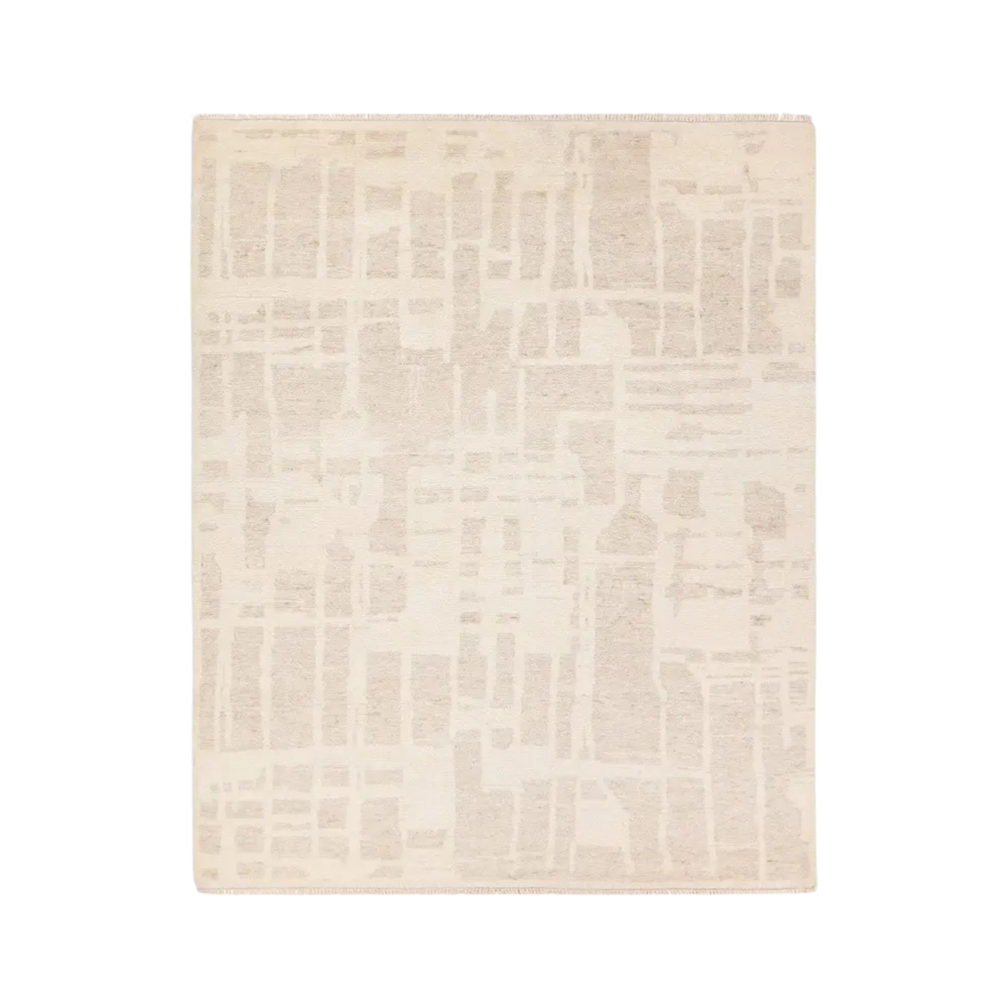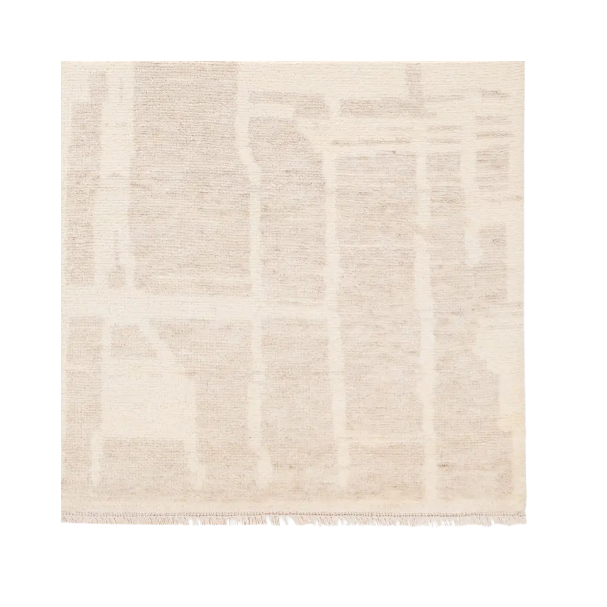 Hand carded wool, soft Tencel, and a neutral color palette define the handknotted Ashend collection. The Airme rug showcases a Moroccan-inspired abstract motif in a neutral, cream, taupe, and beige colorway. Short, cream fringe adds to the global charm while the lustrous sheen establishes an elevated look. This accent piece provides comfort underfoot while adding texture to low traffic spaces of the home such as bedrooms, formal living areas, formal dining areas, and sitting rooms. Expertly handcrafted in India, this rug is certified by both Nest and RugMark, assuring ethical luxury.