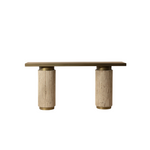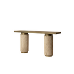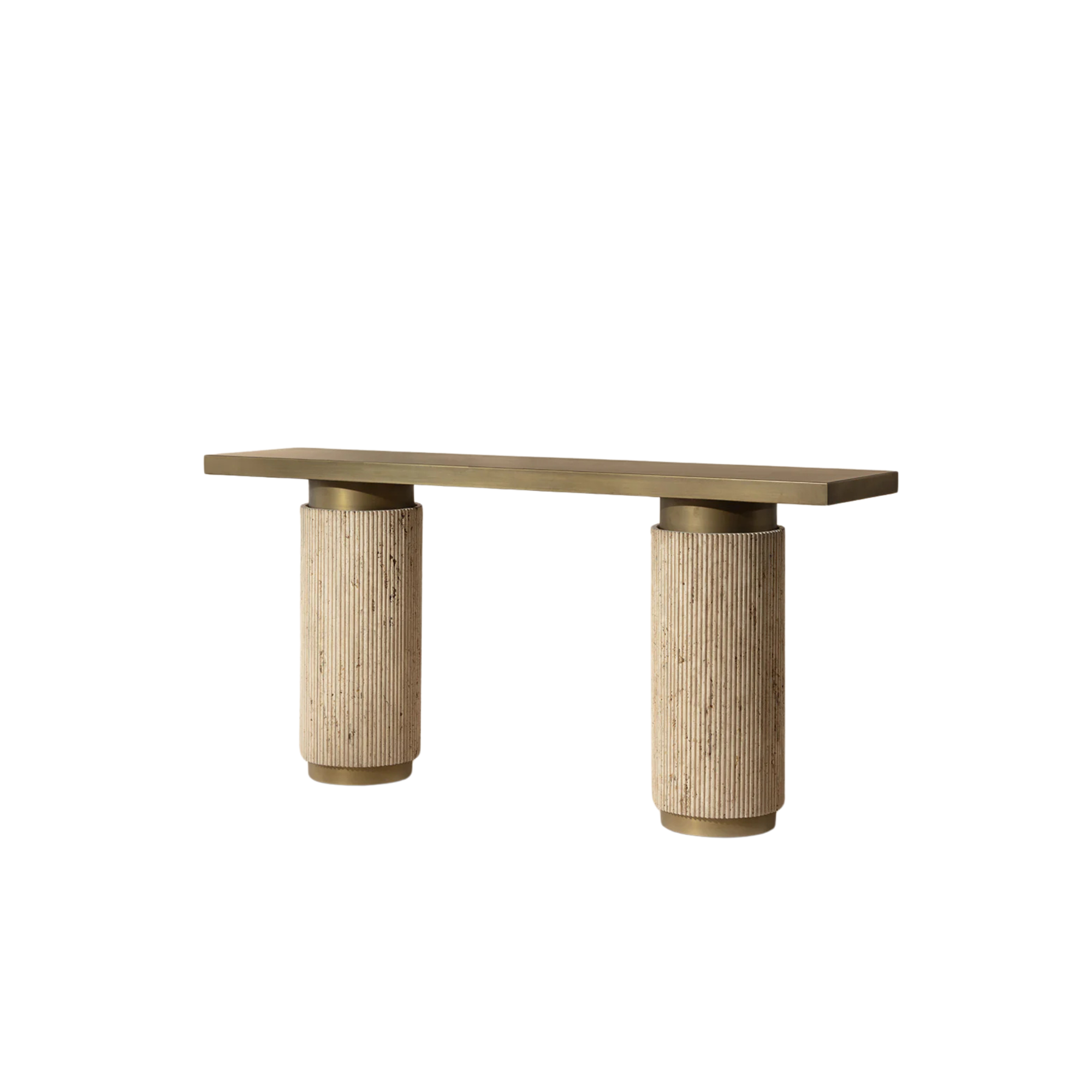 The Ashva Console Table evokes the classic beauty of Greek columns with elegantly reeded travertine wrapped around the legs. Crafted with an antique brass iron table top and base, this console table brings a refined rustic air to any interior space.