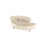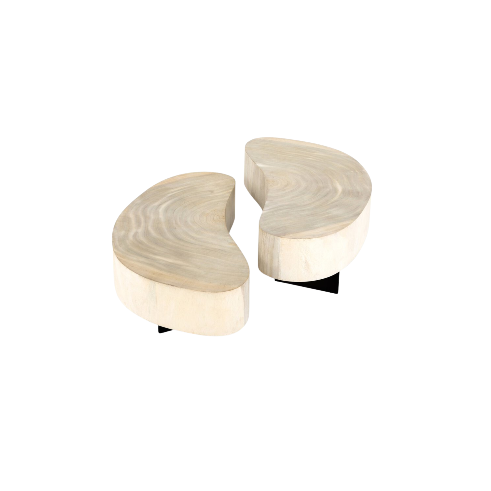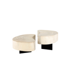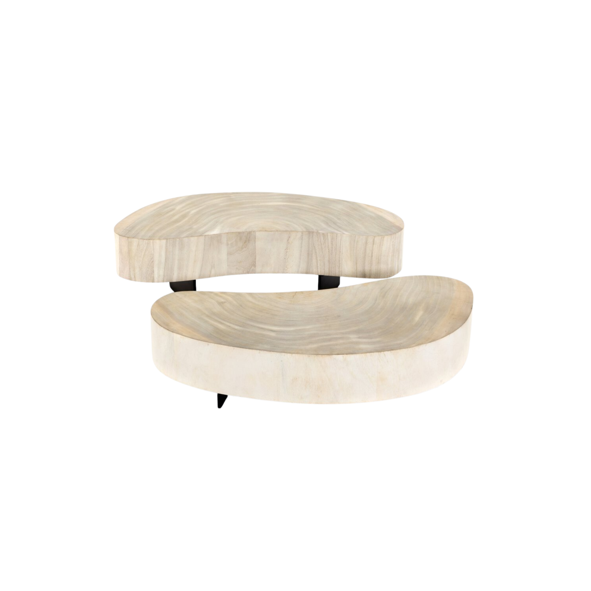 Natural beauty - total novelty. Oyster-cut Guanacaste forms kidney-shaped coffee tables in varied heights, creating a beautifully layered look. Visible veneer rings speak to woods' natural graining, while a dark gunmetal-finished base provides clean contrast to the whole look. Tables sold as a set.