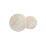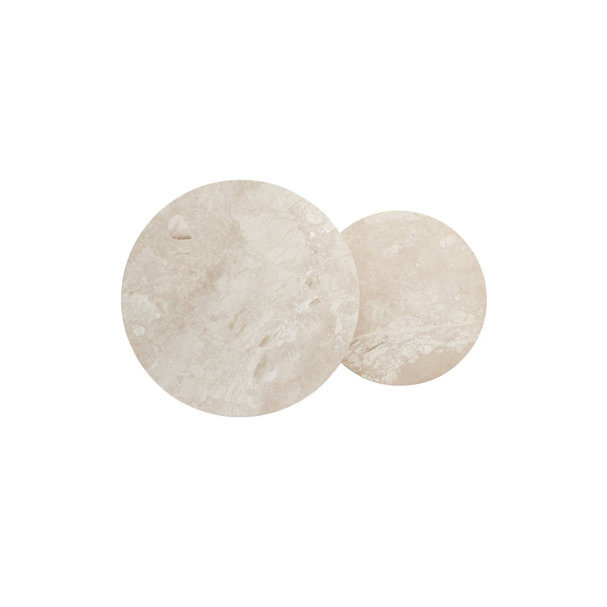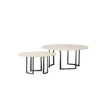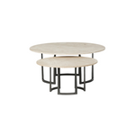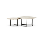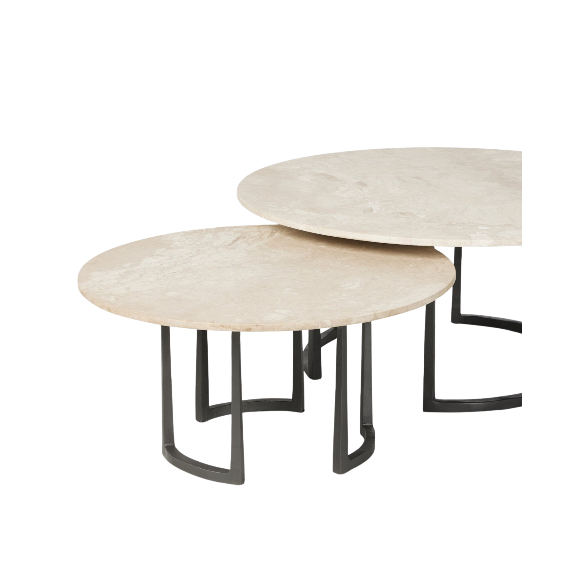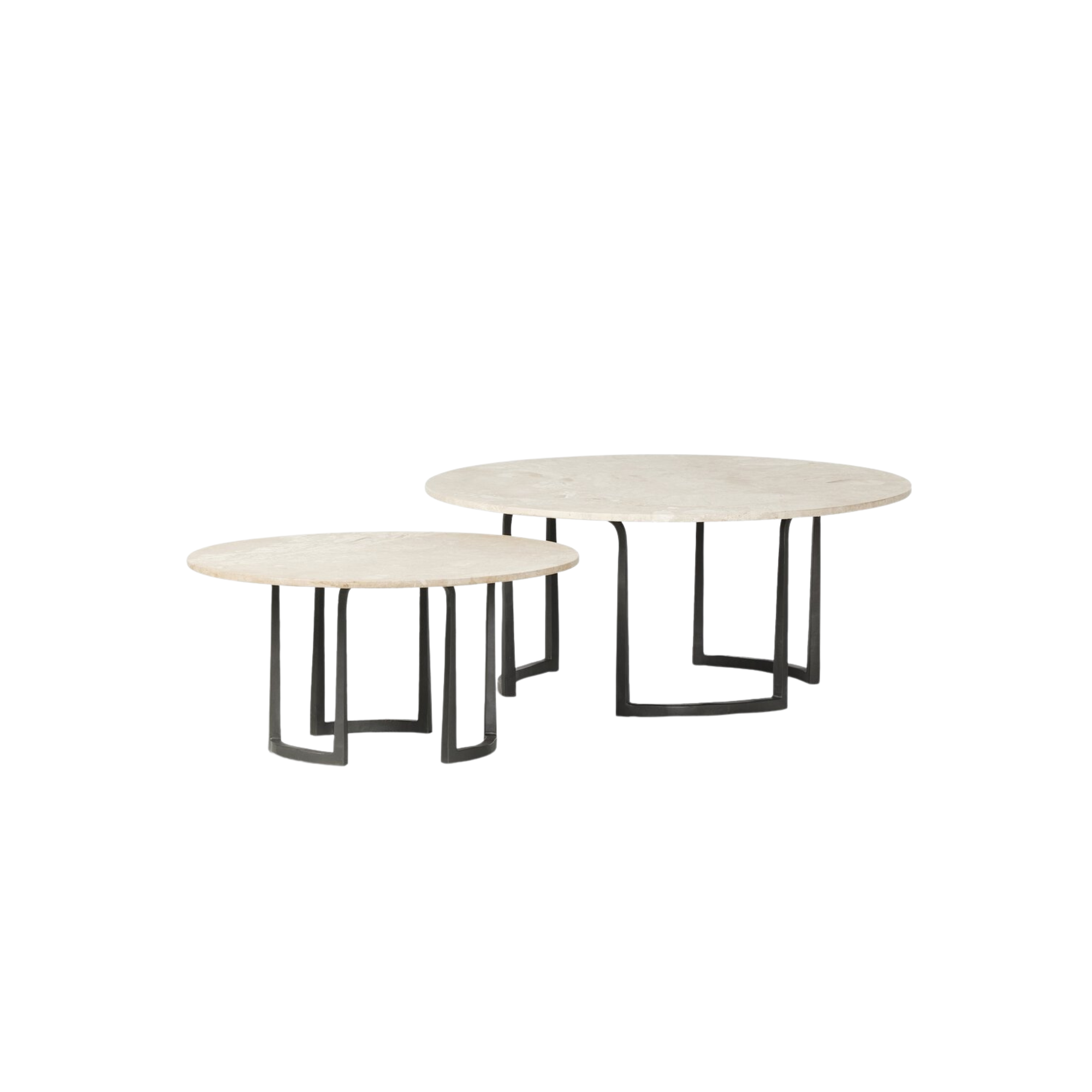 Hammered iron bends seamlessly in a continuous pattern to create the bases of these mixed-material nesting coffee tables. The rounded tops, made from expressive marble, display unique markings and natural patterns.