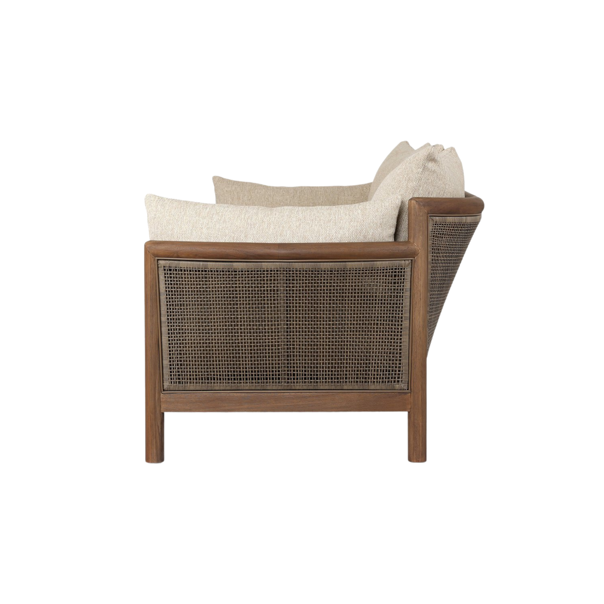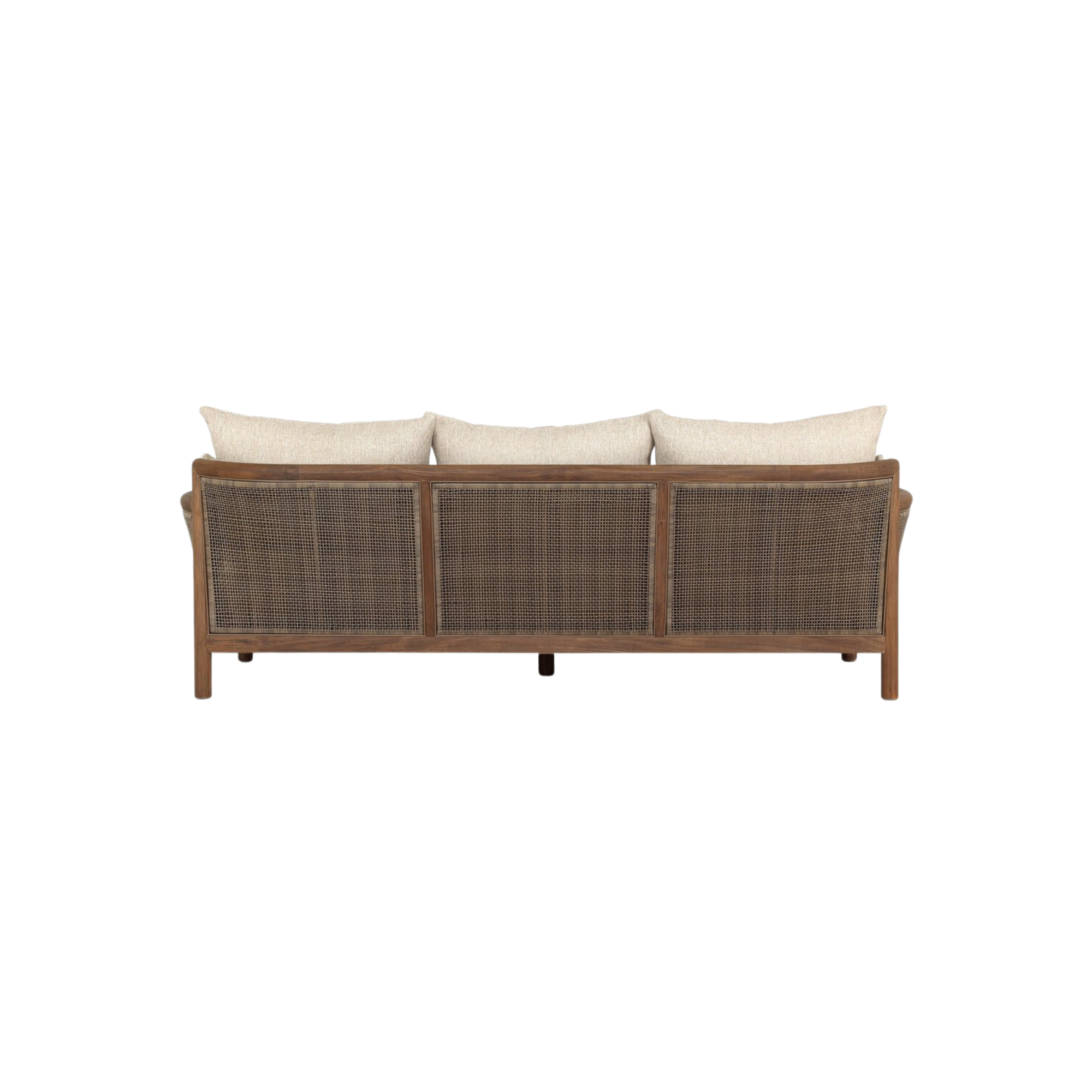 The Barbosa Outdoor Sofa redefines cane weaving with a contemporary touch, crafted from durable all-weather materials. Its softly curved frame and plush 3-over-3 cushions provide exceptional comfort, while the woven design adds a sophisticated texture that bridges indoor luxury with outdoor resilience. Ideal for any patio or garden, this sofa offers lasting style and comfort, making your outdoor living space a seamless extension of your home. Cover or store when not in use.