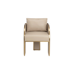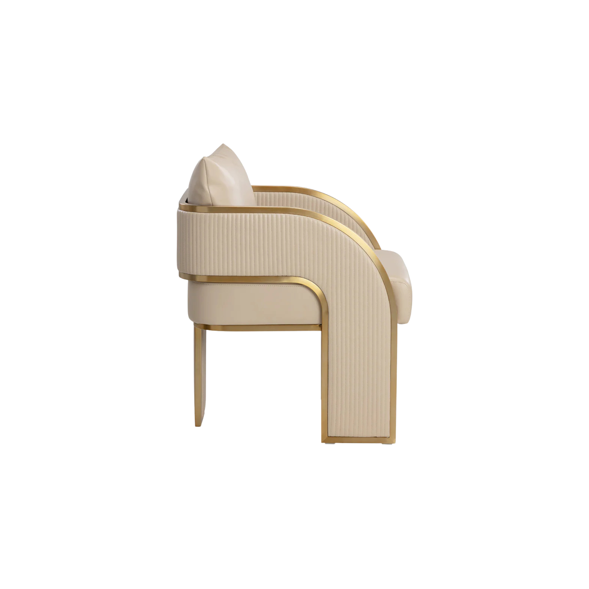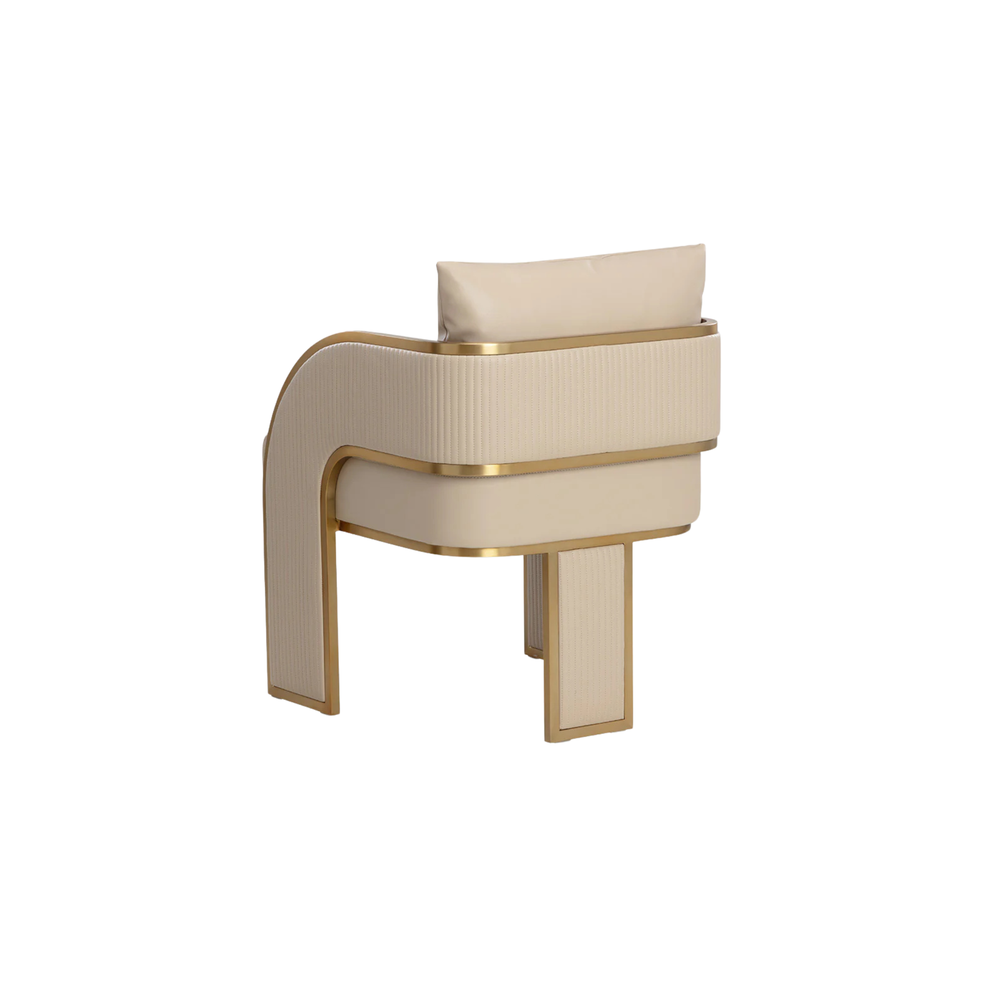 Bold and stylish, the Baz Dining Armchair is sure to turn heads. Featuring a daring silhouette upholstered in napa beige faux leather. Gold stainless steel detailing and channel stitching add depth and visual impact to the overall look of the piece.