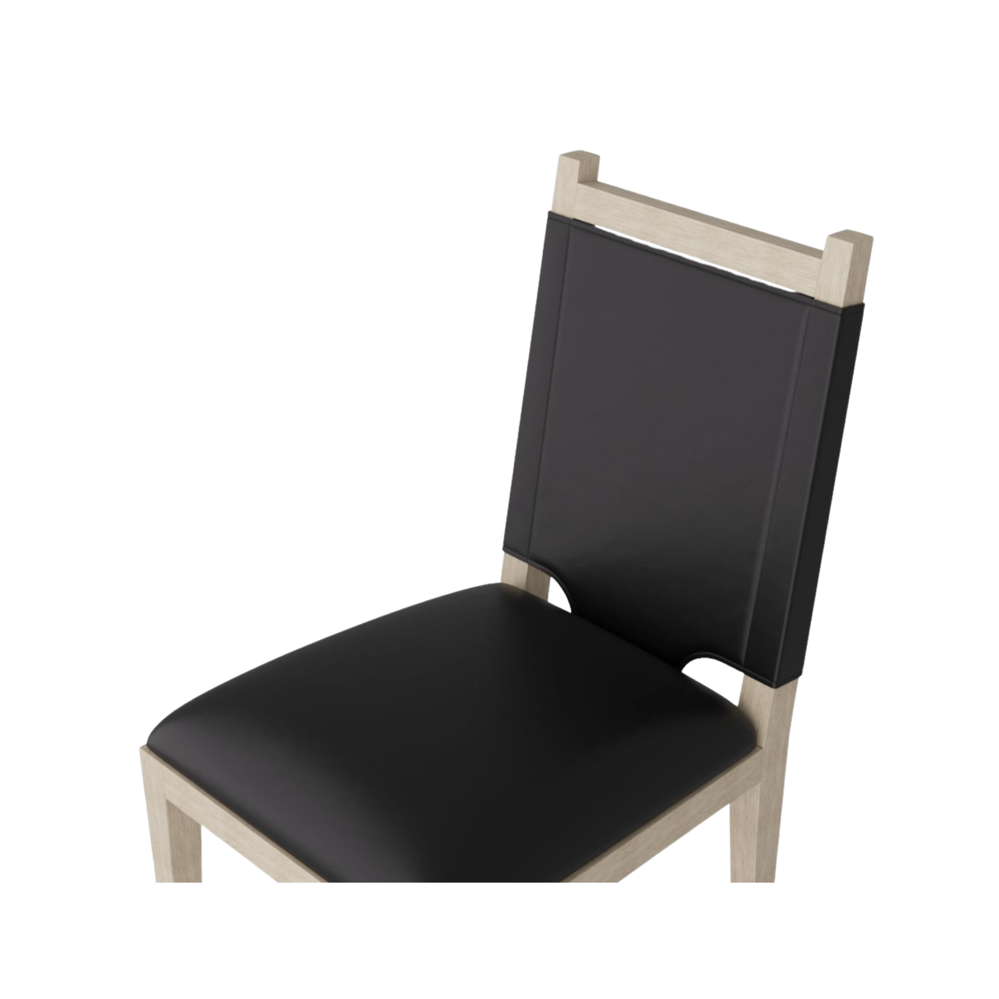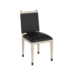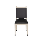 Crafted of luxurious vanilla leather and ebony-finished beechwood or black leather and smoke finished beechwood, this sophisticated design possesses a crisp, geometric silhouette. A T-shaped sling-back balances the impeccably upholstered seat, providing comfort and support. Each square leg is capped in antique brass sabots. Leather will vary.