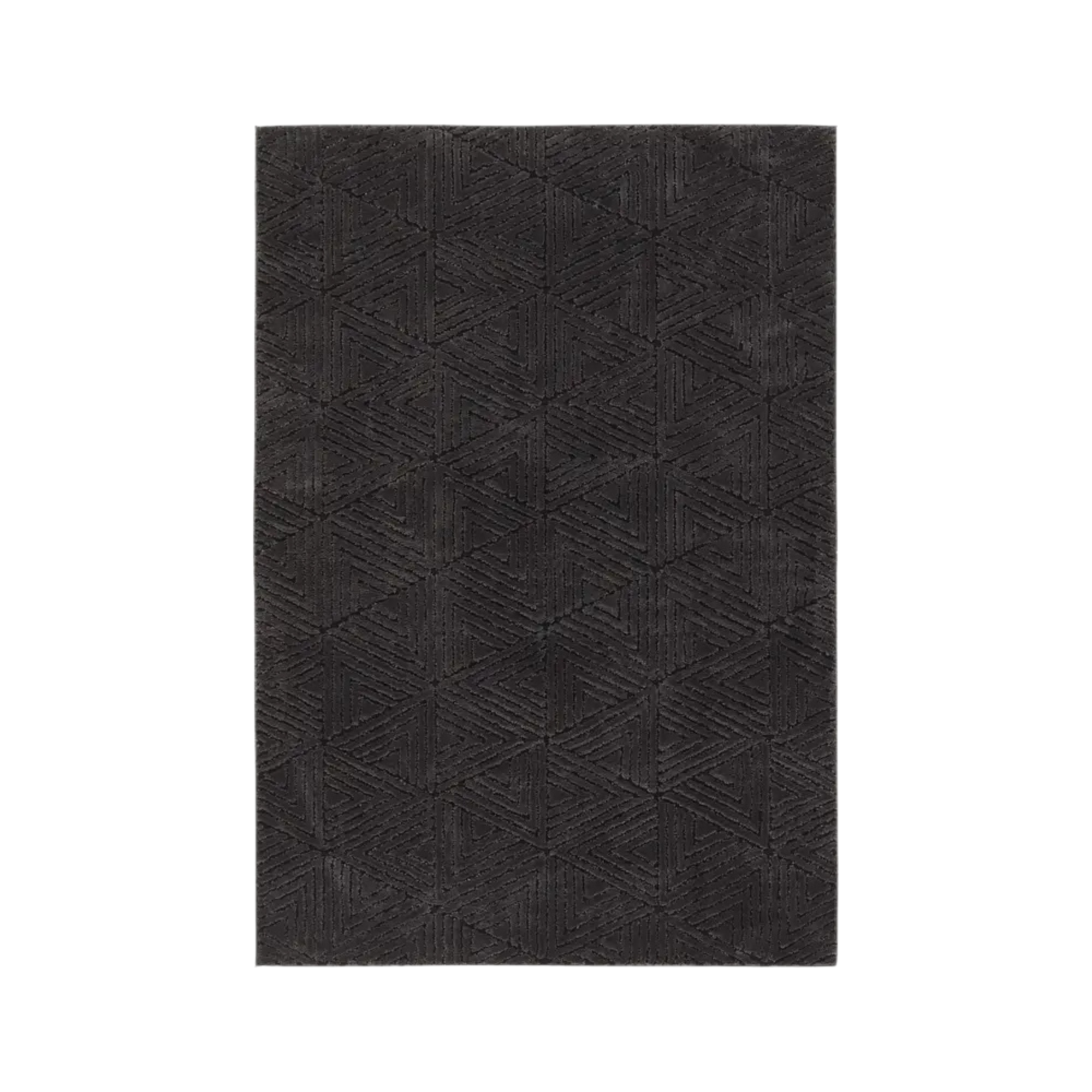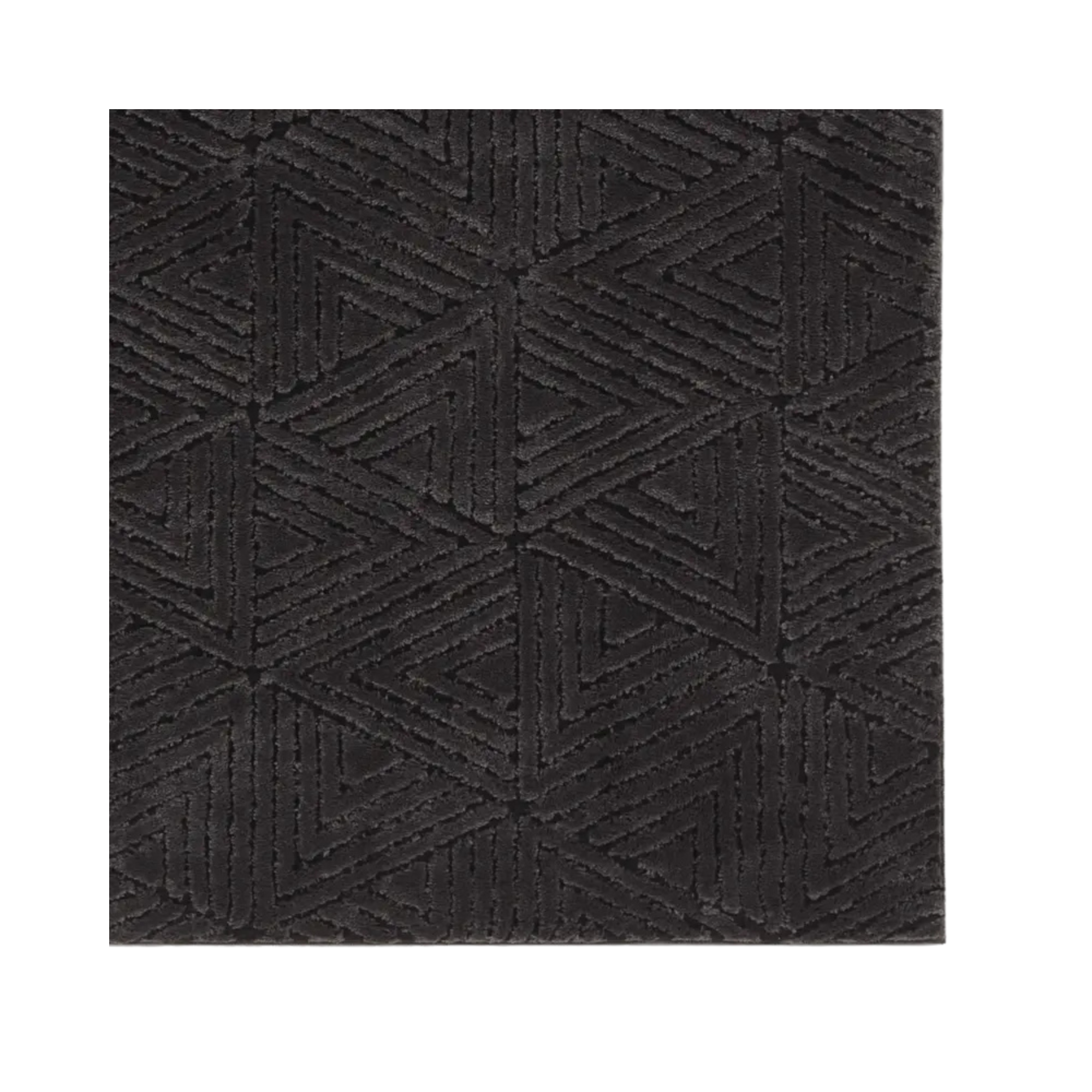 Modern geometrics and a lustrous sheen define the Calix Collection by Nikki Chu. The soft, plush pile features high and low areas for added texture that delights underfoot. The Ziazan design showcases a black, geometric, triangle pattern. Polypropylene and polyester blend provides natural stain resistance and low maintenance care. This rug best suits medium-traffic spaces of the home, such as living rooms, bedrooms, and dining rooms.