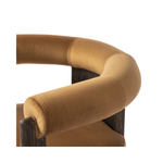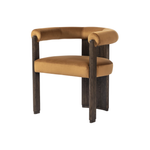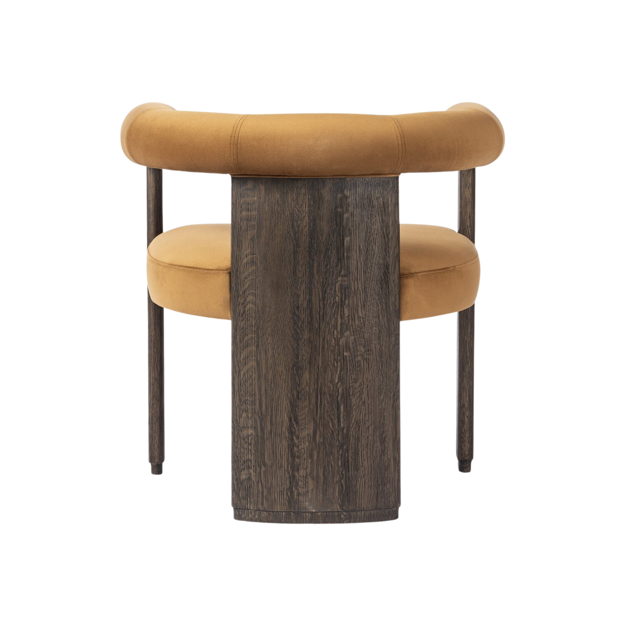 For a confident mix of soft curves and clean lines, this three-leg dining chair pairs a solid oak frame and low barrel back with rich, rust-colored upholstery.