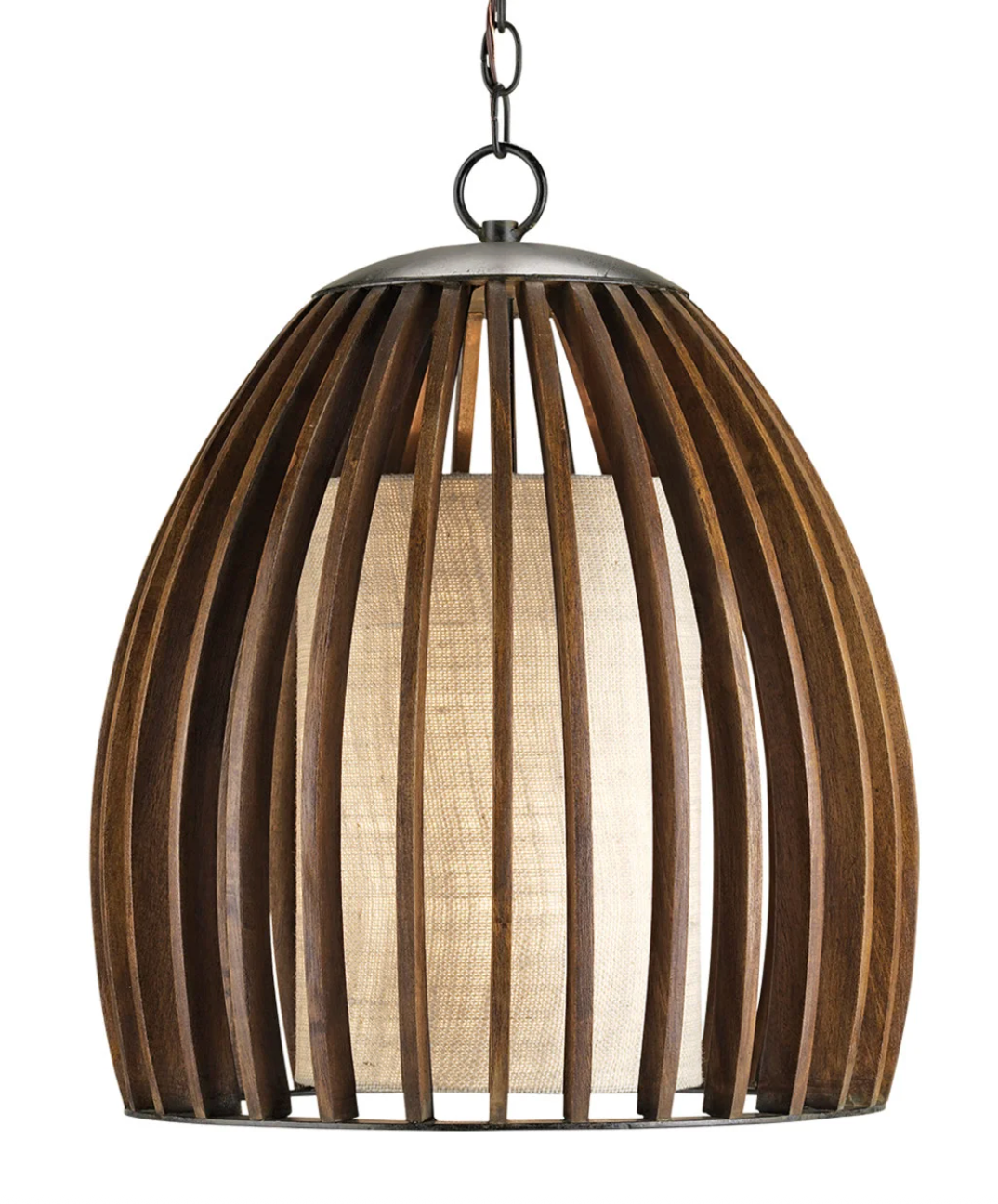 The dome-shaped Carling Pendant flaunts a mid-century modern aesthetic. The cage of its body is made of softly curved vertical slats in a gleaming polished fruitwood finish. The wood pendant envelopes a rustic but stylish putty burlap diffuser that softens the fixture's glow.