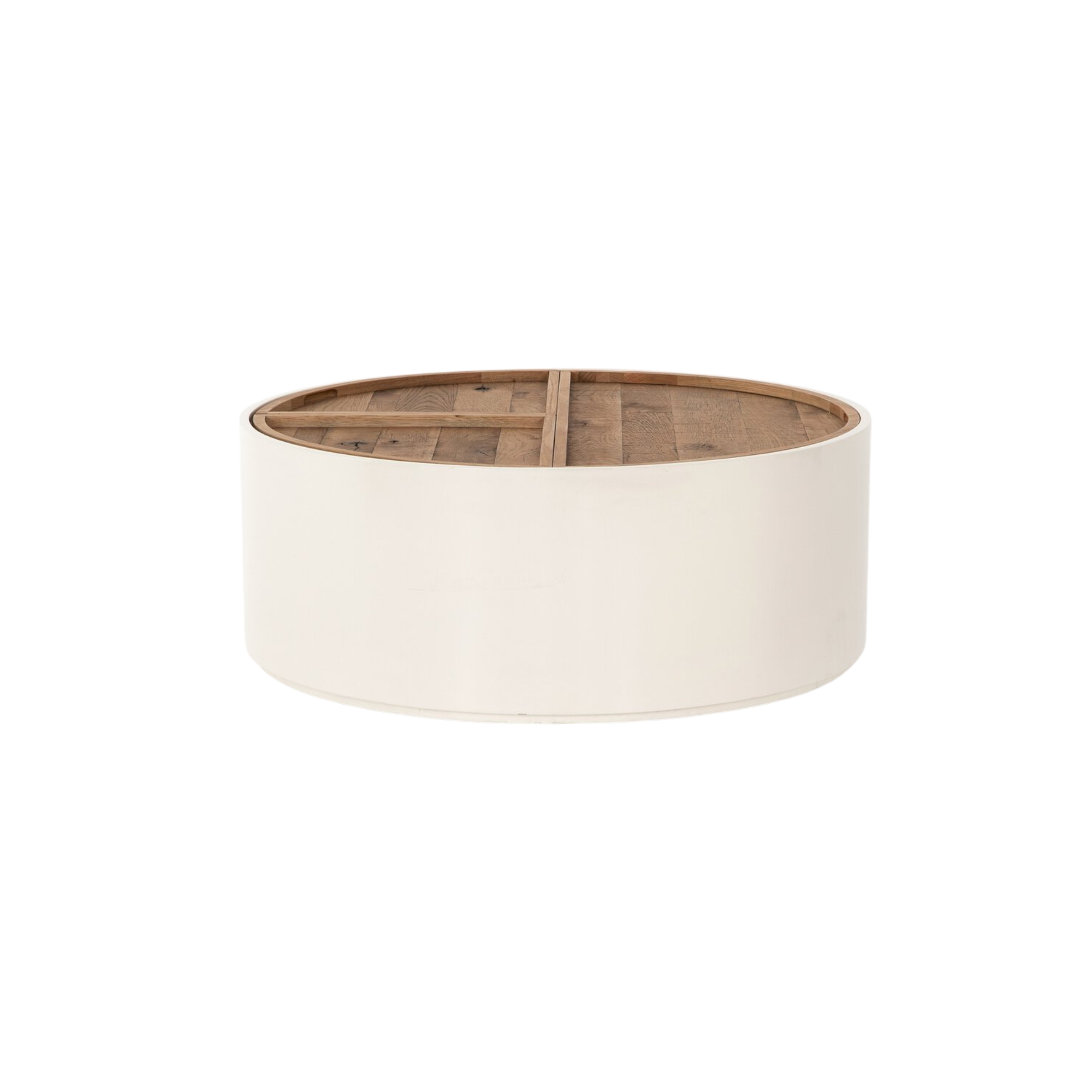 Need storage? The Cassius Drum Coffee Table is here to help. The clean lines of the cream colored drum are accented perfectly by the rustic oak top. The panels that make up the surface feature carved handles, allowing you to remove the top to access the storage area below.