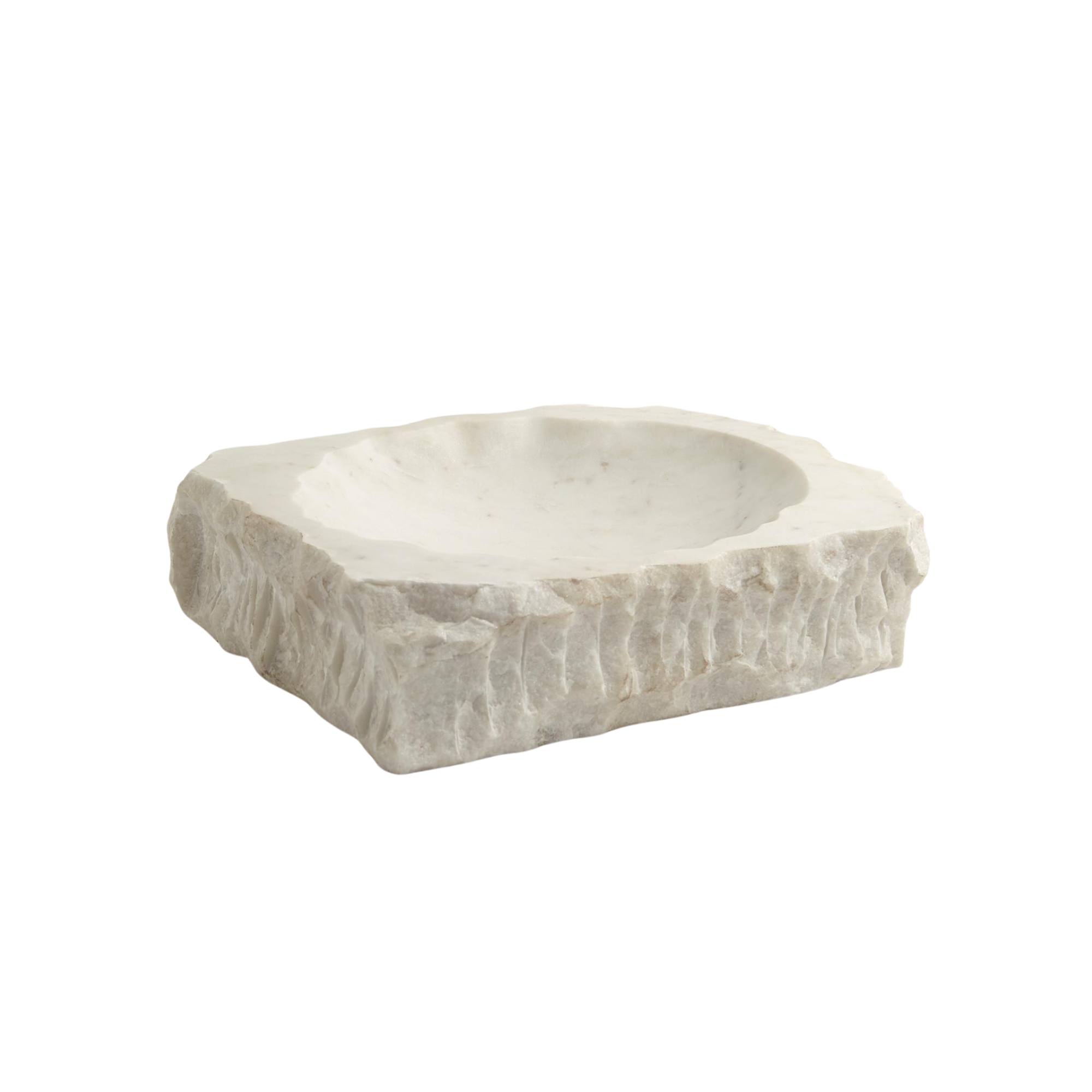 Carved from a solid block of white marble, the Chiseled Block Bowl melds natural texture with refined elegance. Its exterior contrasts beautifully with the smooth, carved indentation, making it a striking centerpiece for any space.