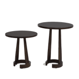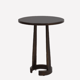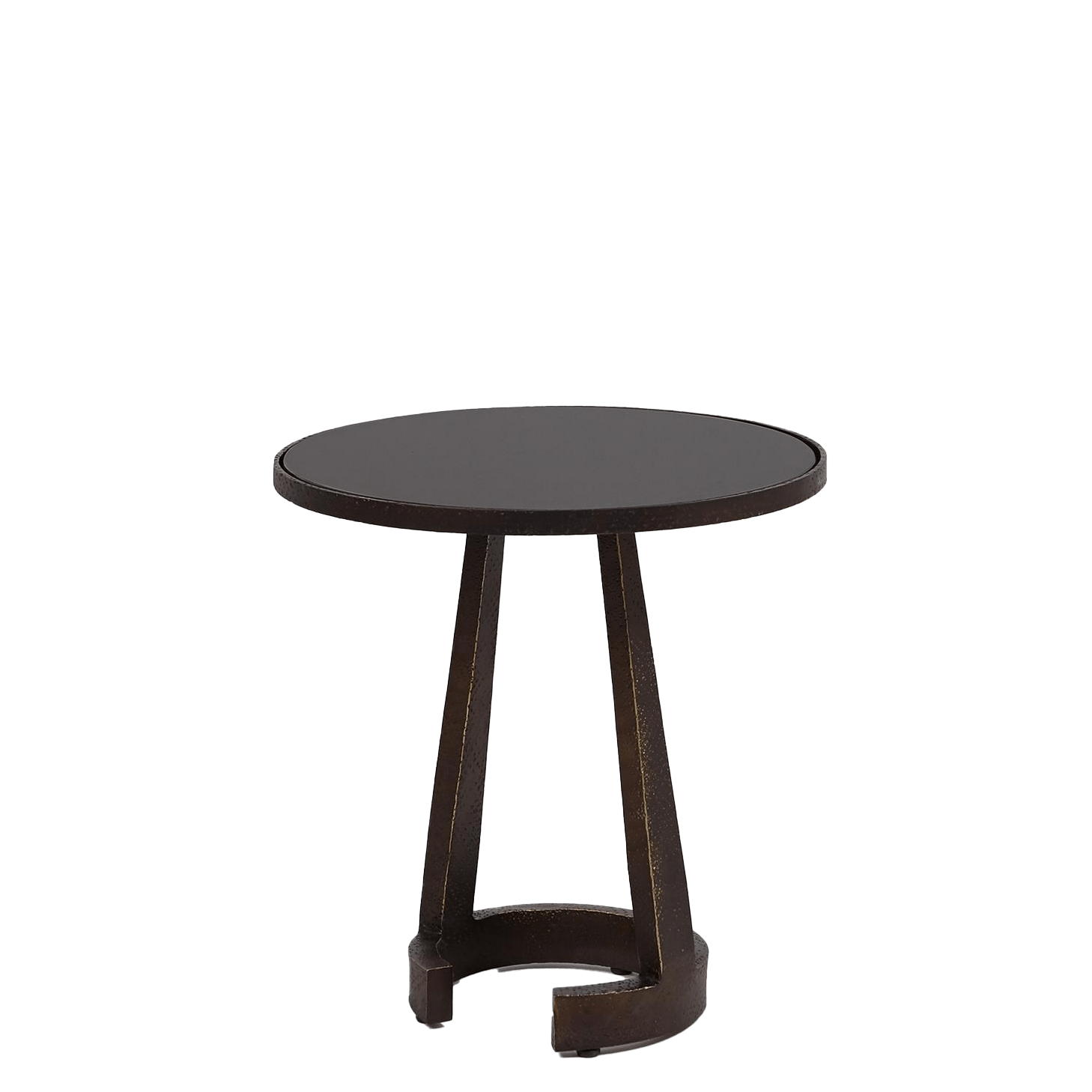 Hammered legs with a bronze finish and a black marble top. The legs connect to the base shaped like a "C". Made in India.