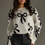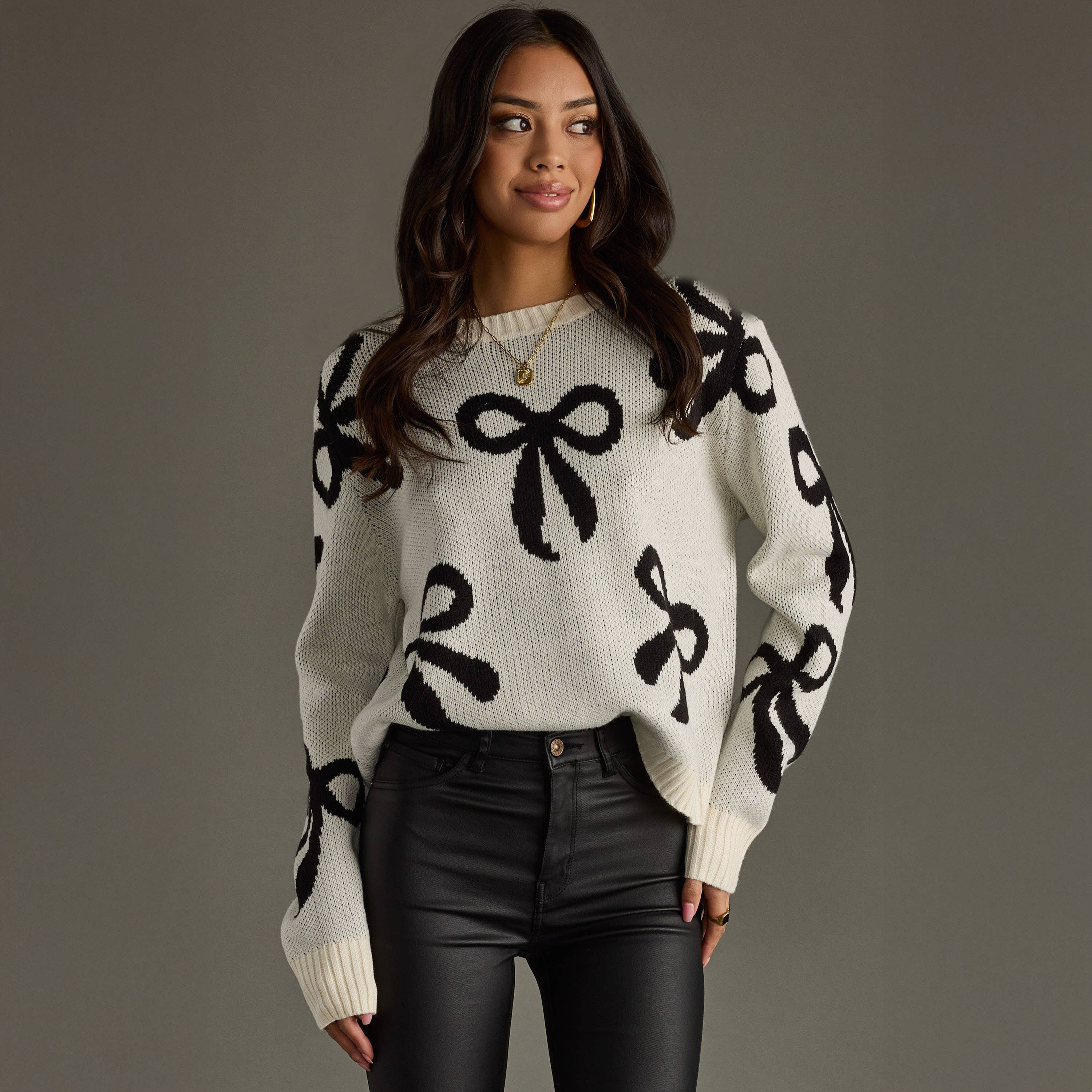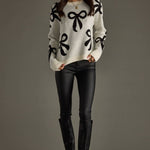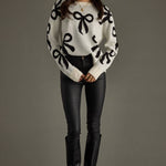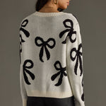 This cream-colored sweater features a black bow motif on both the front and back. Crafted entirely from 100% acrylic yarn, it offers both comfort and style.