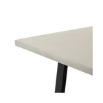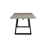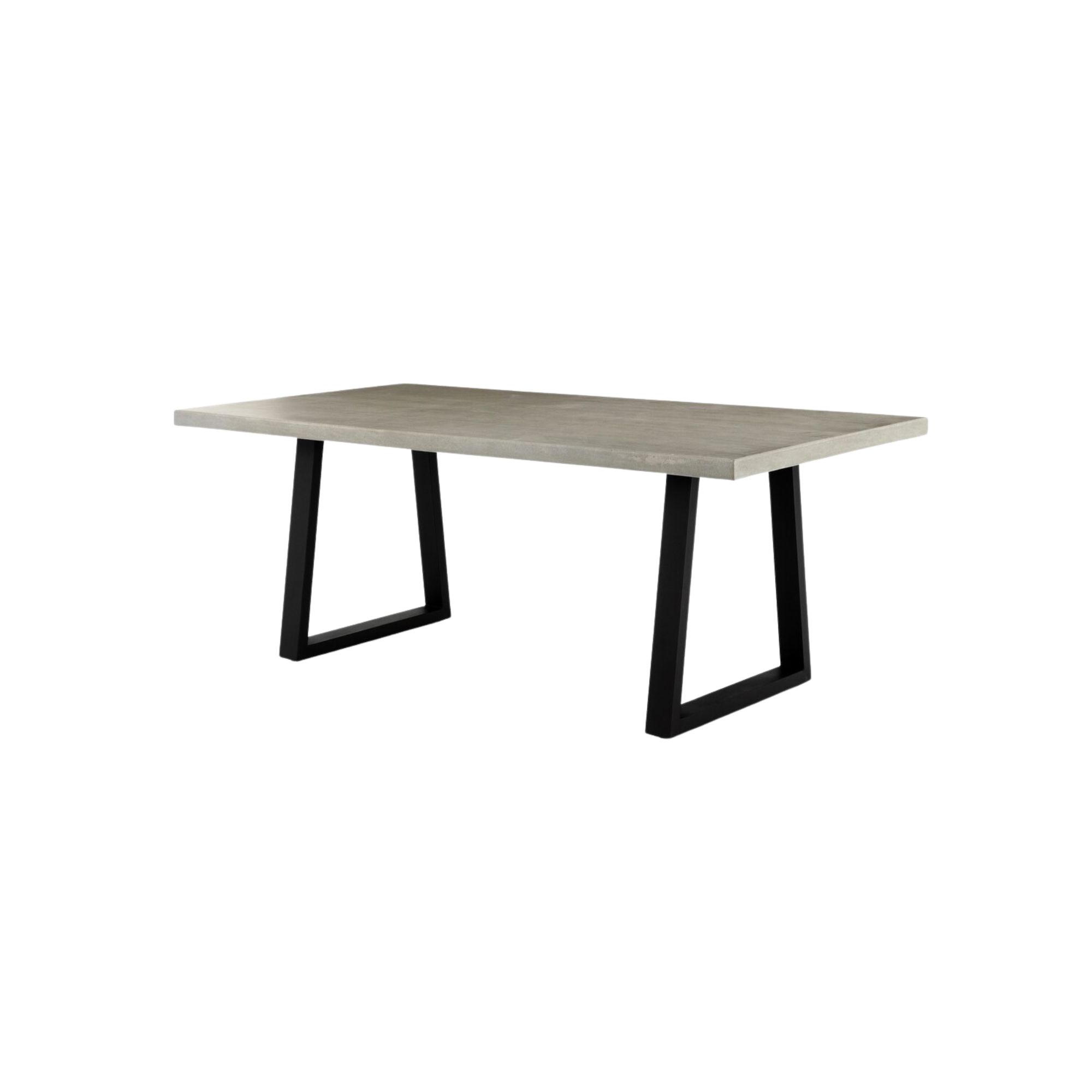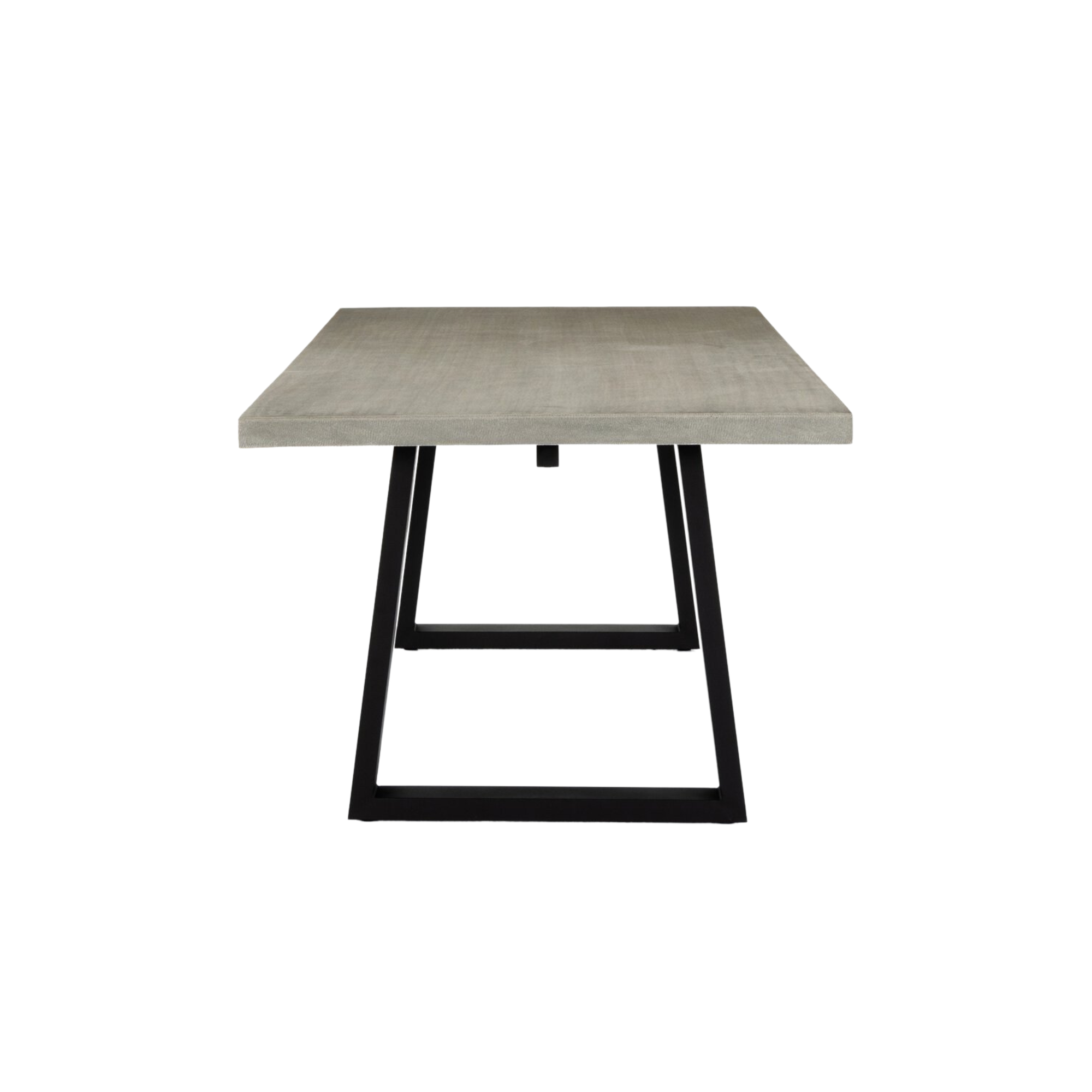 A strikingly simple poly-resin top derived from river sand is polished to a smooth sheen, while an angular black iron base adds architectural appeal to this outdoor-friendly dining table. Slight color variance is to be expected, and speaks to lava stone's organic nature. Cover or store indoors during inclement weather and when not in use.