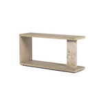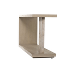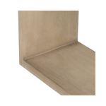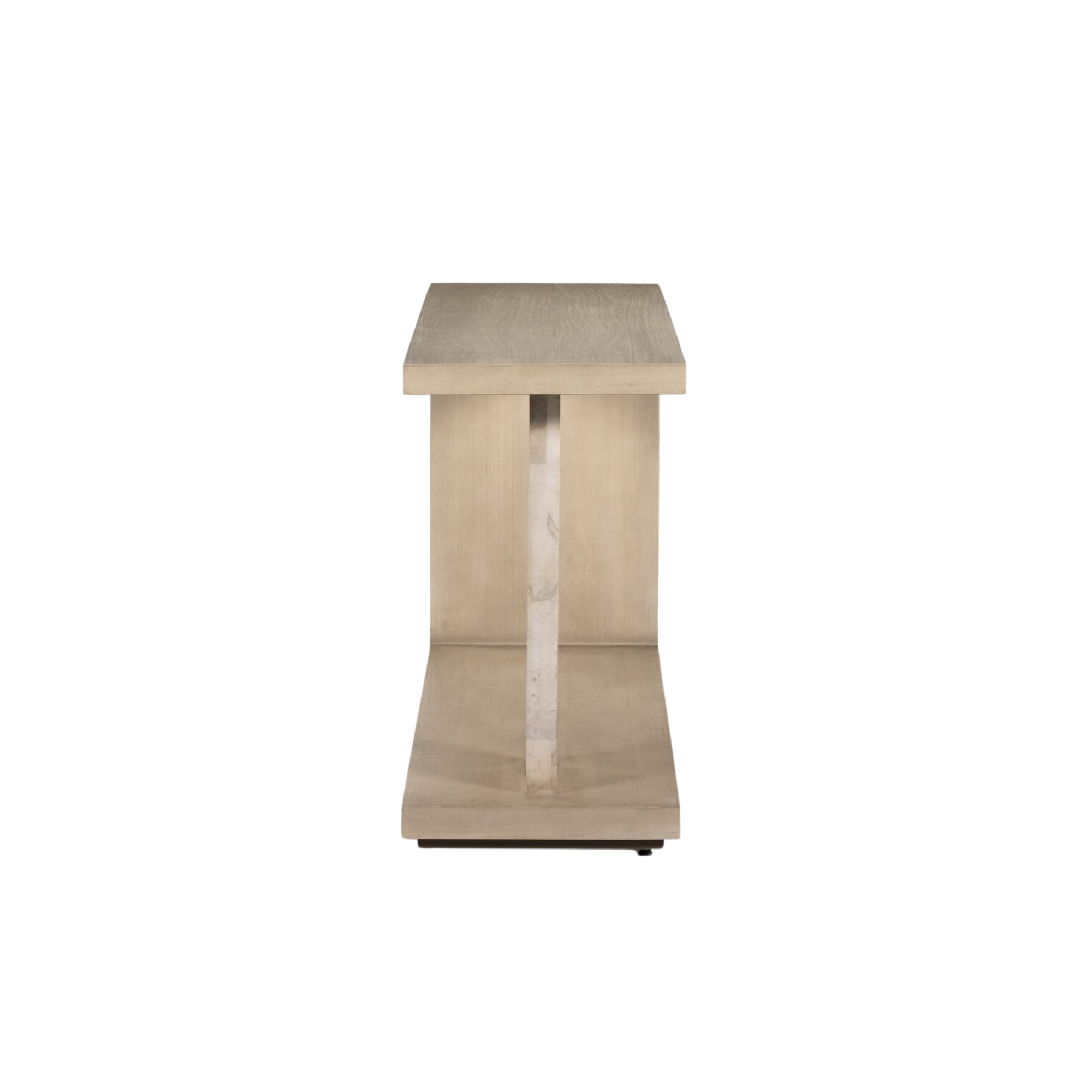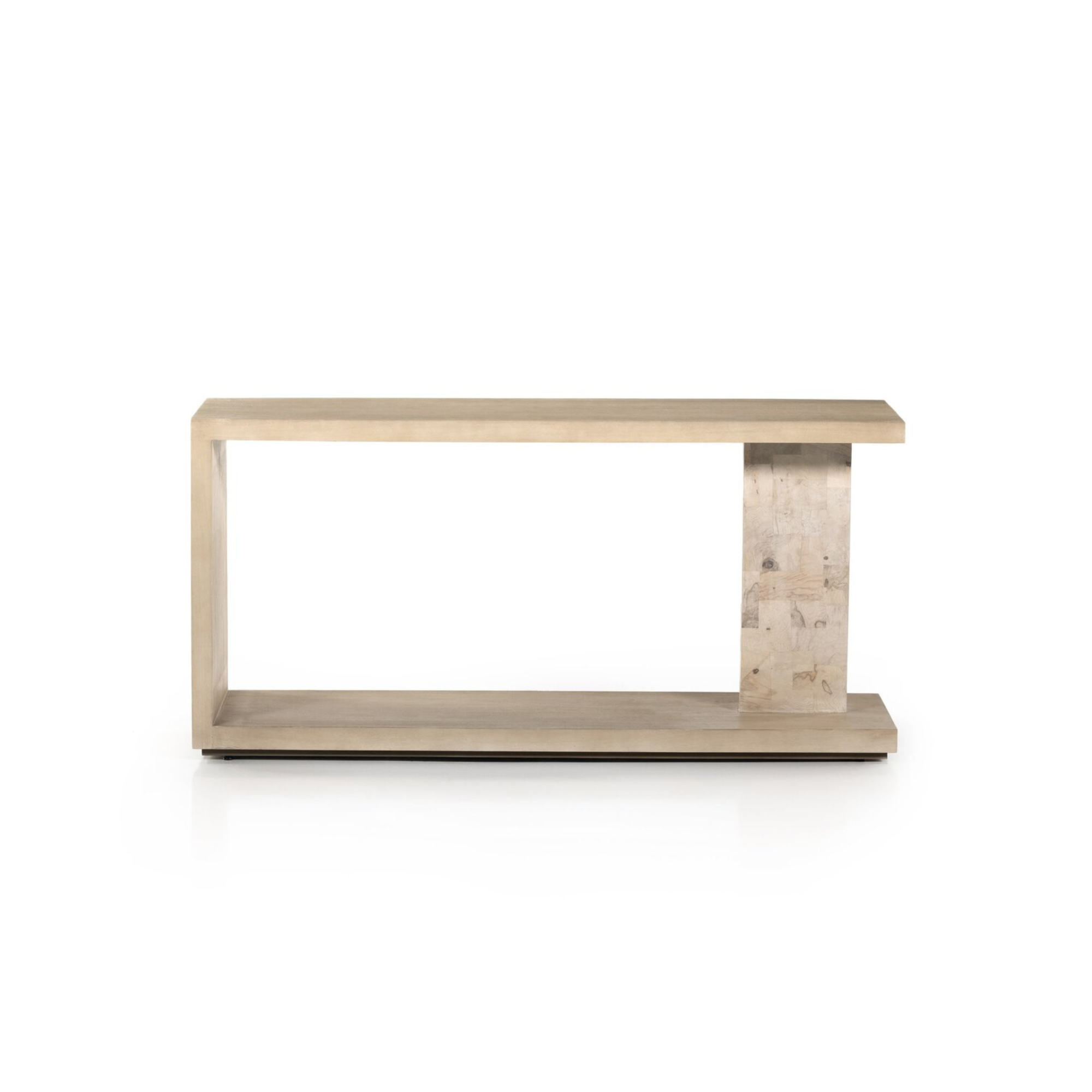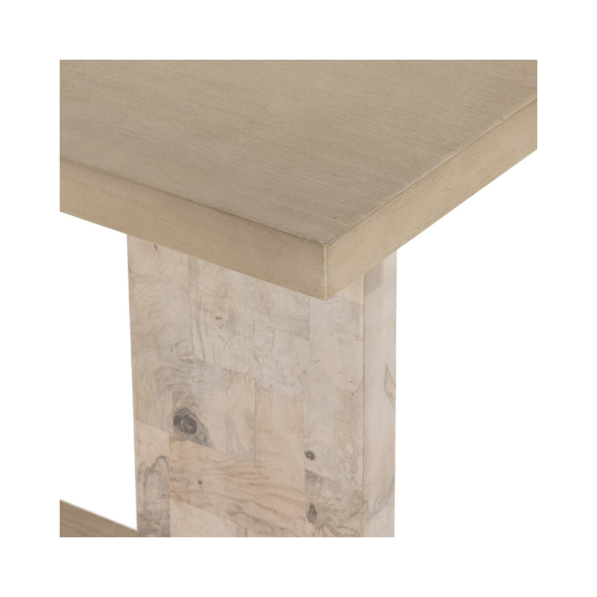 Minimalist gone modern. White-finished mahogany forms a cantilever-like C shape, while an accent leg of bleached ash burl veneer speaks subtly to Brutalist inspiration. Color variance in sun-bleached finishes is expected and reflects woods' naturally unique character.