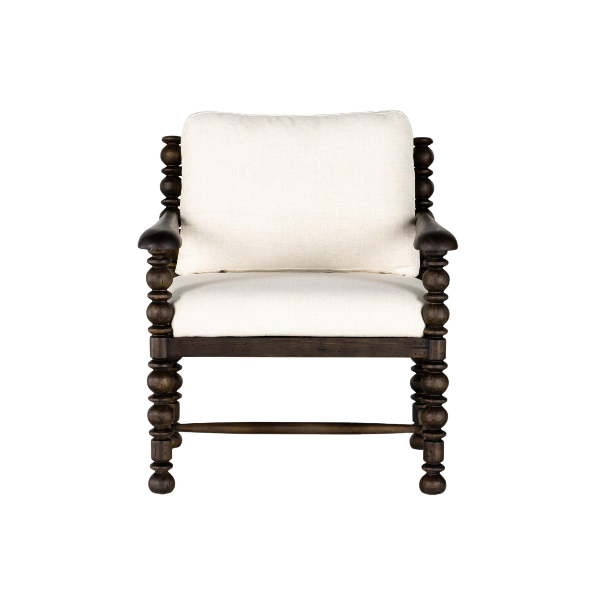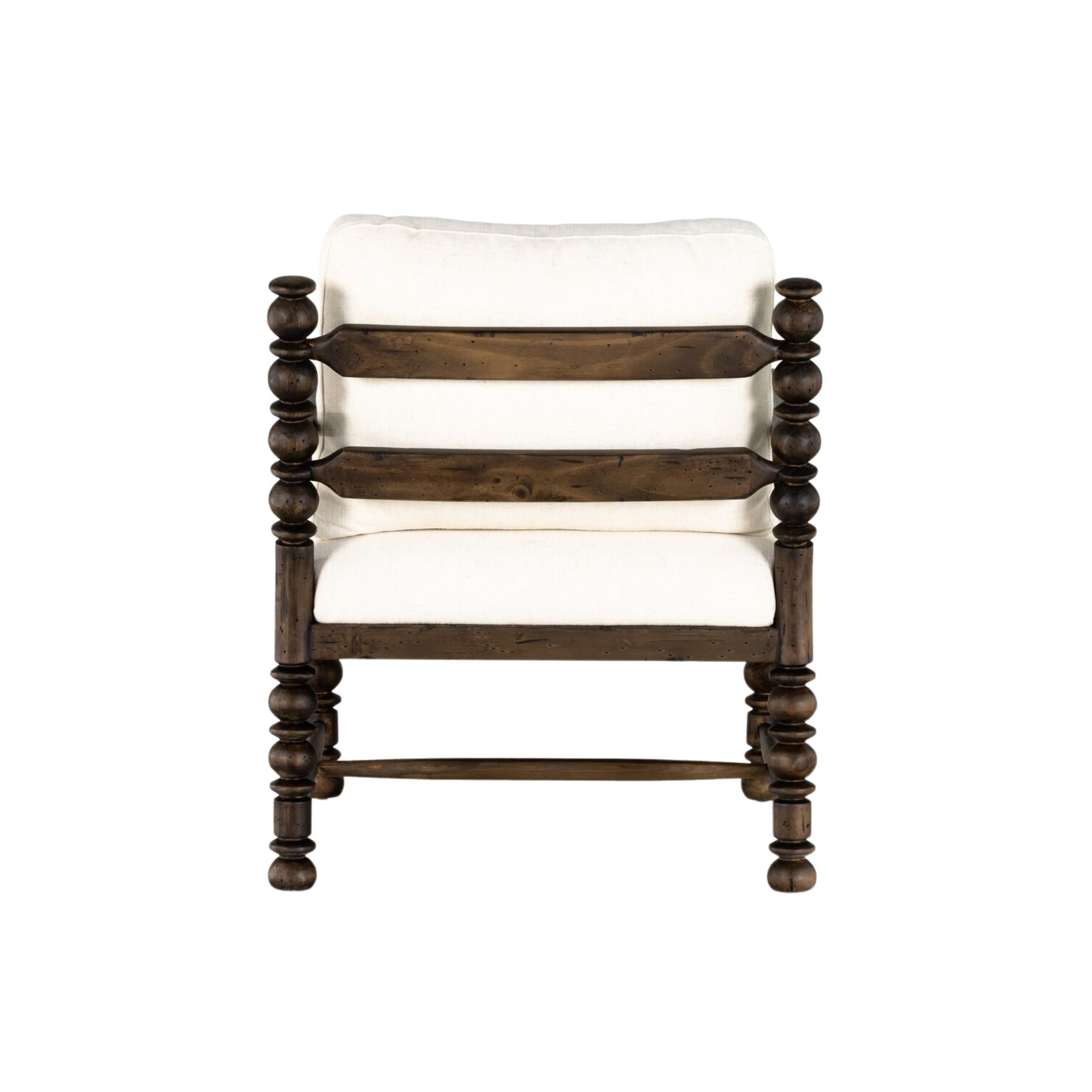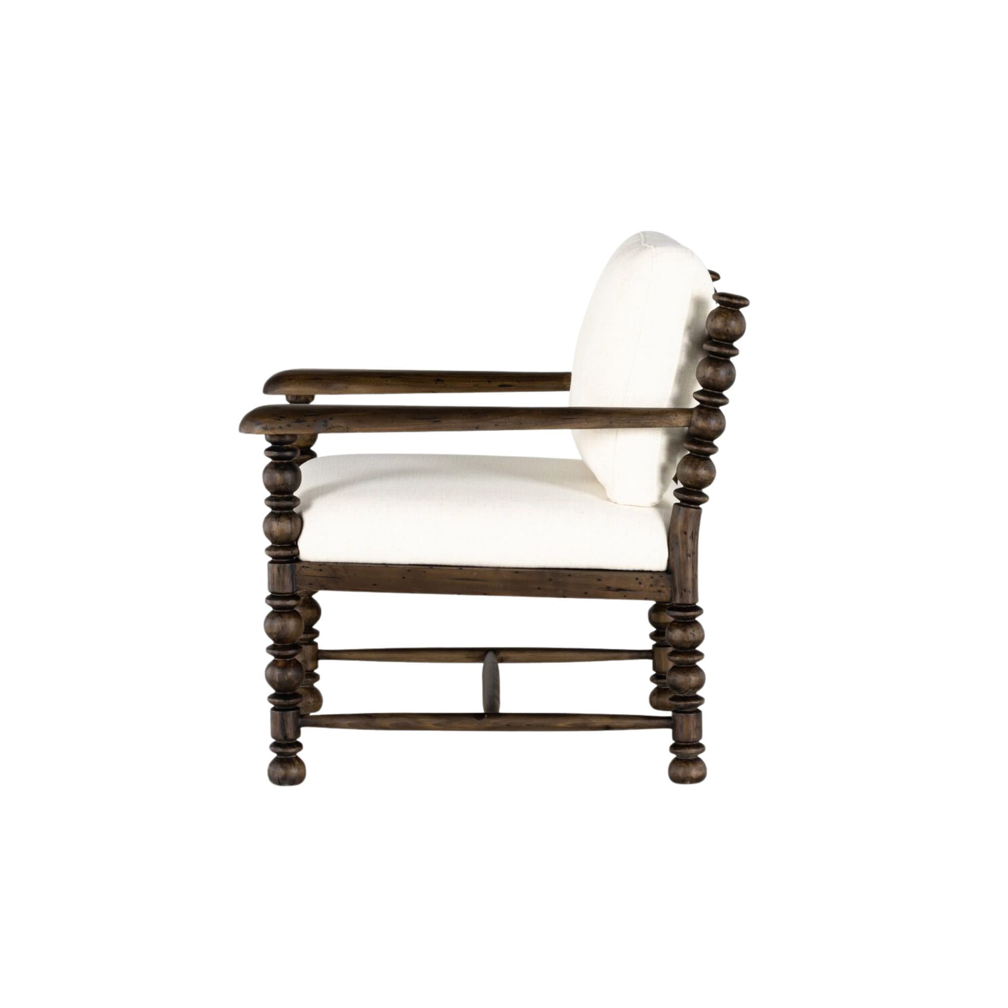 Inspired by traditional Welsh furnishings and designed and crafted to look like an heirloom. This eye-catching chair features traditional bobbin legs with an intentional, subtle worn finishing. Additional heirloom-inspired details include spindle stretchers below and rounded paddle arms that conform to the palm of the hand. Feather-blend seat cushioning and loose back cushion are upholstered in a clean linen performance fabric. Performance fabrics are specially created to withstand spills, stains, high traffic and wear, ensuring long-term comfort and unmatched durability.