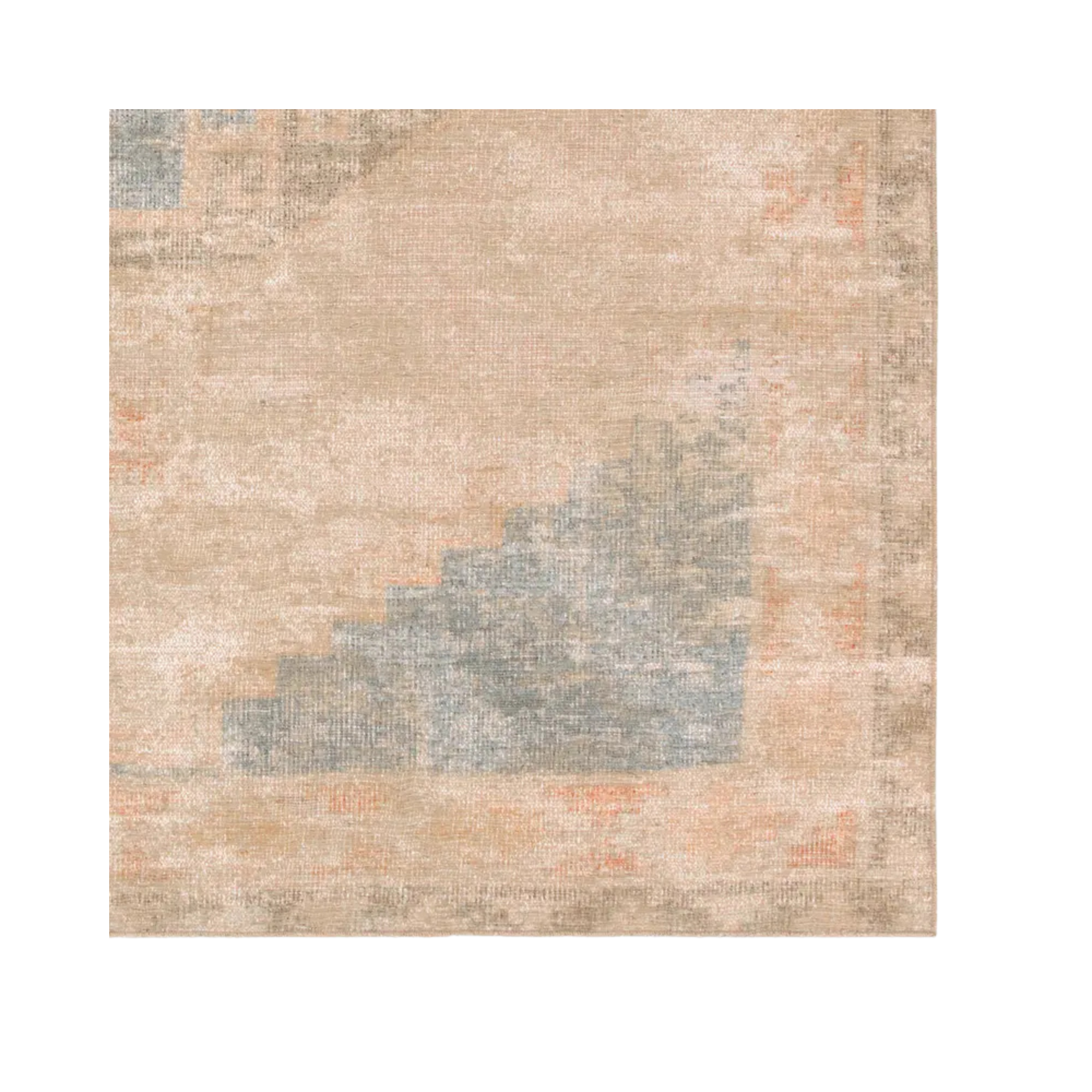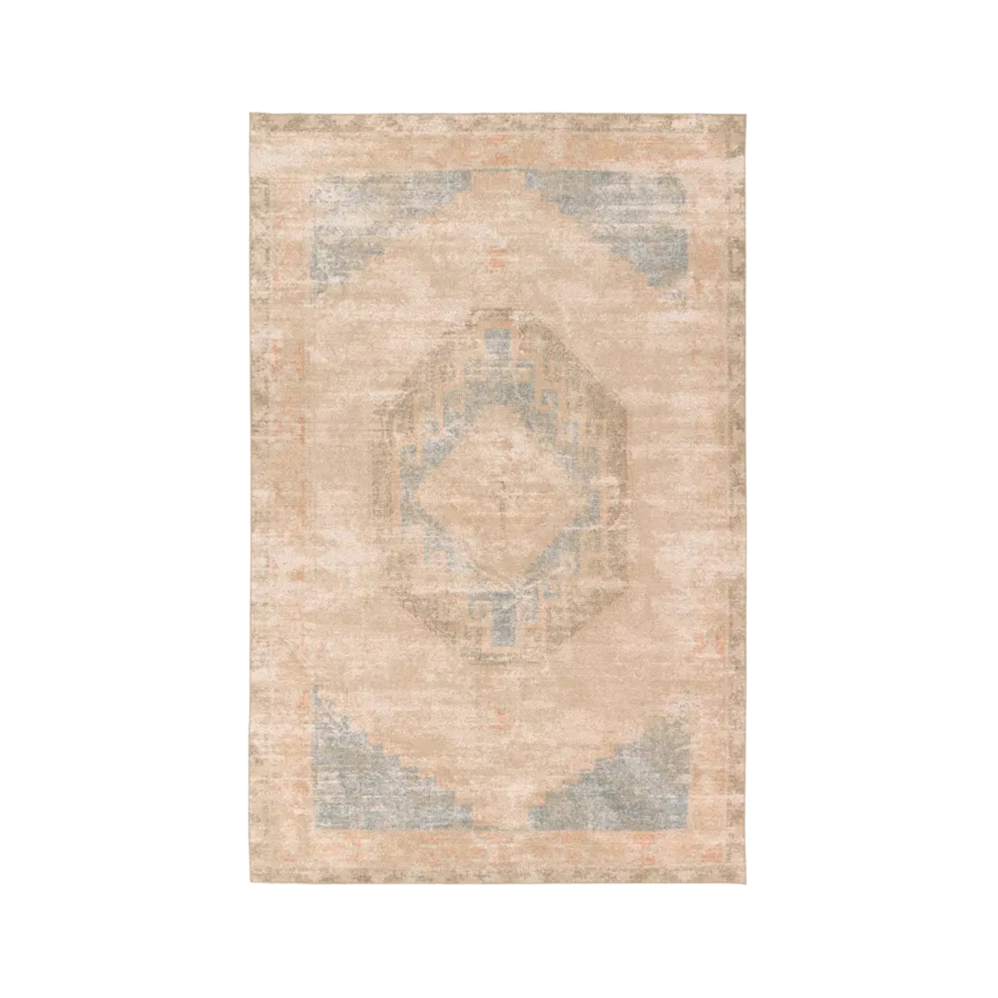 The innovative Edage rug collection showcases distressed, vintage designs, digitally printed onto a jute and polyester base. This process provides effortless texture and natural appeal through the jute weave, while maintaining an elevated feel through updated traditional patterns. The Kayell design showcases a vintage-inspired, center medallion pattern in hues of tan, blue, brown, and hints of orange. This rug best suits medium to low traffic spaces of the home such as formal dining areas, bedrooms, formal dining areas, and sitting rooms.