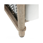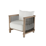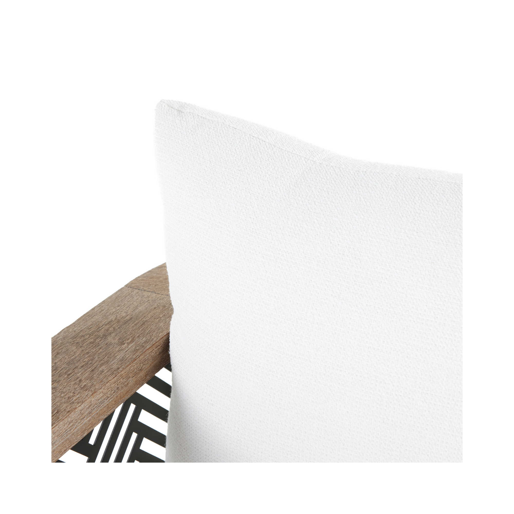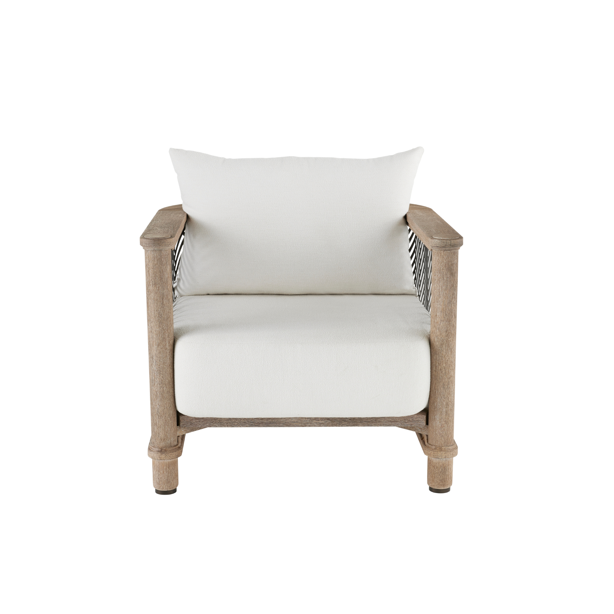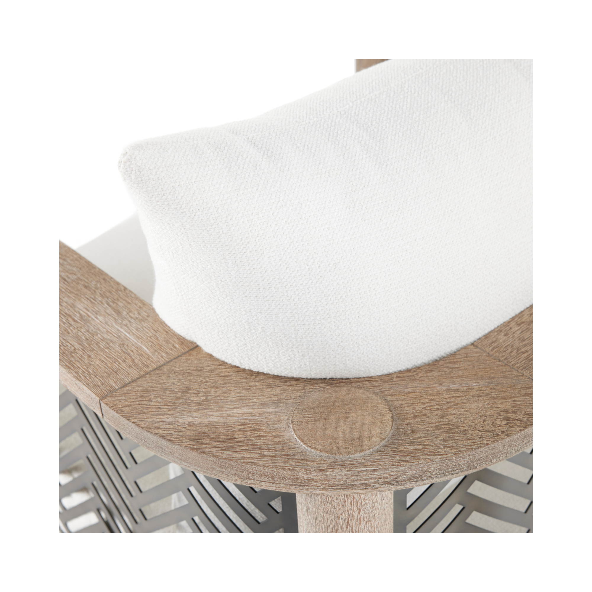 The Emoto Outdoor Chair combines durable teak wood with herringbone accents inspired by classic menswear textiles. Its bronze perforated side panels and slender dowel legs add unique detail, making it a distinguished addition to any outdoor space. The seat and back cushions feature element-resistant outdoor performance bouclé, ensuring comfort and resilience in various weather conditions. Finish will vary.