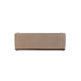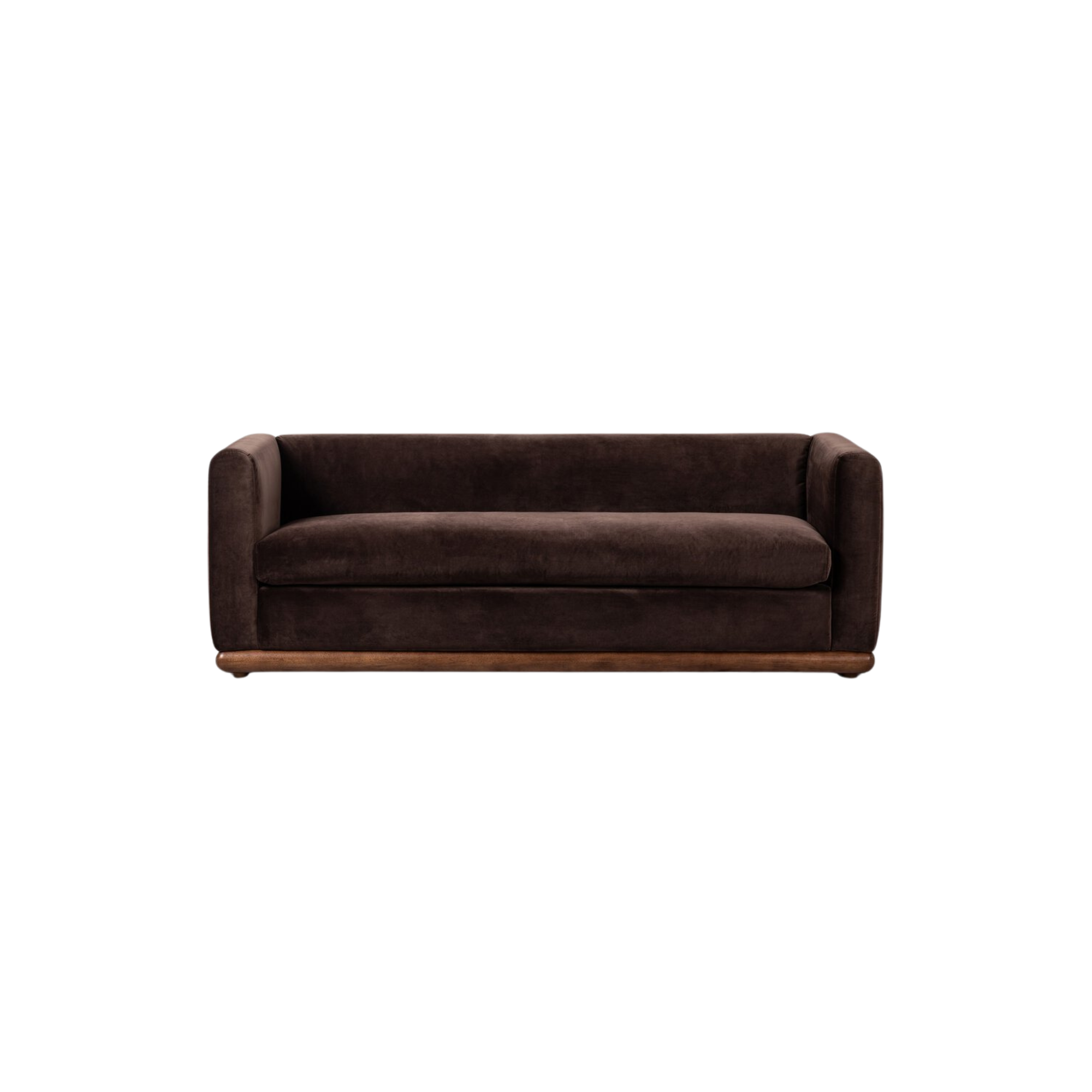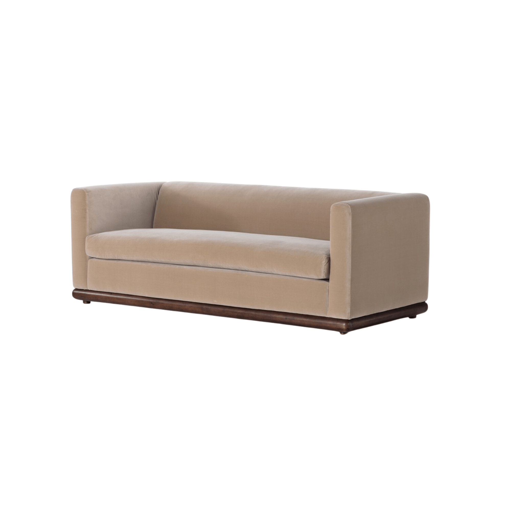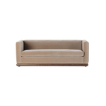 Art Deco gone modern. Velvety taupe upholstery and parawood plinth base fuse for a fresh take on elegant '30s- and '40s-era design.