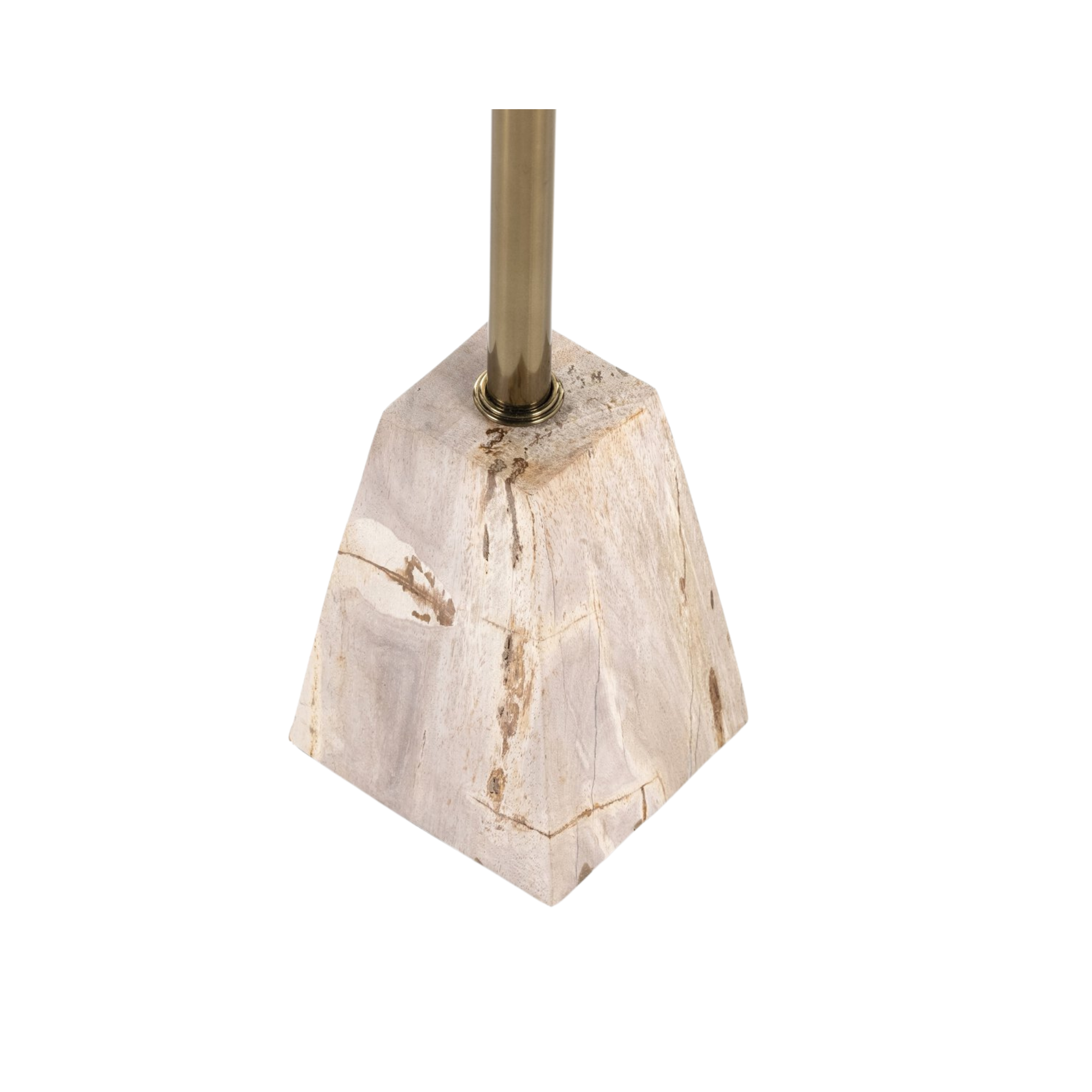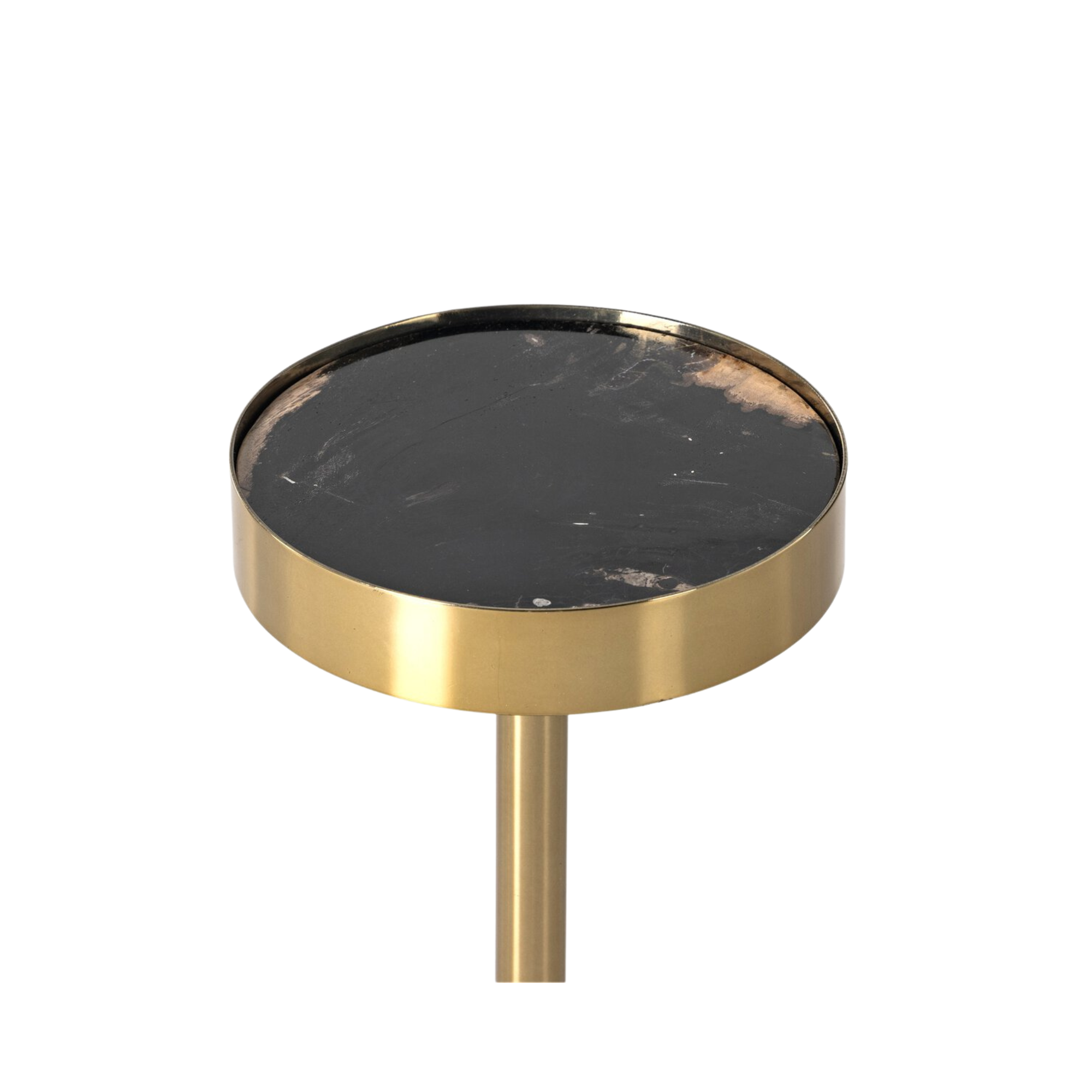 Marble? Better. Petrified wood. This stunning end table features a beautiful dark or light petrified wood, accented with the shine of brass. Perfect for the after work Gibson or Manhattan. Cheers!