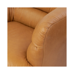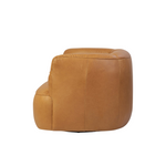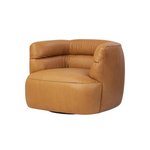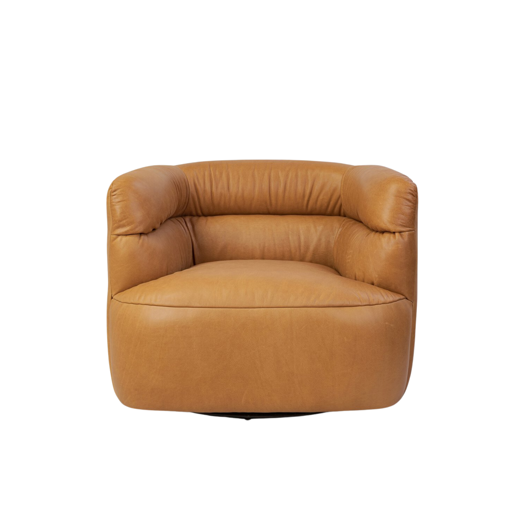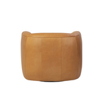 A vintage-inspired swivel chair meets comfort. Upholstered in butterscotch leather, the piece pairs purposely imperfect back channels with S-spring suspension for supportive, comfortable seating. Subtle gathers and folds add character. Upholstered in a soft, supple Brazilian-made leather with subtle texture throughout.