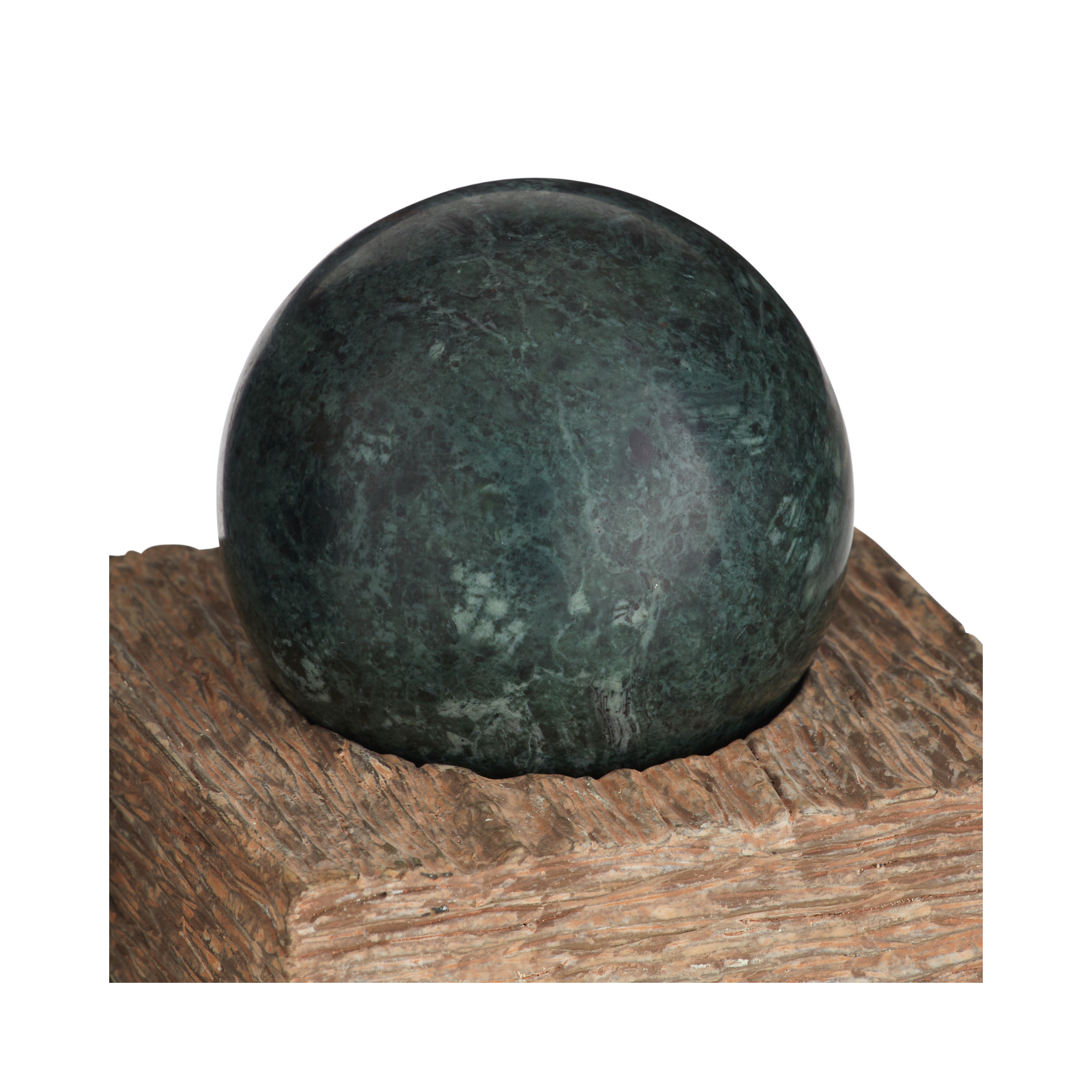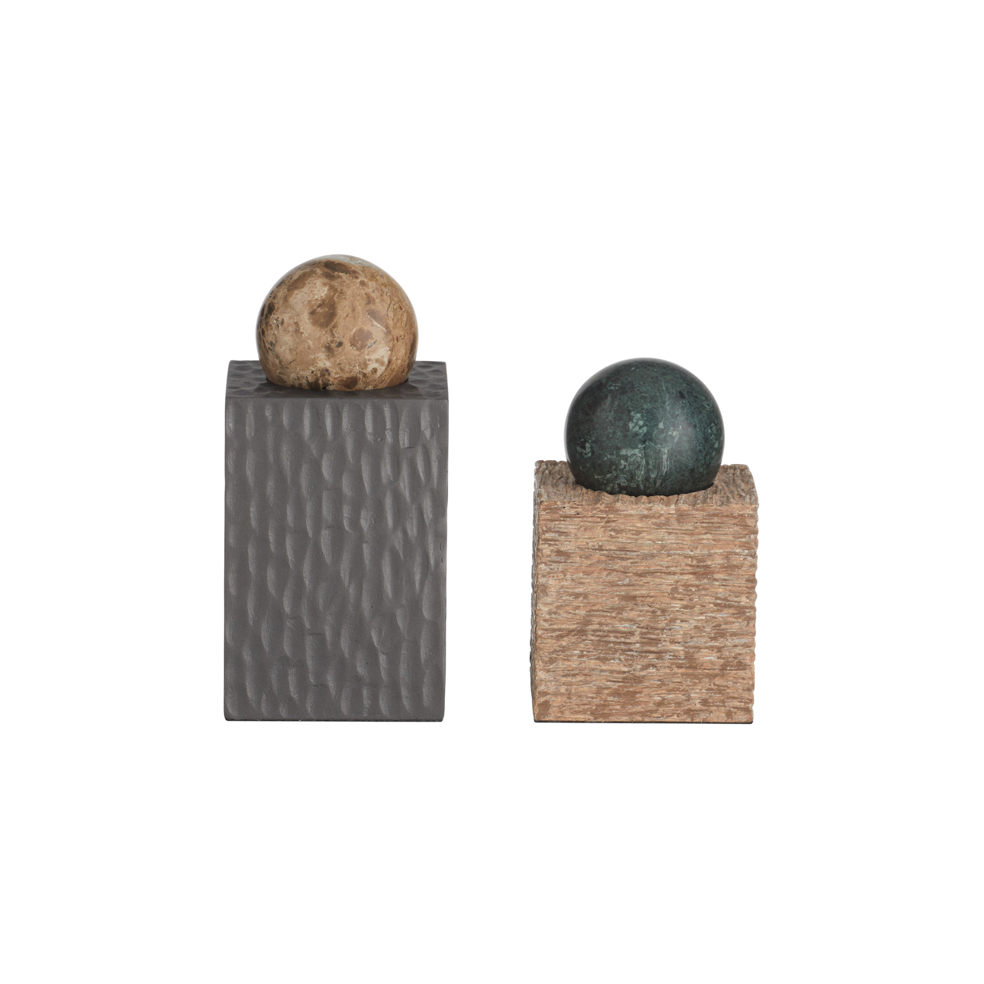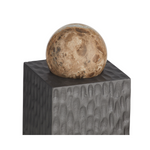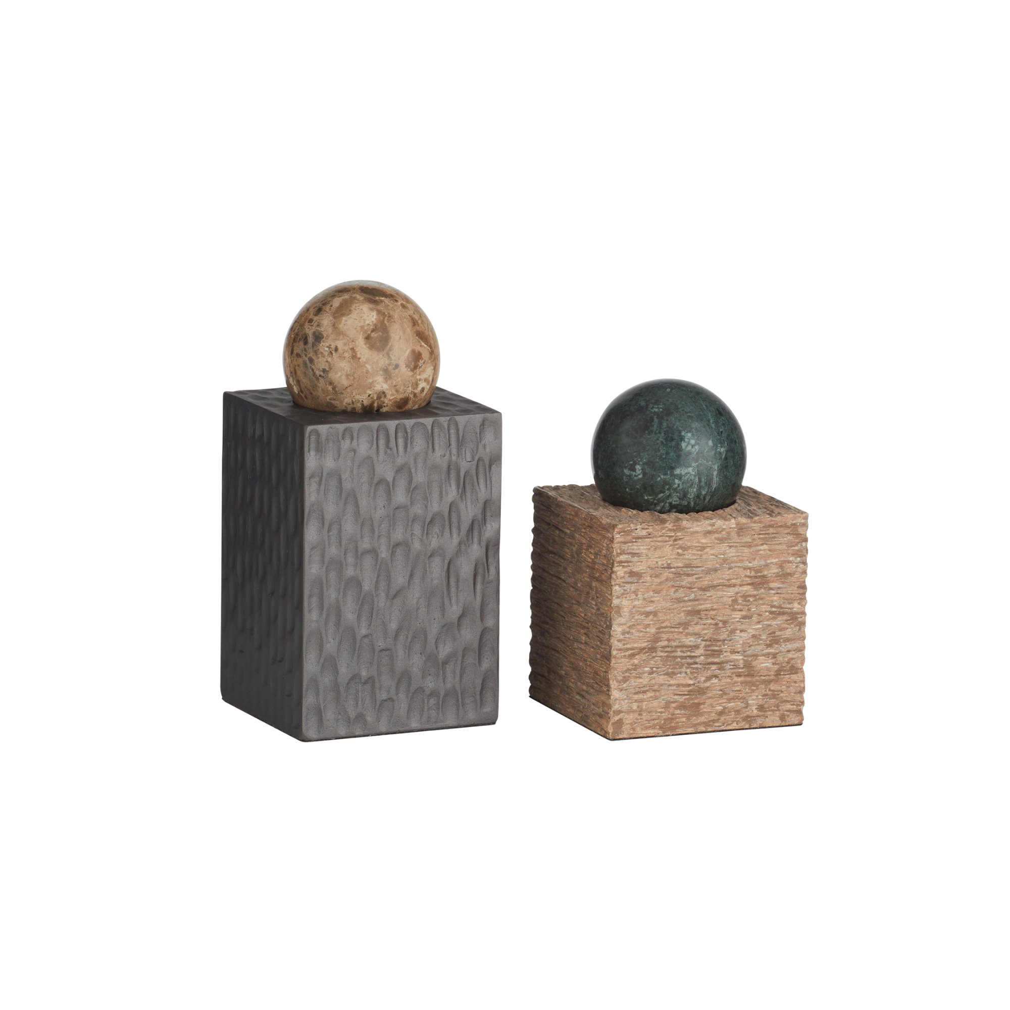 Monolithic resin pedestals of ash brown and graphite tones are the ideal base for this set of mixed-material forms. Textured with daubs and grooves, each sculpture is topped with a polished marble sphere in a contrasting forest or chamois shade. Can double as a stylish storage compartment for small items. Finish will vary.
