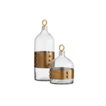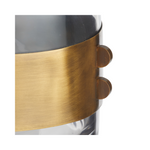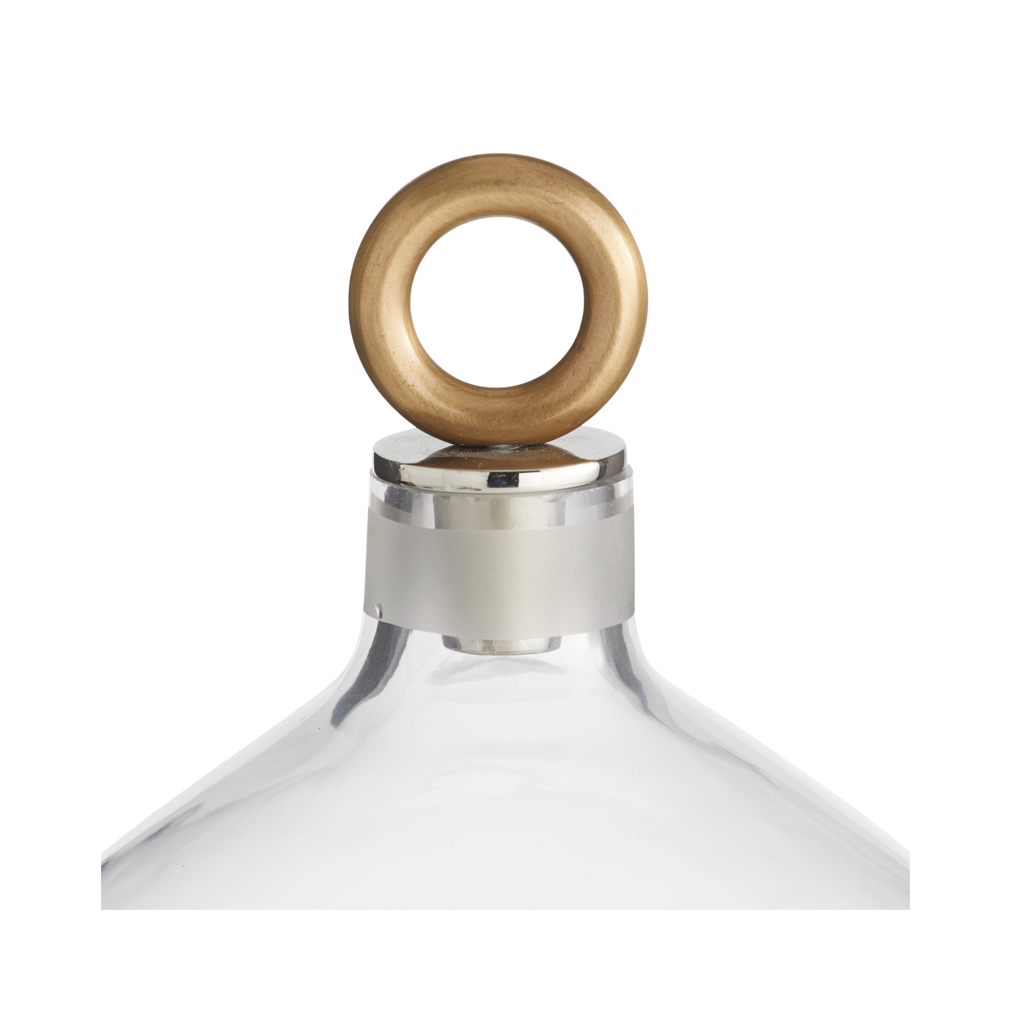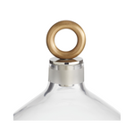Over-scaled decanters of clear leaded glass are encircled with bold studded cuffs of antique brass. Topped with circular stoppers, this growler-shaped duo will lend an industrial edge to any bar.