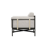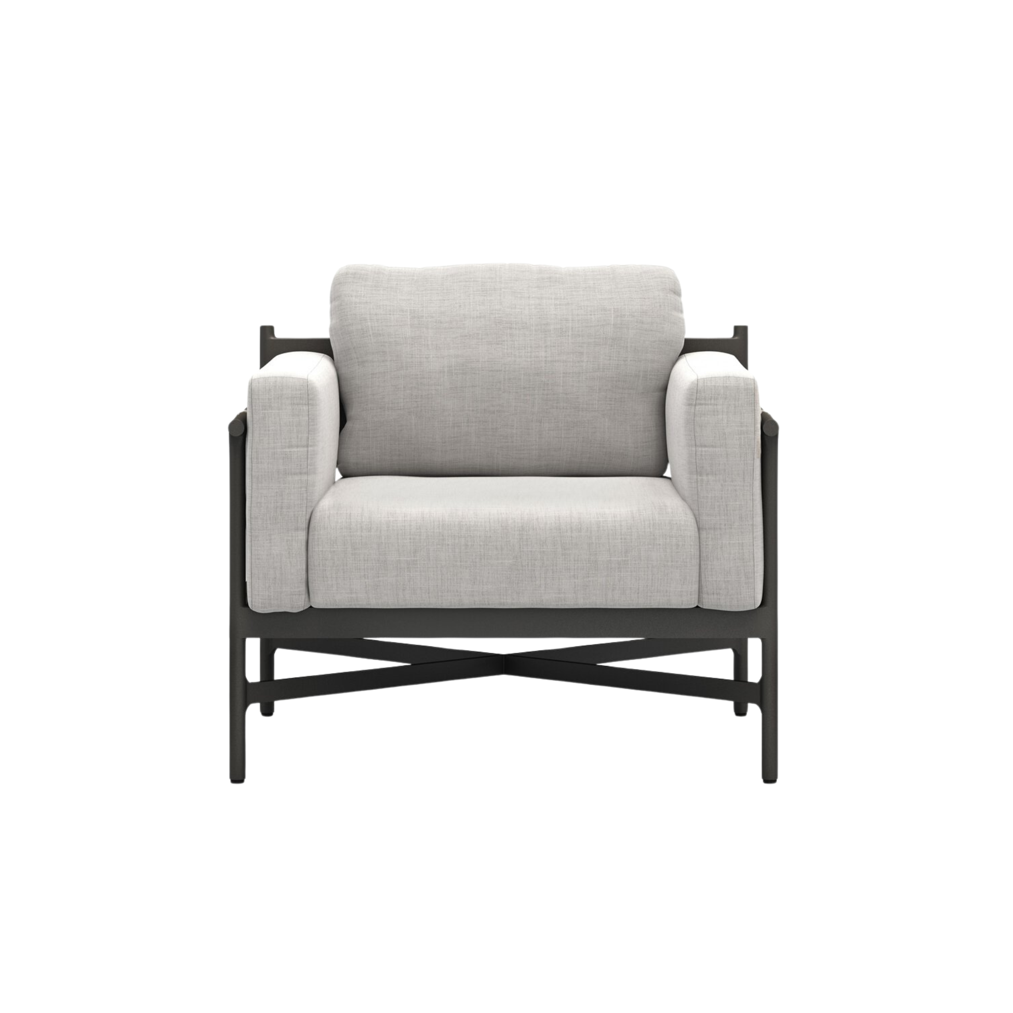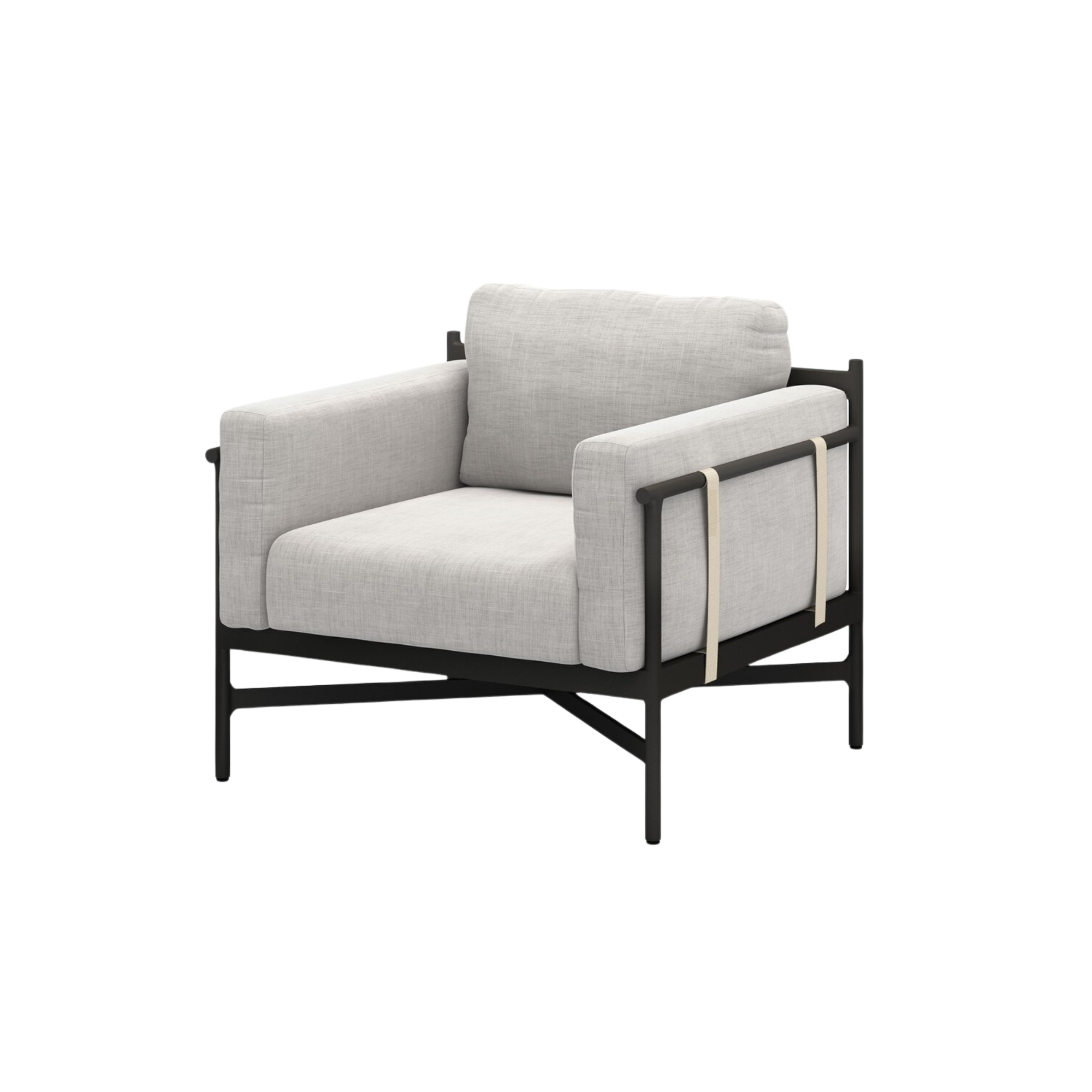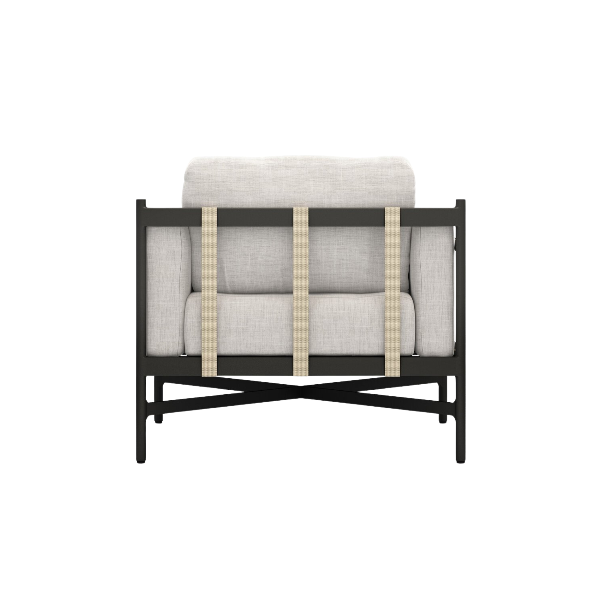 Play up proportions. Dark bronze-finished aluminum provides an airy frame for lushly comfortable seating in a stone grey. Ivory strapping adds a detail-driven finishing touch. Cover or store indoors during inclement weather and when not in use.