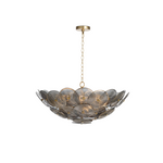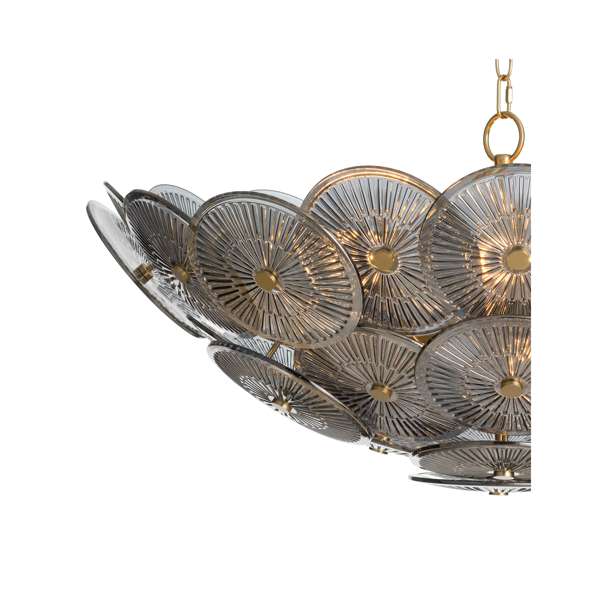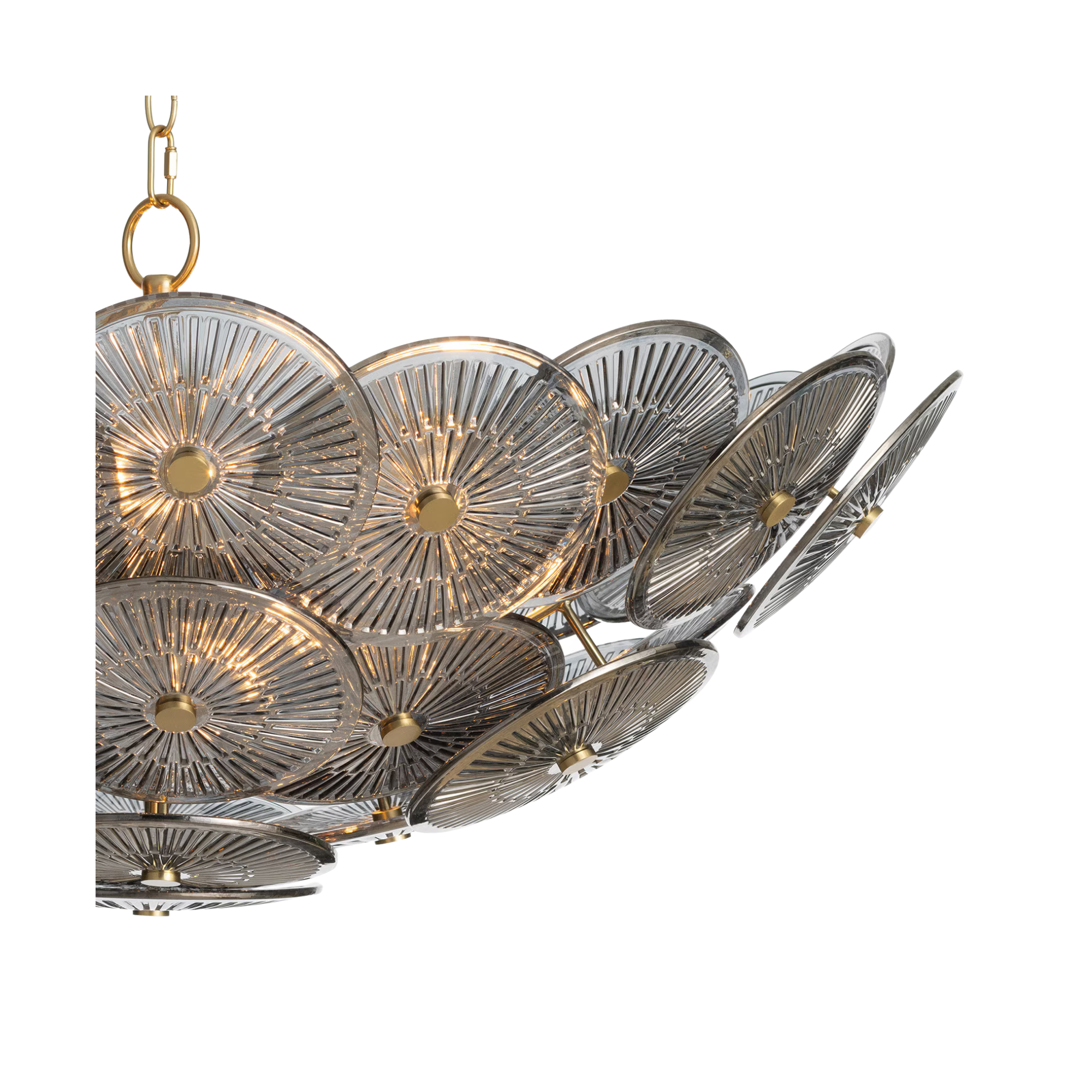 The Holly chandelier is captivating, featuring overlapping glass discs with intricate linear details reminiscent of vintage ceiling medallions while suspended on a natural brass chain. The medallions feature dotted natural brass finials for a modern, opulent touch.