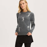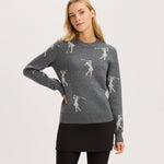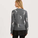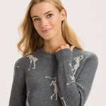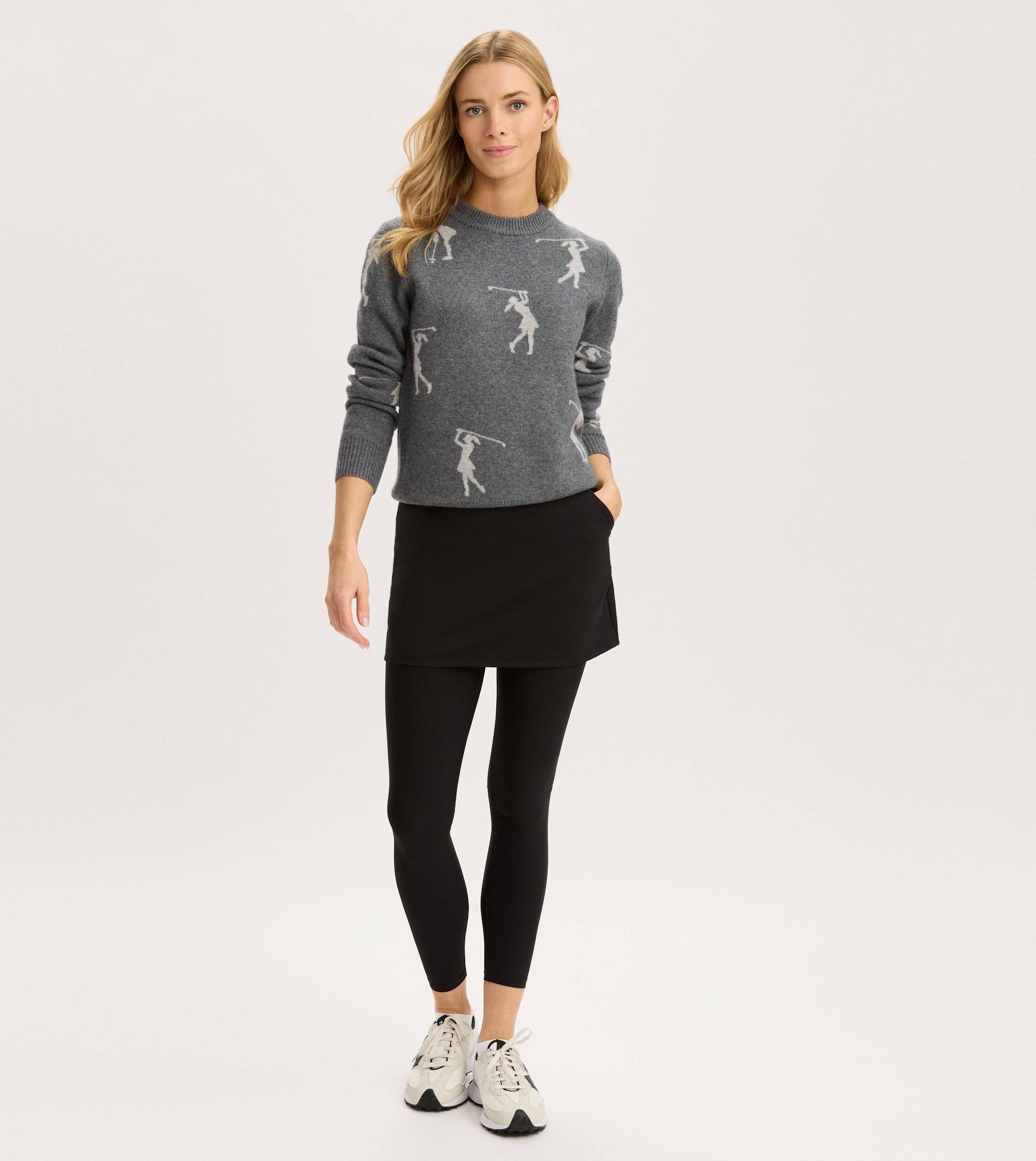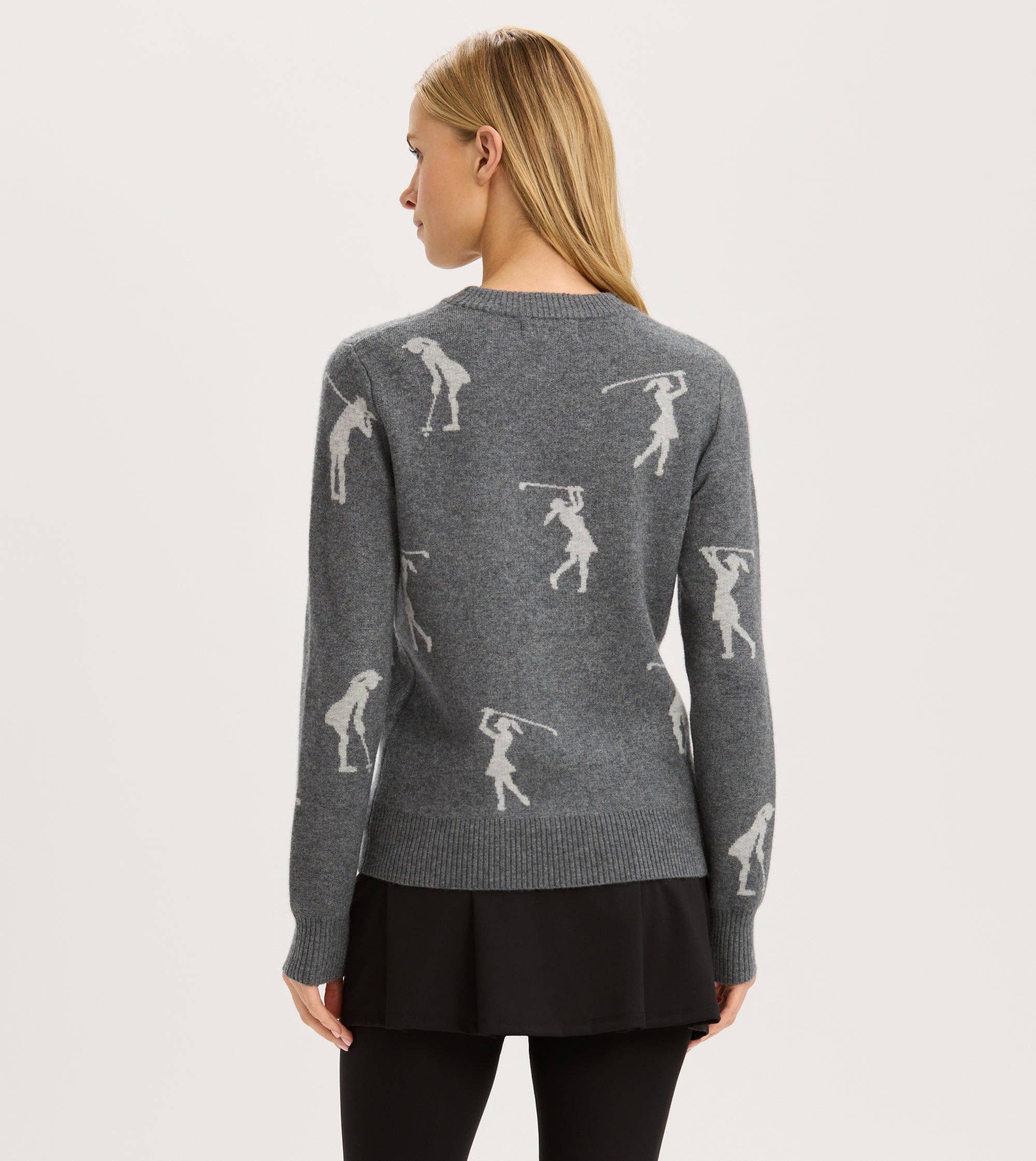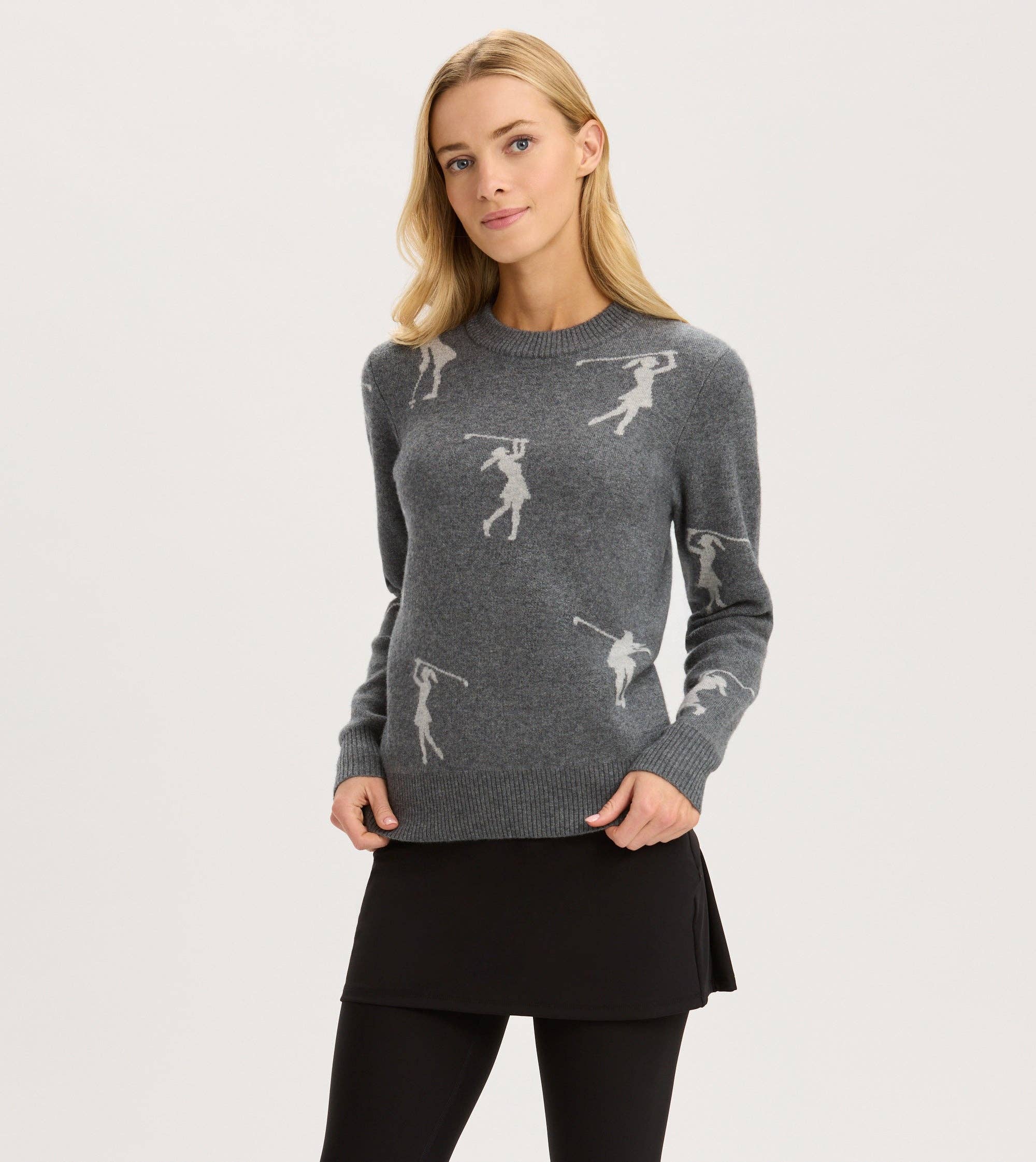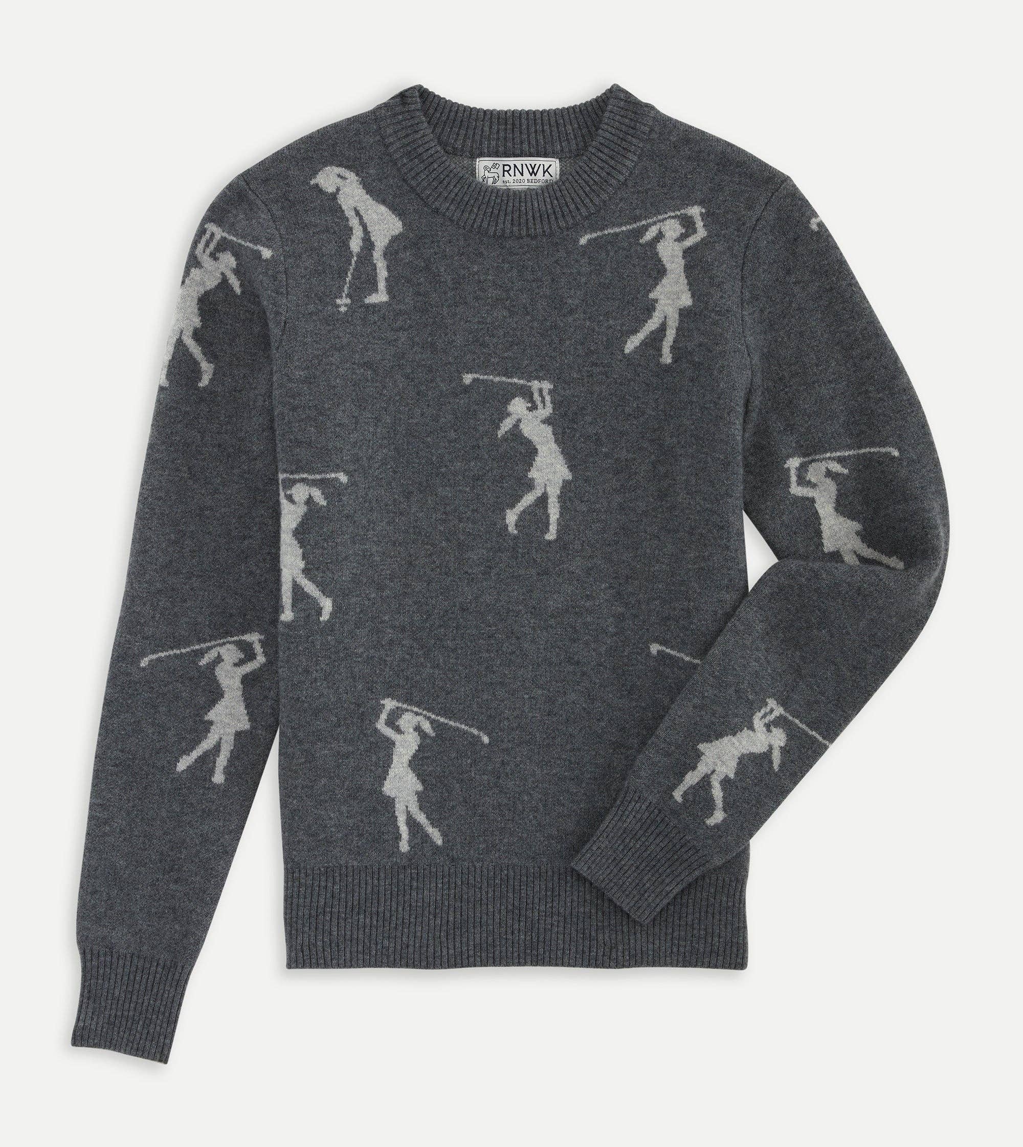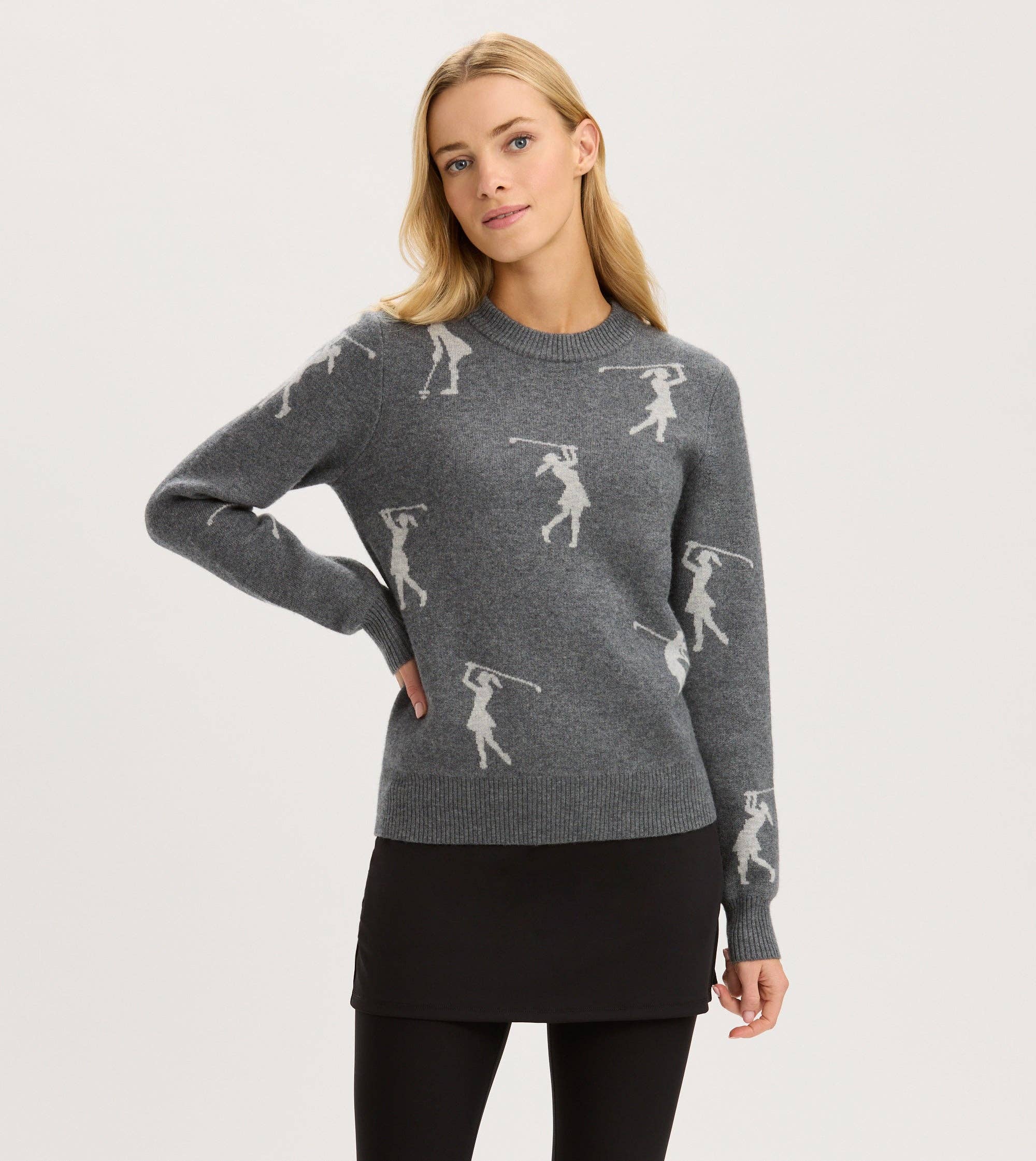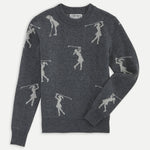 Supersoft crewneck sweater with allover intarsia golfers in a tonal color. Merino nylon blend. Imported. Dry clean or hand wash.