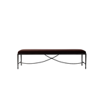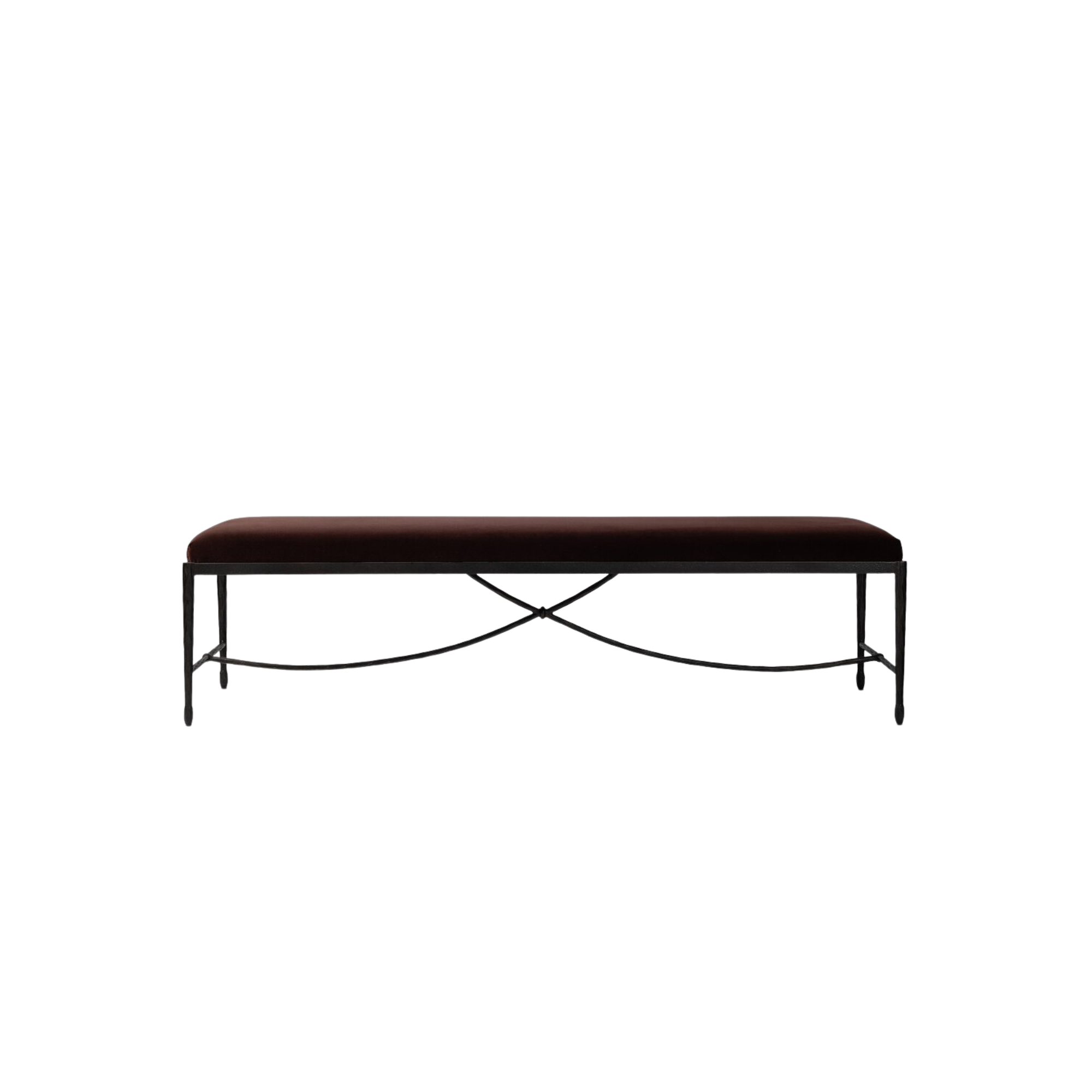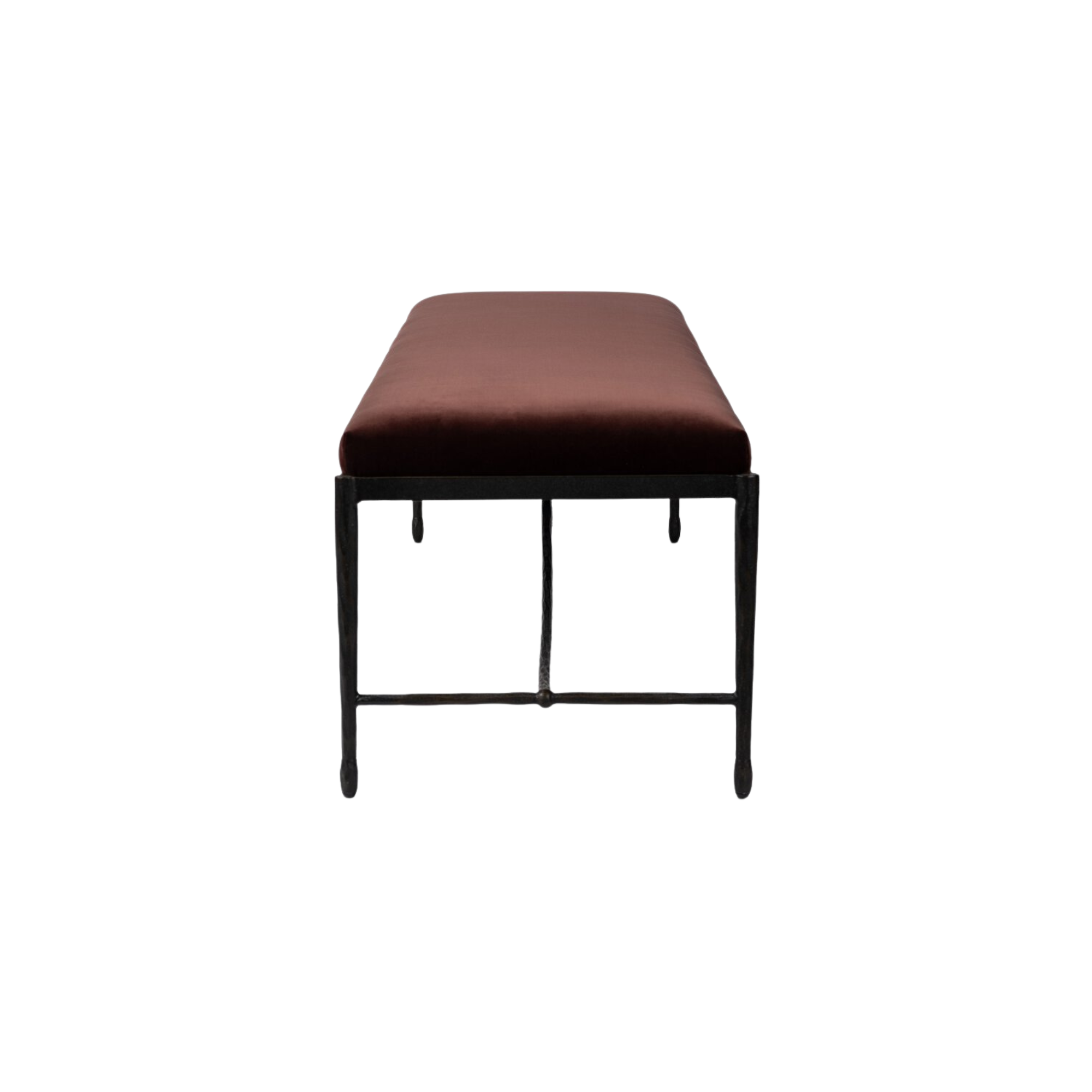 Channel Art Deco with a curved stretcher base of bronzed hammered iron and a velvety seat in a lush tone. Style in the bedroom or entryway to create an extra surface, or in your living space for bonus seating.