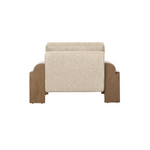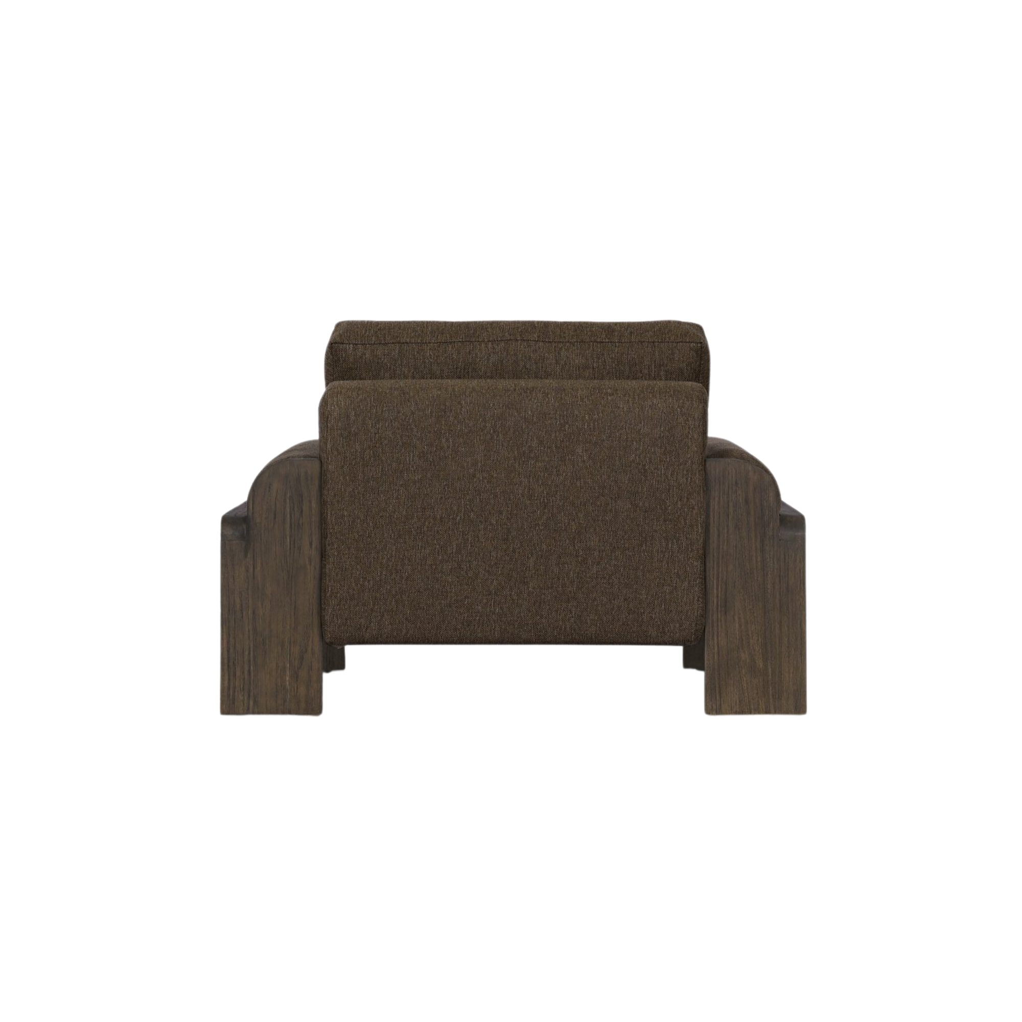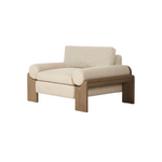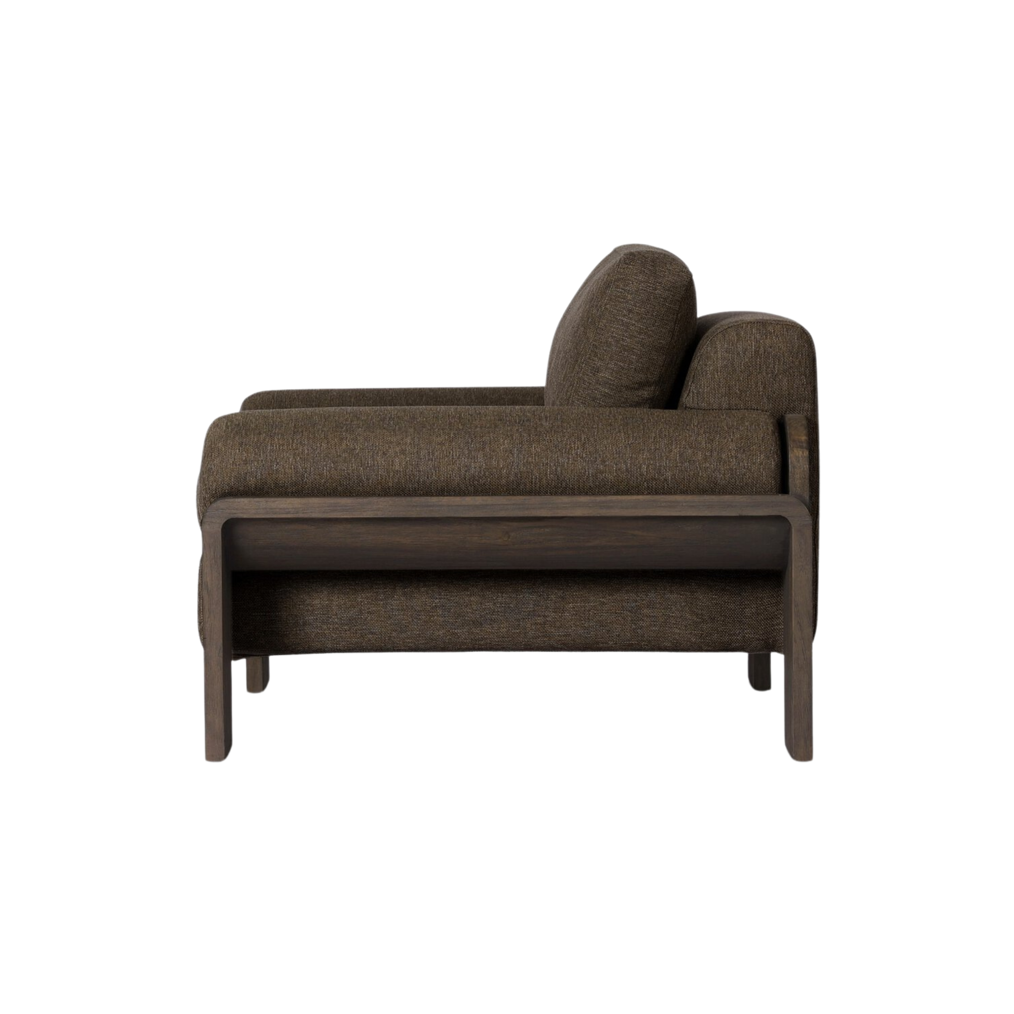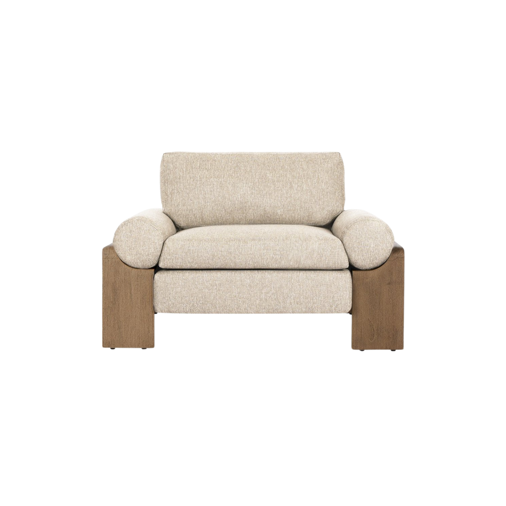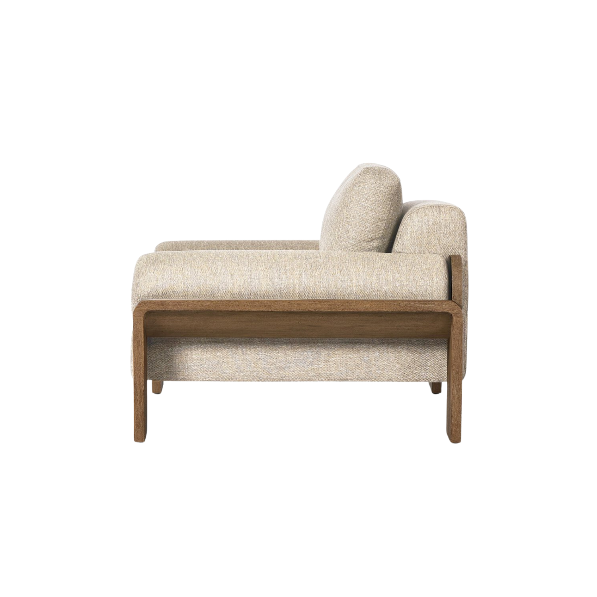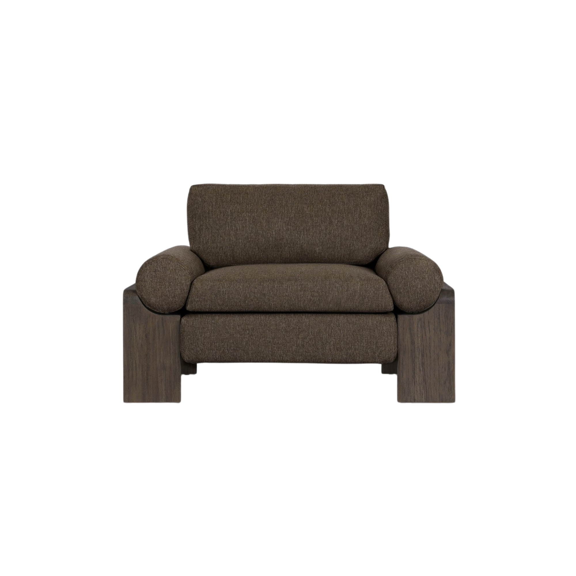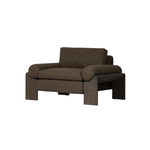 Heavy wood meets upholstery in this outdoor chair. Loose bolsters cradle the fixed seat, adding a playful element to this bold, angular frame. The monochromatic look of textural fabric and stained FSC®-certified teak ground the piece, accented with wide leg proportions and a box edge loose back pillow. Cover or store indoors during inclement weather and when not in use.