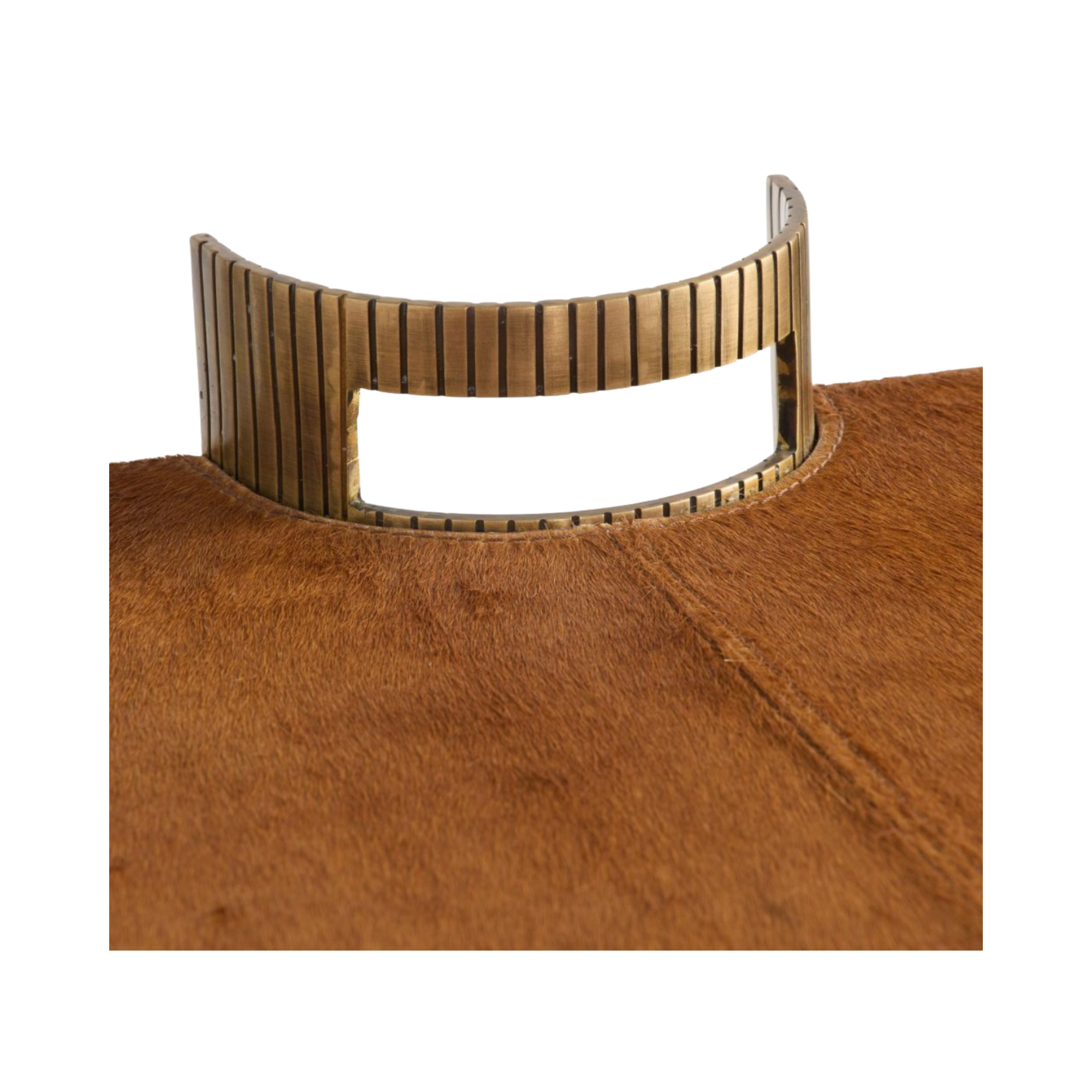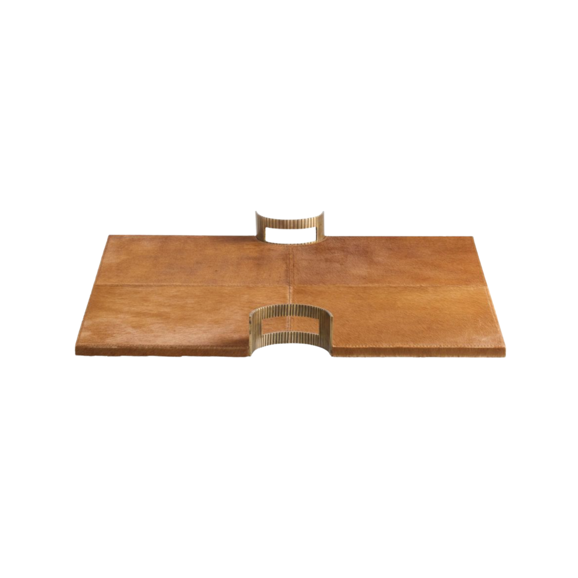 Elevate your space with the Jones Tray, strikingly inspired by equestrian style. Crafted from rich brown leather with detailed topstitching, it features curved antique brass handles for carrying. Its larger size makes a bold statement, perfect for organizing or serving with a touch of charm.