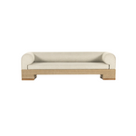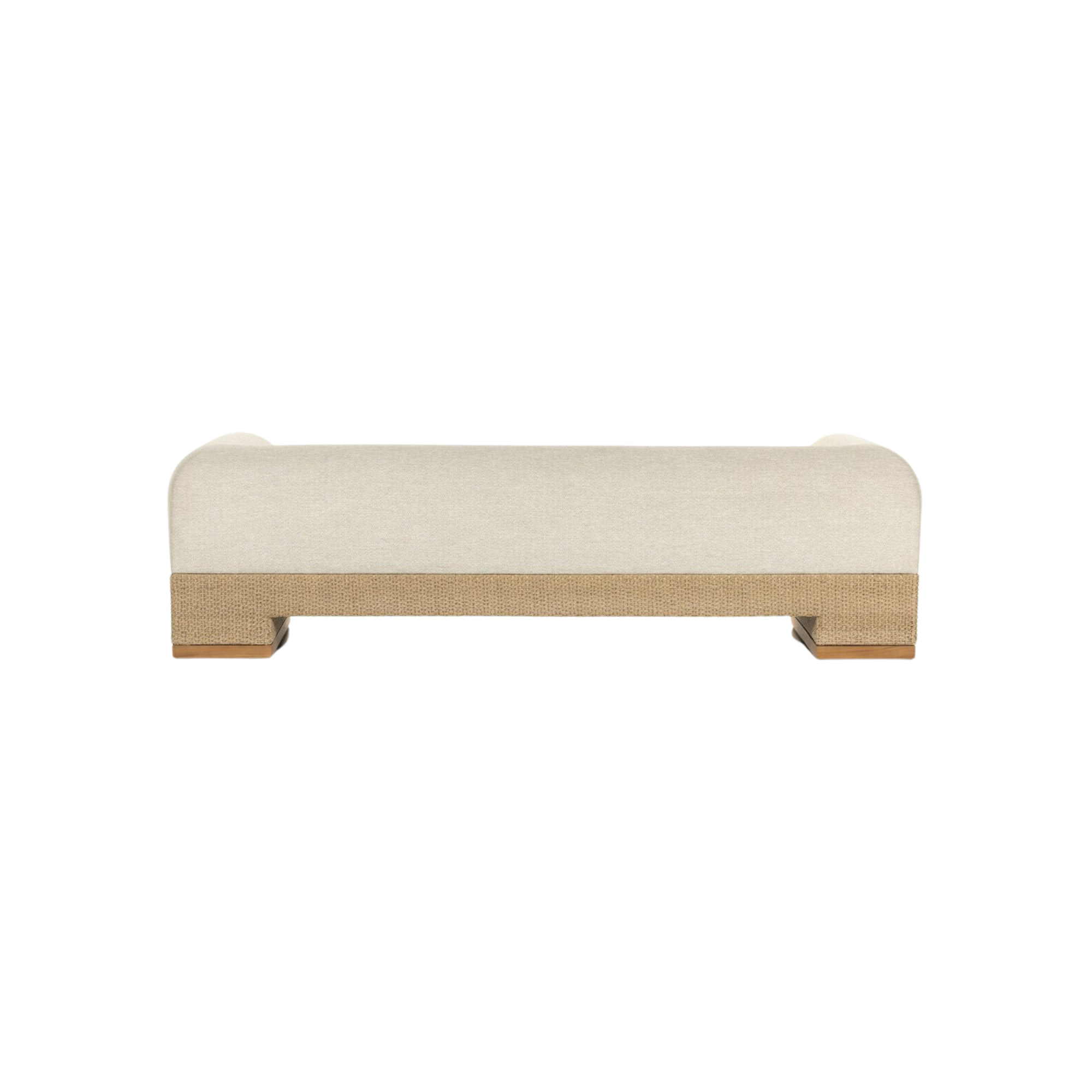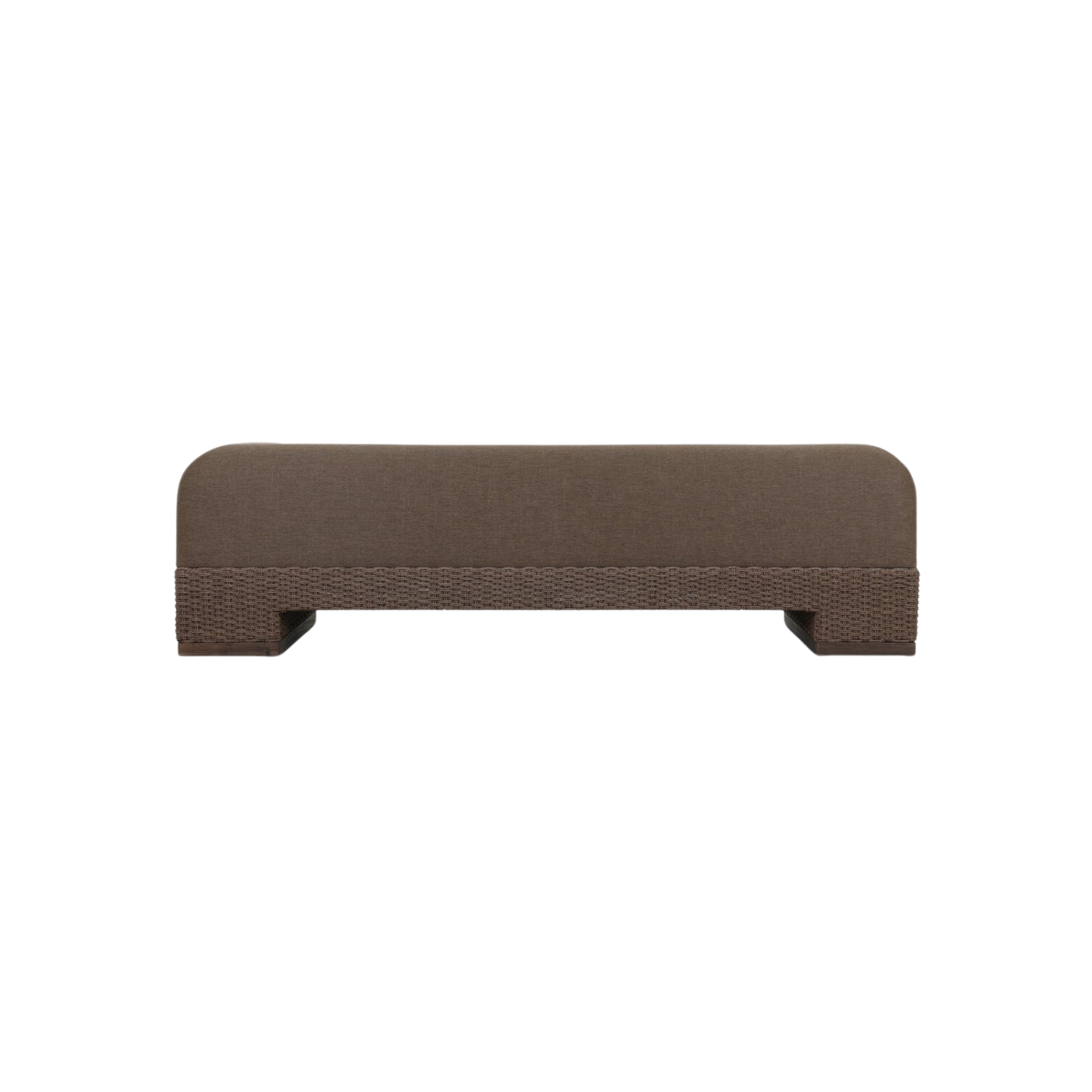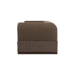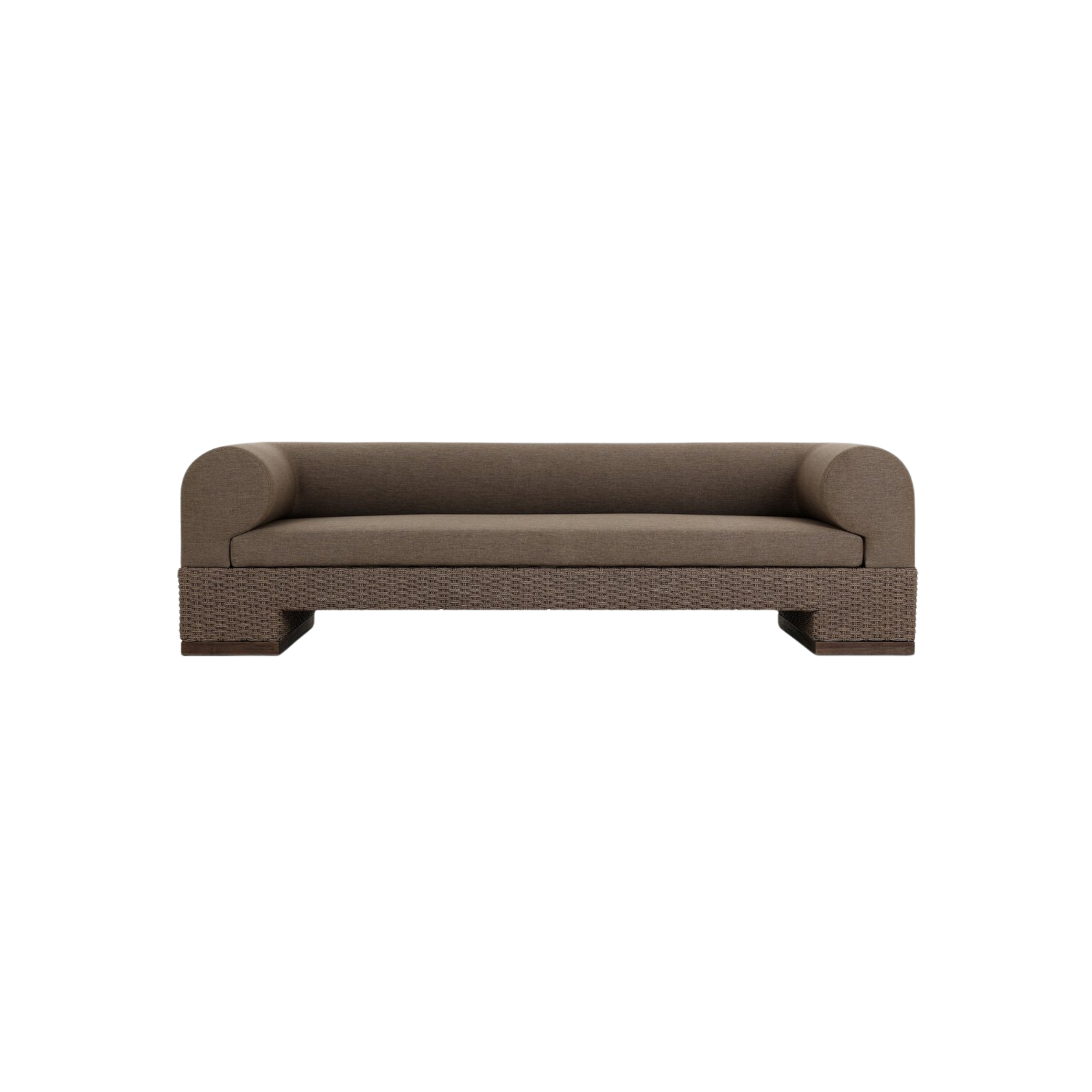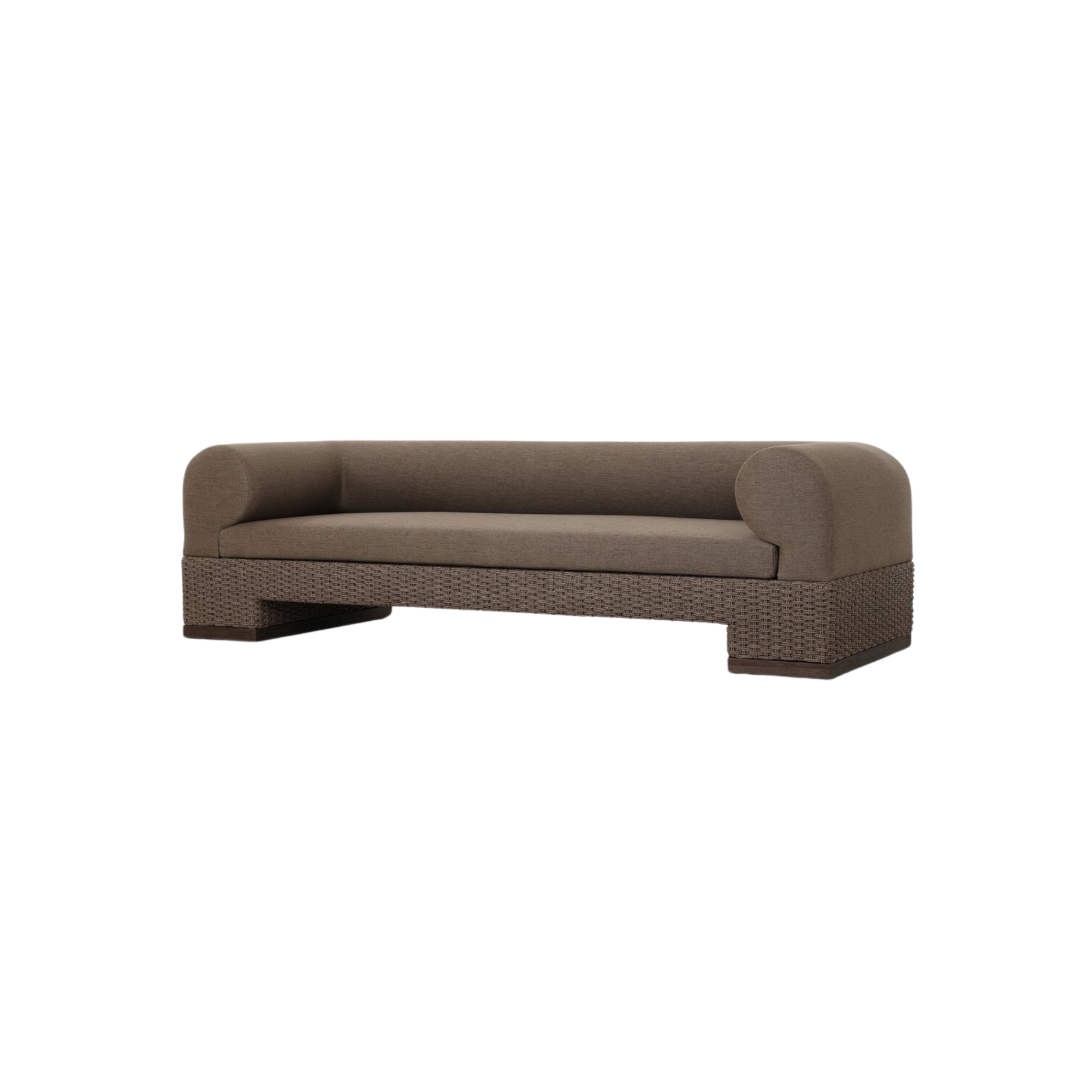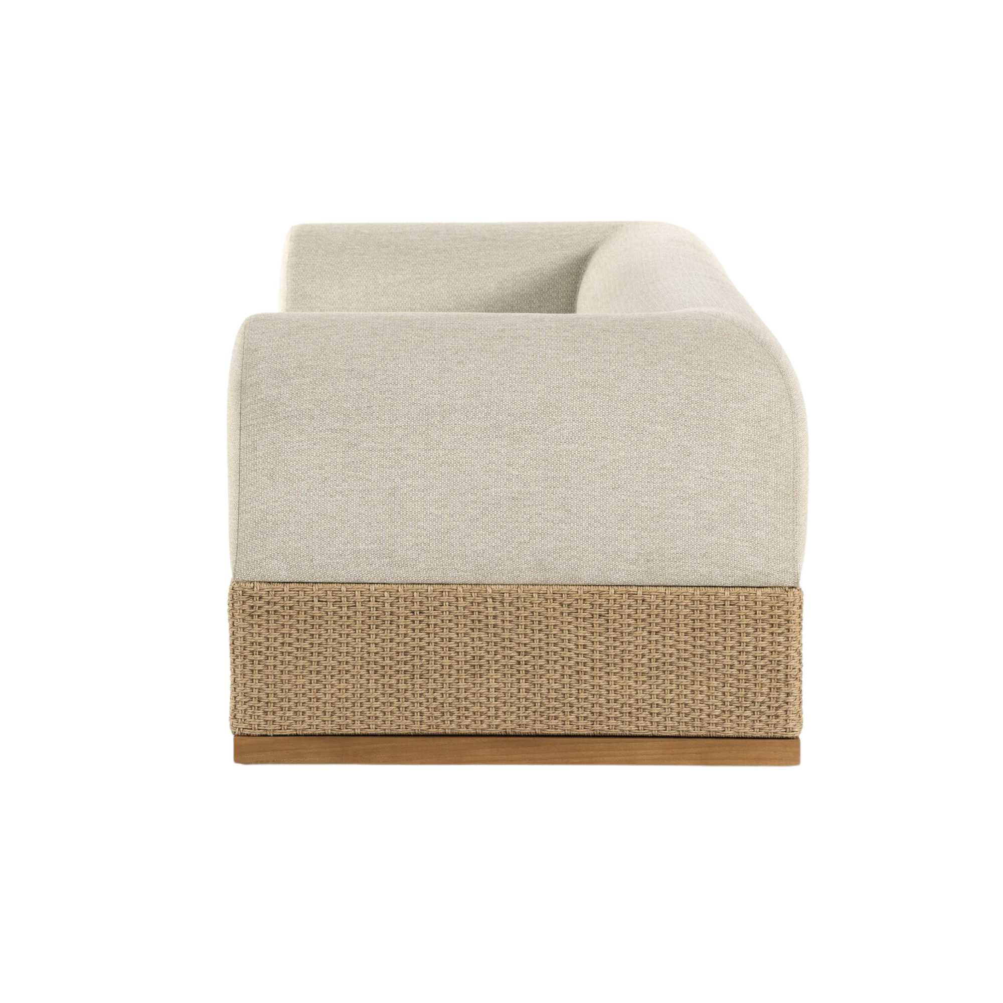 Regal outdoor seating in an extra long length. Seat cushion and sculptural arms and back bolsters are tightly upholstered in 100% Olefin known for its UV-resistant, water-repellent, quick-drying abilities. Cutout wicker base adds a sense of airiness to the design above teak plinth feet. Cover or store indoors during inclement weather and when not in use.