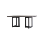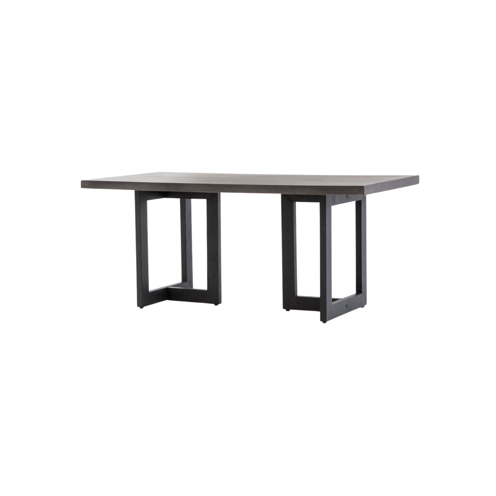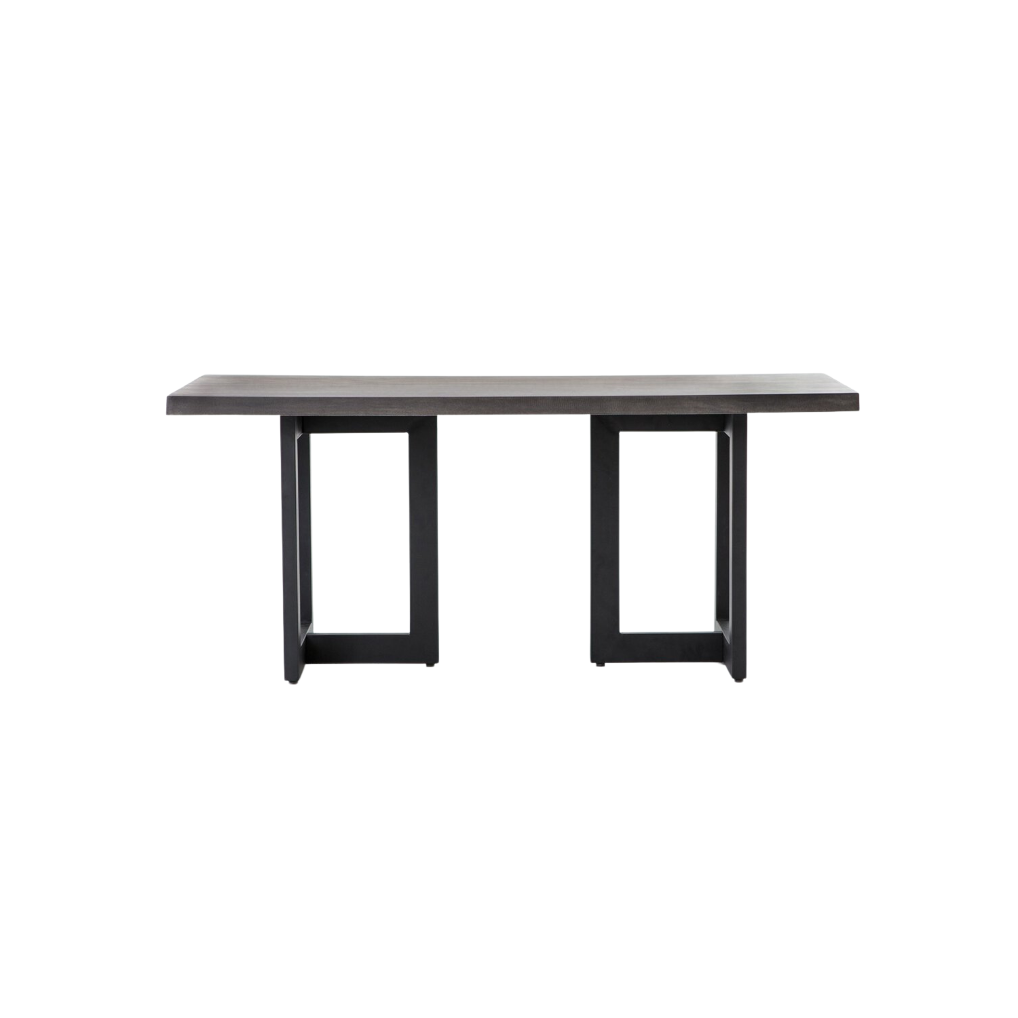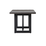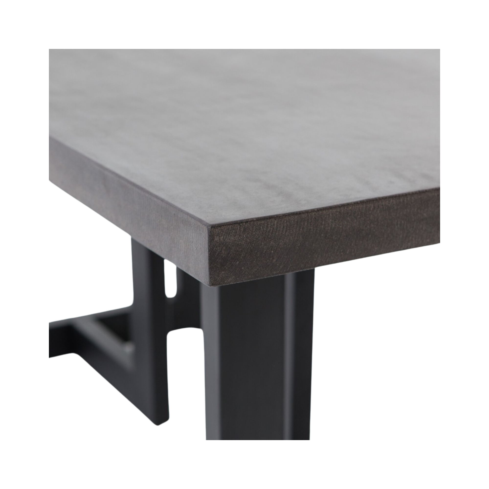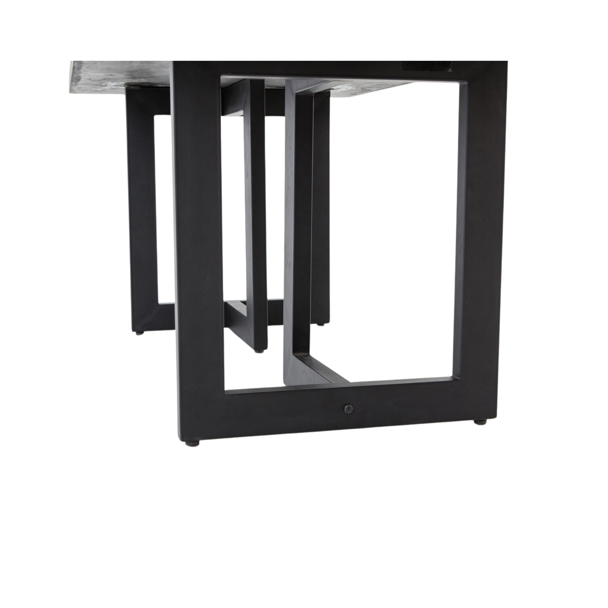 A black-finished iron base supports a rectangular tabletop of black lava stone, spurring an angular look with industrial appeal. Cover or store indoors during inclement weather and when not in use.