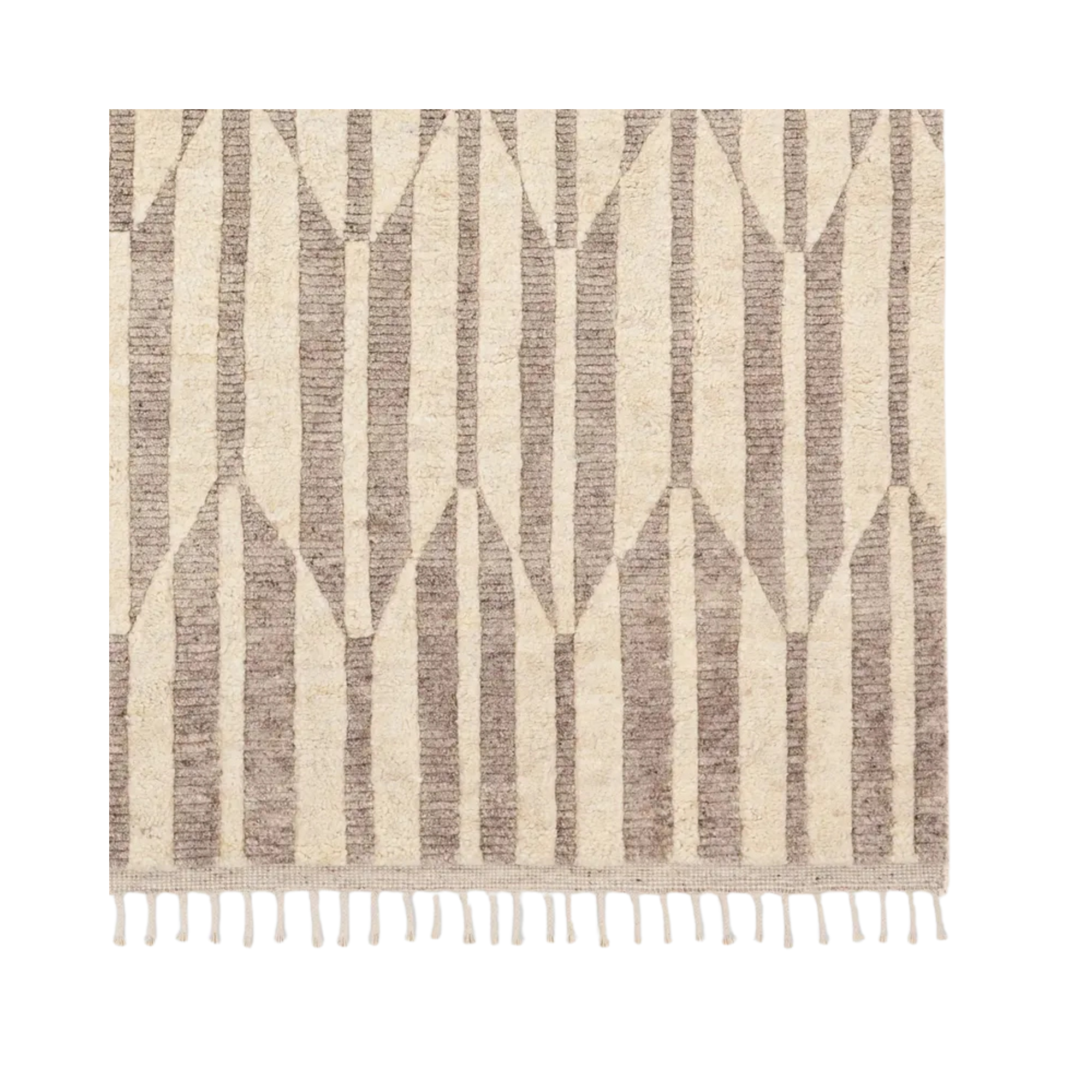 The Keoka collections boasts a fresh take on classic Afghani hand-knotted textiles. In easy-to-decorate tones of cream and gray, the light and airy colorway of the Quest rug anchors room with versatility and neutral appeal. The texture-rich wool pile features a ribbed construction that lends unique linear details to the dynamic geometric patterns. Braided fringe accents and a thin flatweave border add a dose of global flair.