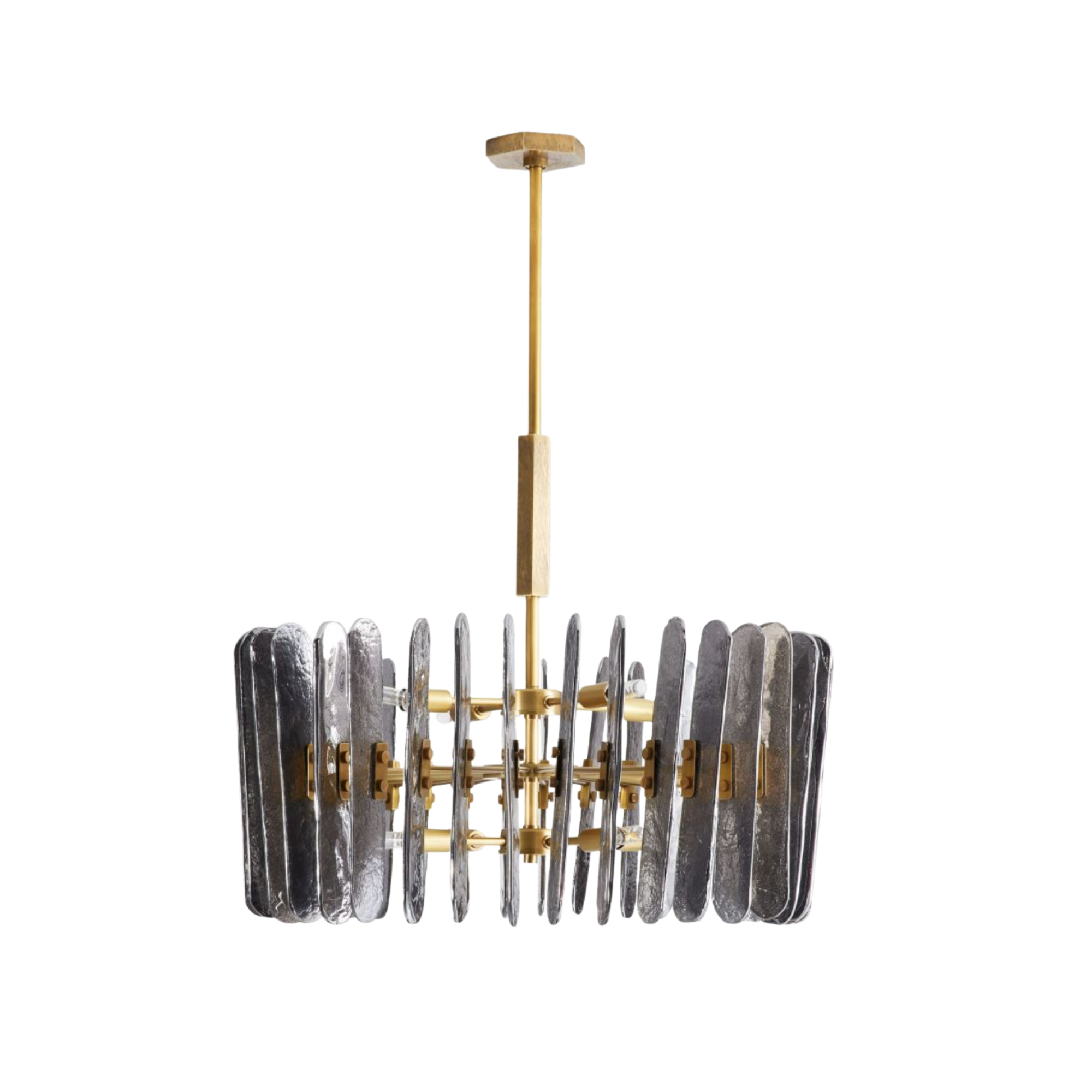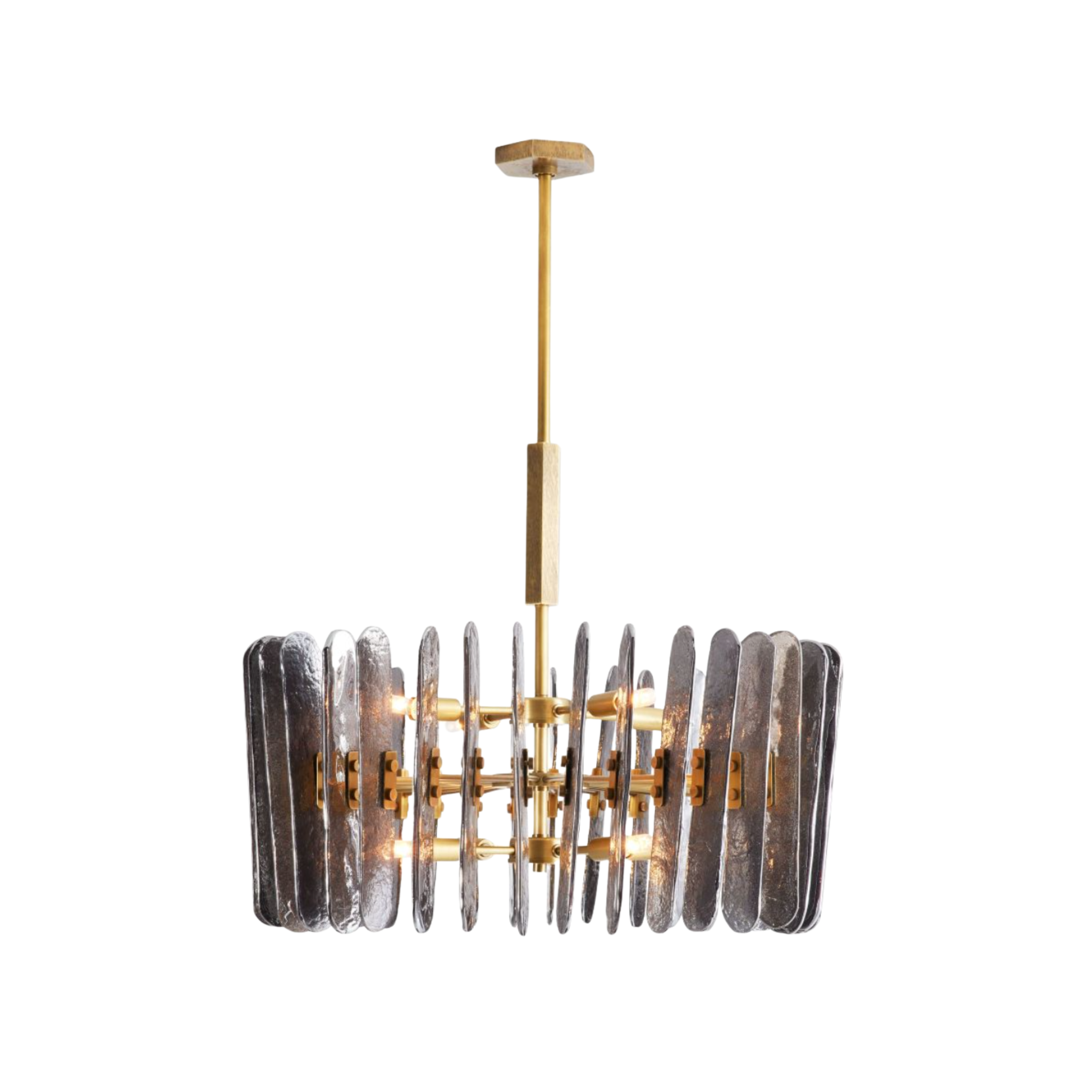 Elevate your space with the Klaus Chandelier. Featuring seedy glass panels in a smoke finish set within an antique brass iron frame. Its drum-shaped design casts a moody glow that highlights the intricate arrangement of the panels. The faceted accents and undulating glass create visual texture, making this chandelier a stunning centerpiece that blends timeless elegance with modern artistry.