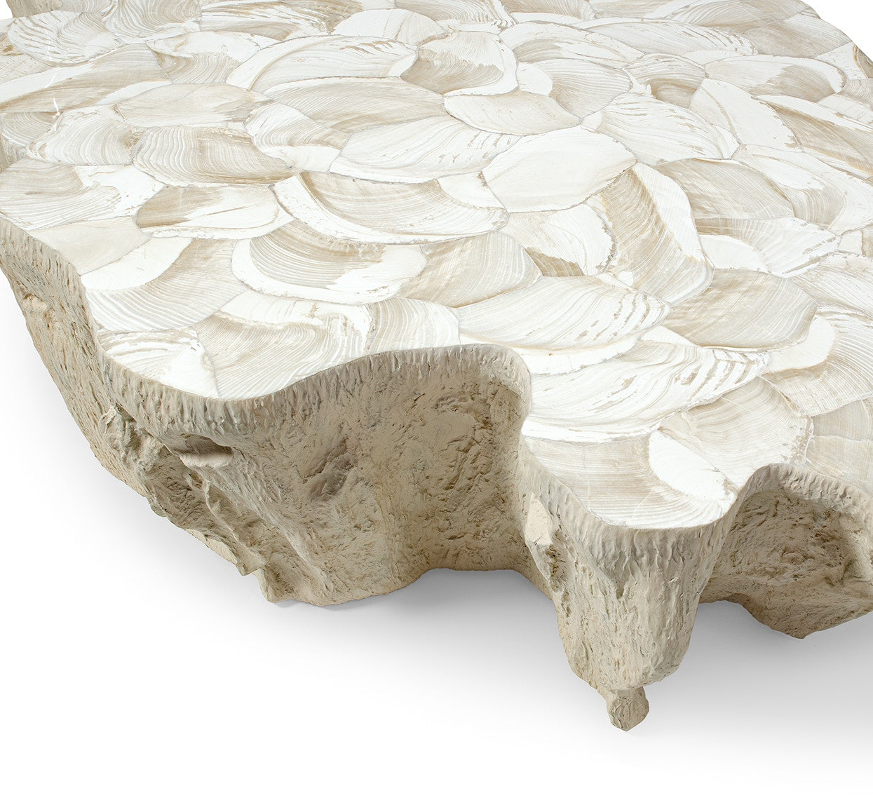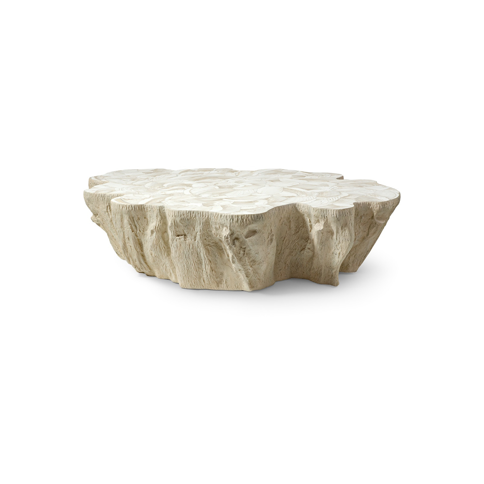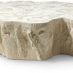 The Marcela Outdoor Coffee Table features a stunning inlaid fossilized clam shell top set on a durable fiberglass base crafted from a natural tree trunk mold, finished in warm cream tones. Each clam shell is unique, offering subtle variations in color and grain that enhance its natural beauty. Designed for outdoor use, this table combines elegance with resilience. Delivered on a pallet, it may require a lift gate or forklift, with white glove delivery available upon request. Elevate your outdoor space with this distinctive, nature-inspired centerpiece. Contact our customer service team for more details.