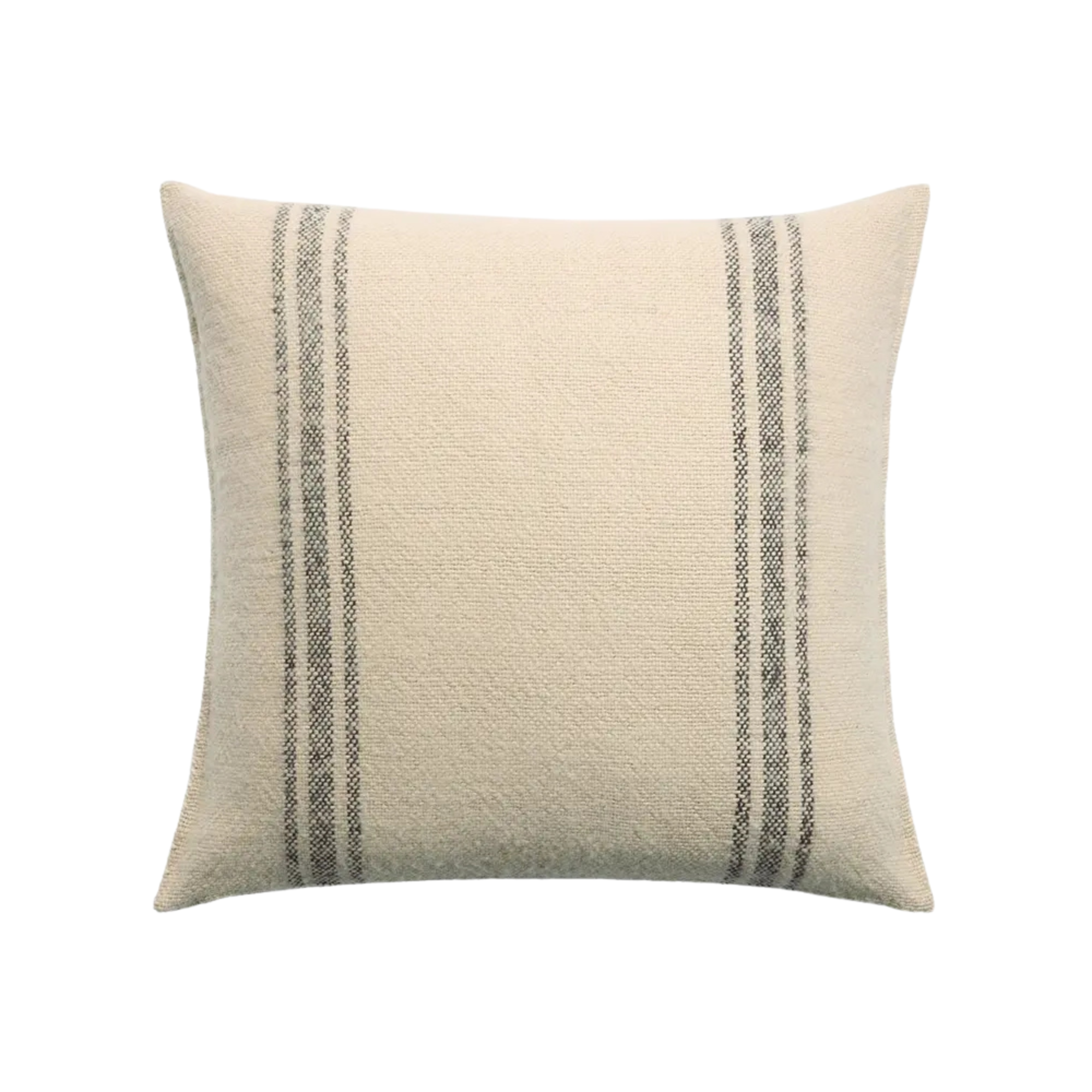 Presenting the Margosa collection, offering stonewashed and embroidered handcrafted throws, blankets, and bedding, expertly crafted of soft cotton and hand-spun wool in India. Grounded in ancient textile traditions, this collection brings natural designs and textures through indigenous techniques, nature-inspired colors, and raw fibers. The 100% wool Enitca pillow features a cream base with two sets of stripes for a simple, contemporary style.