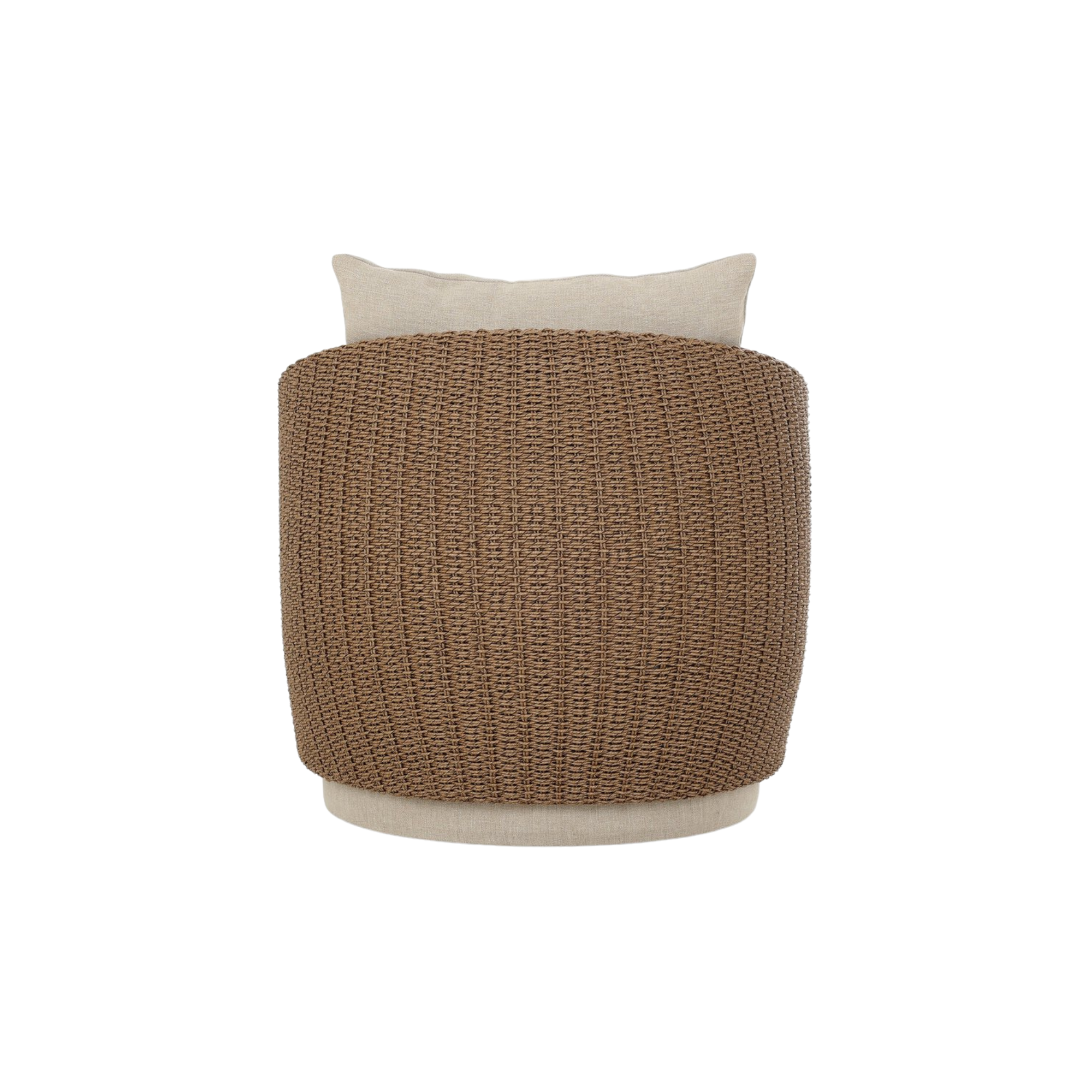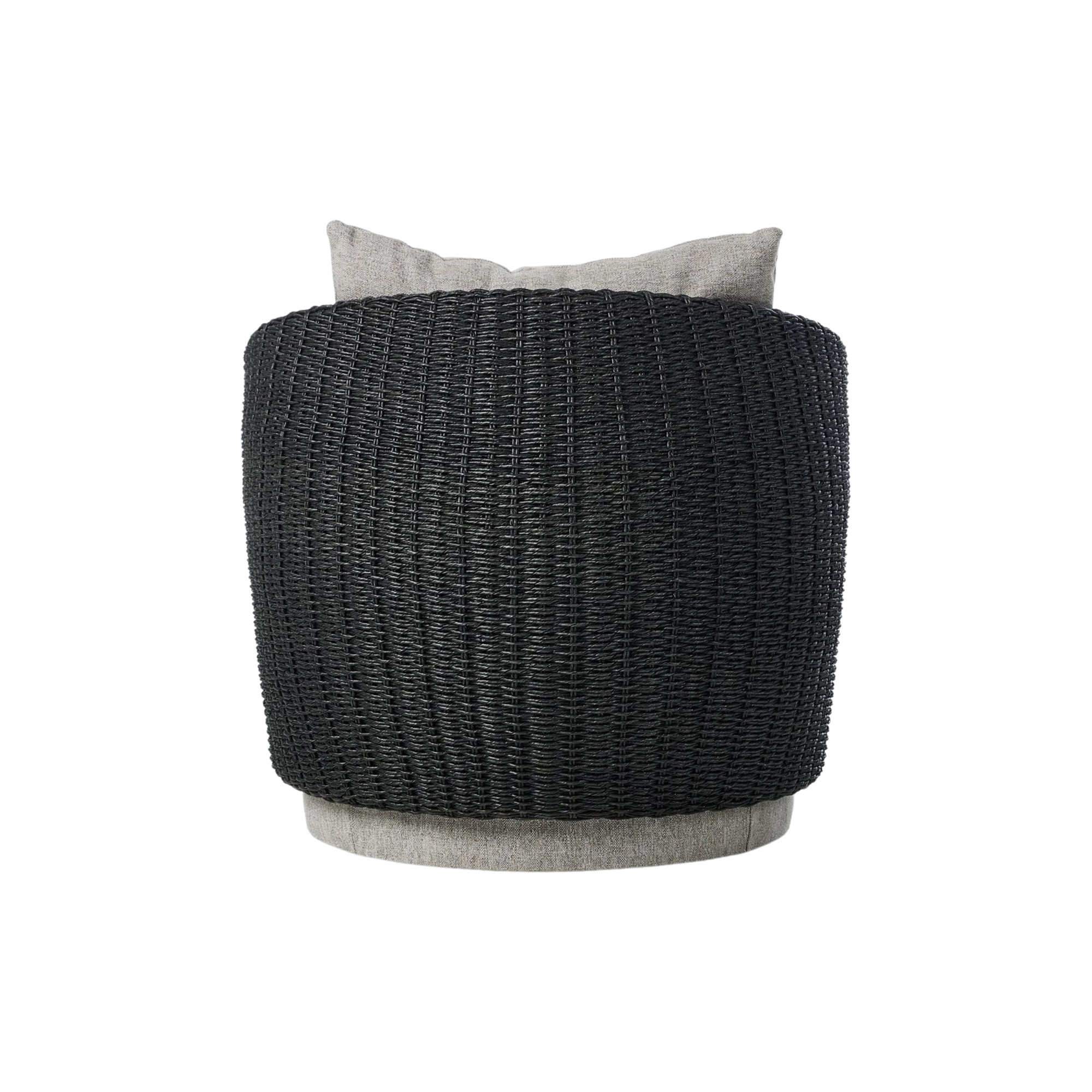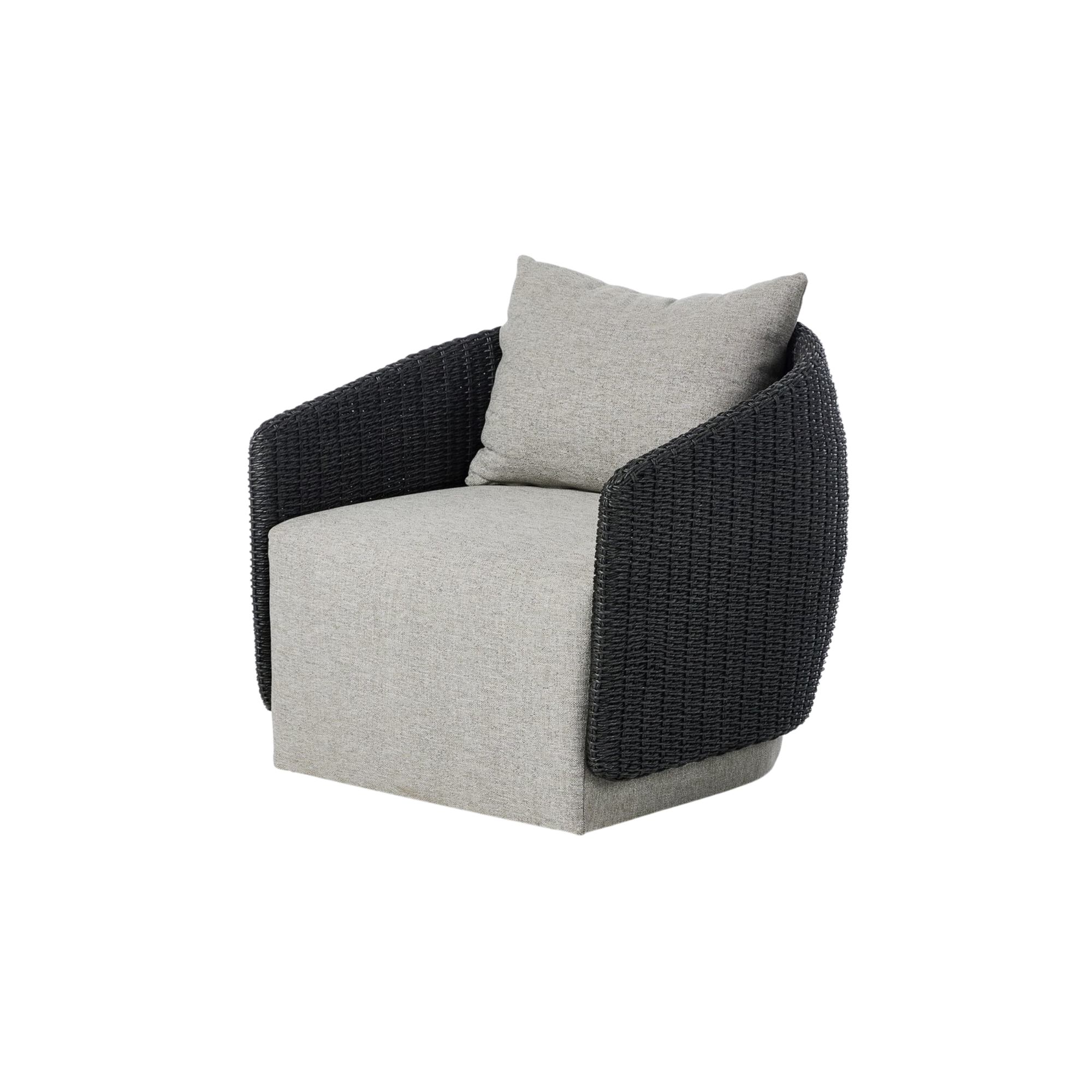 Sustainably made with zero waste, luxurious Italian upholstery places a new and unique spin on indoor/outdoor seating, offering soft, durable fabric that's highly resistant to sun, stains, mold and abrasion. Shell framing of faux hyacinth weaves for extra texture atop a 360-degree swivel. Cover or store indoors during inclement weather and when not in use.