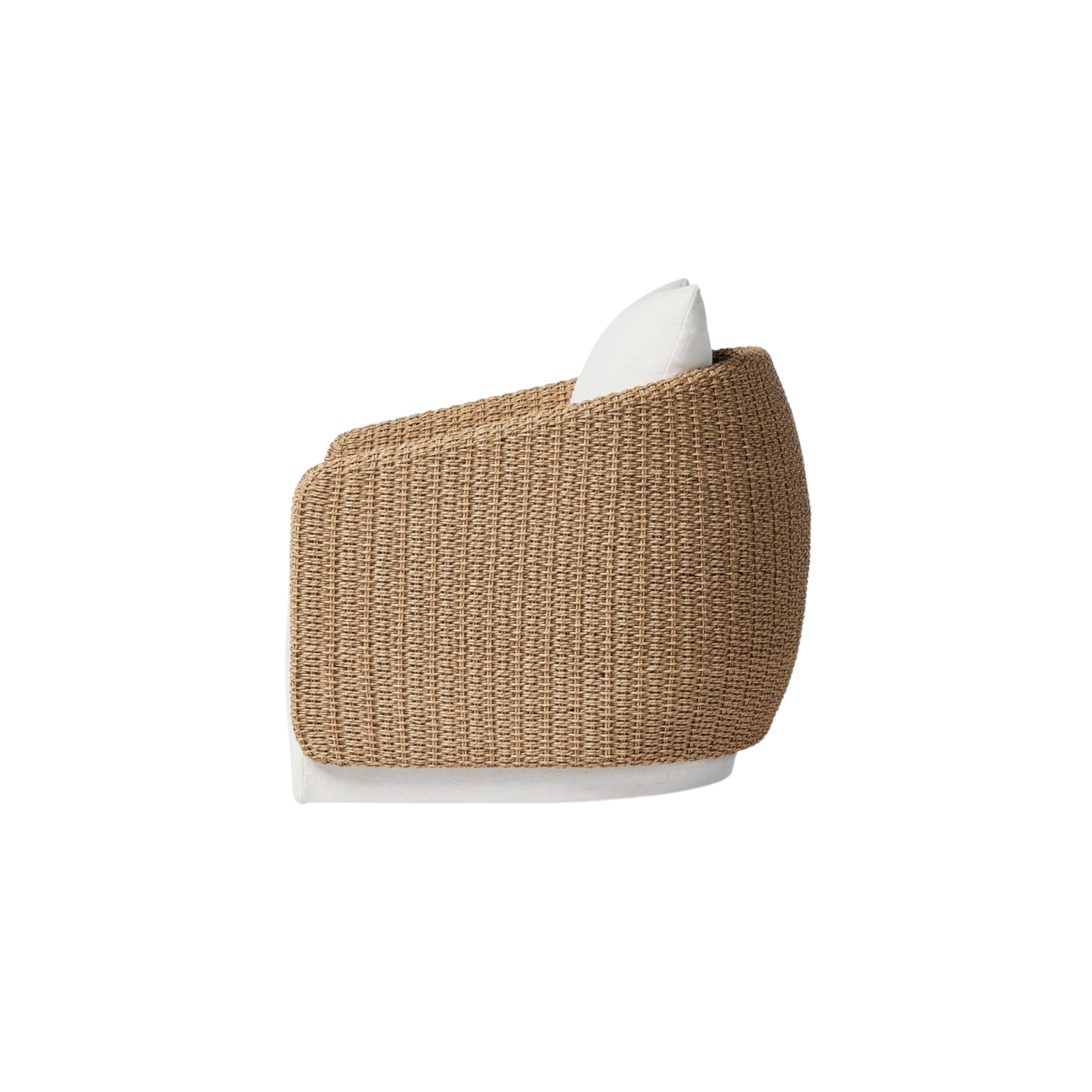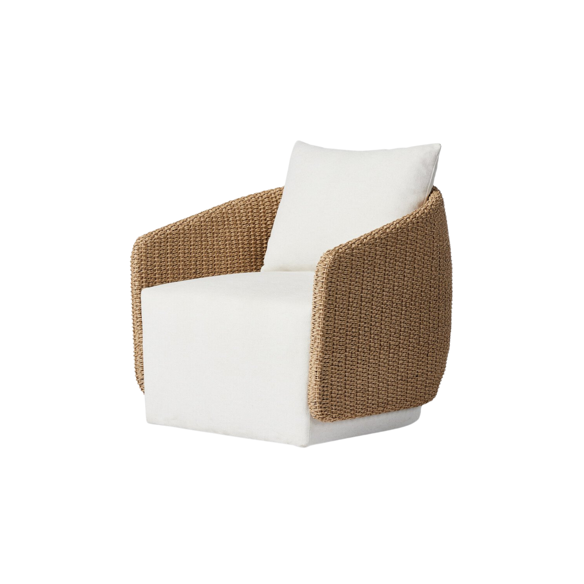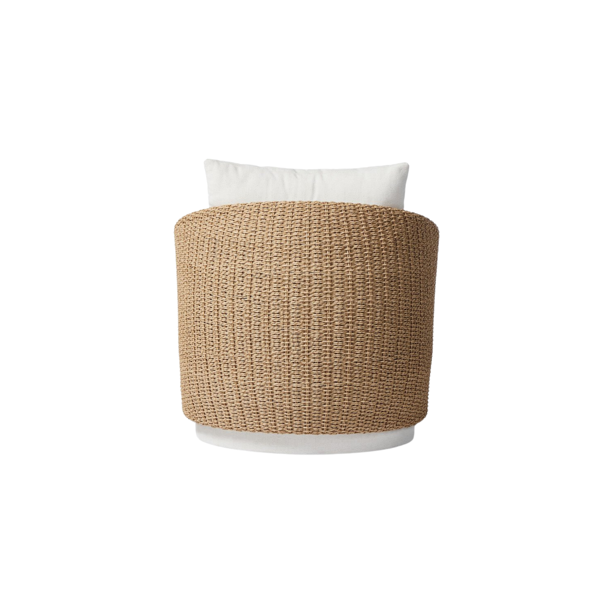 Sustainably made with zero waste, luxurious Italian upholstery places a new and unique spin on indoor/outdoor seating, offering soft, durable fabric that's highly resistant to sun, stains, mold and abrasion. Shell framing of faux hyacinth weaves for extra texture atop a 360-degree swivel. Cover or store indoors during inclement weather and when not in use.