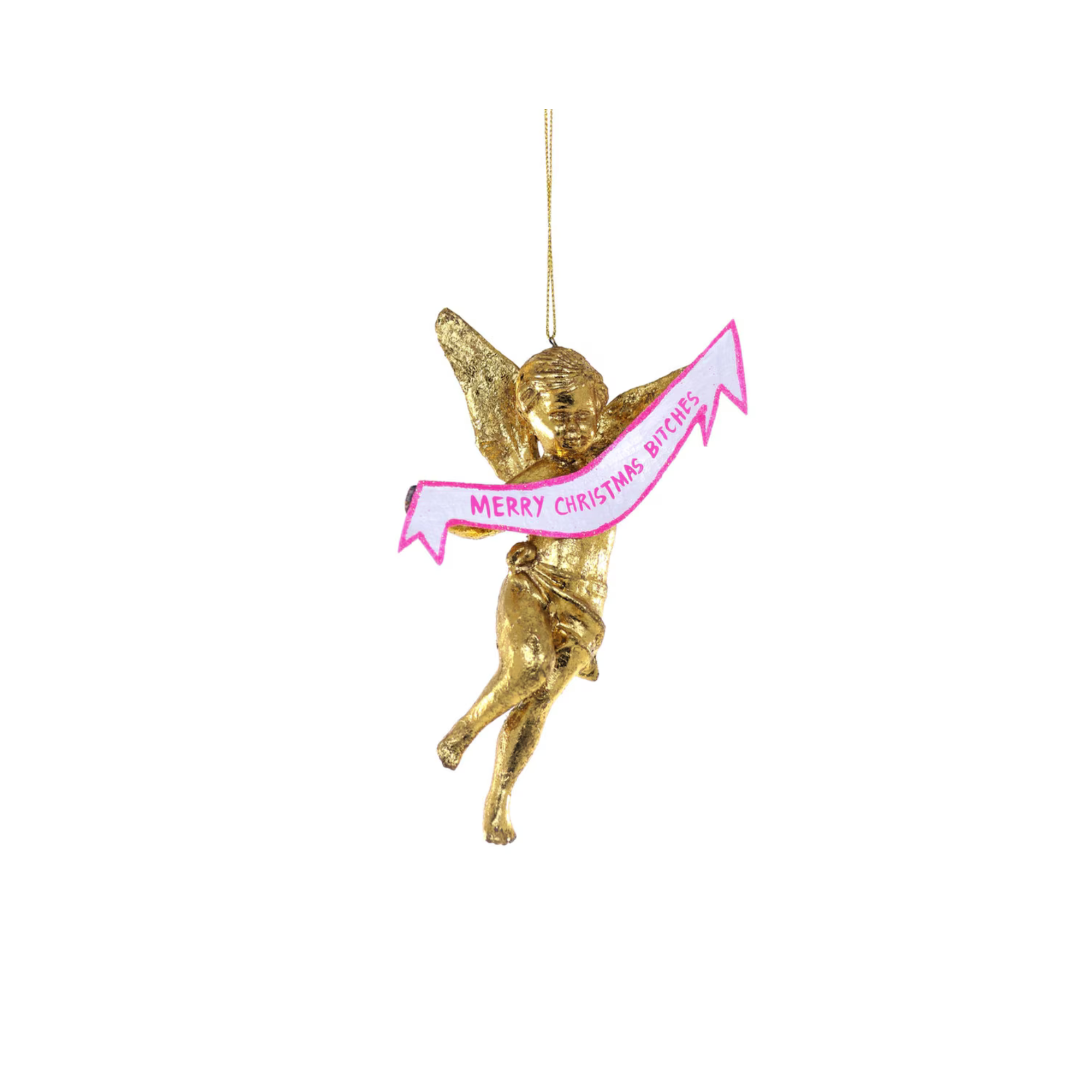 Bring a little irreverent charm to the holidays! This gold cherub ornament delivers holiday cheer with a cheeky twist. Featuring a gleaming cherub figure clutching a festive "Merry Christmas Bitches" message, it's guaranteed to bring humor to any holiday treescape.