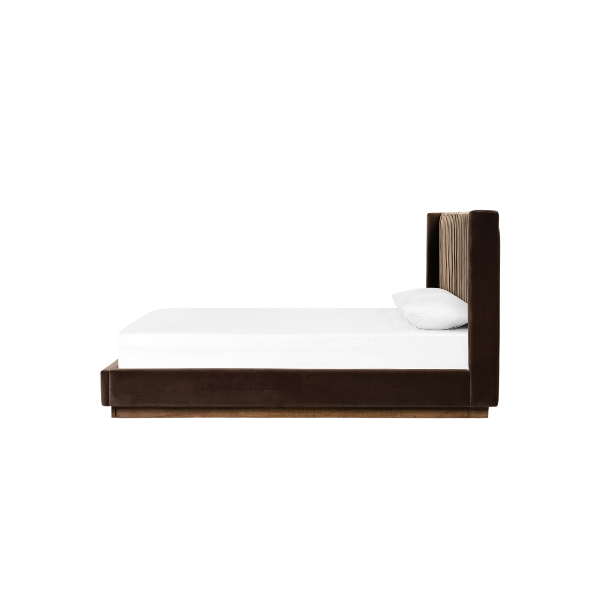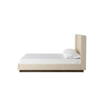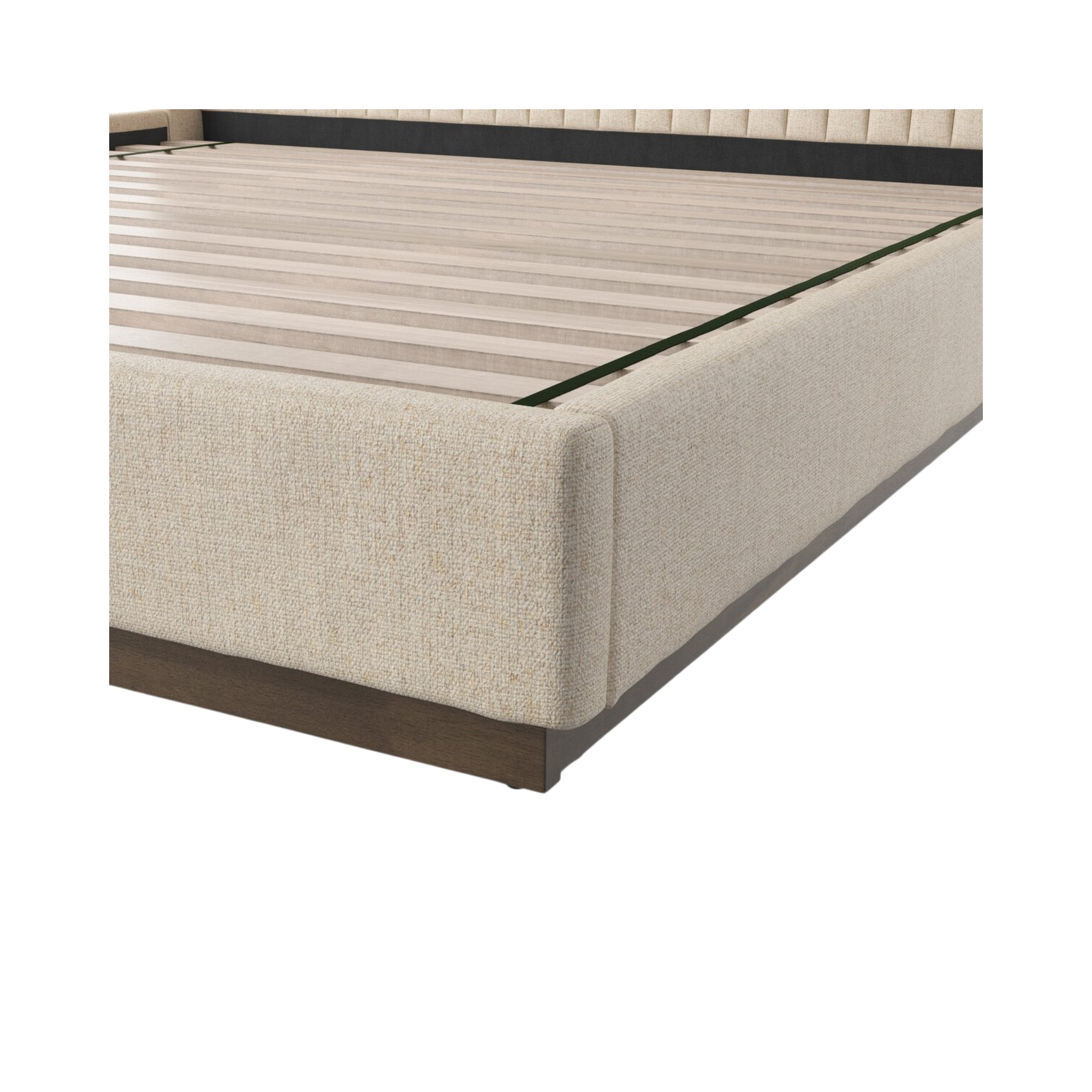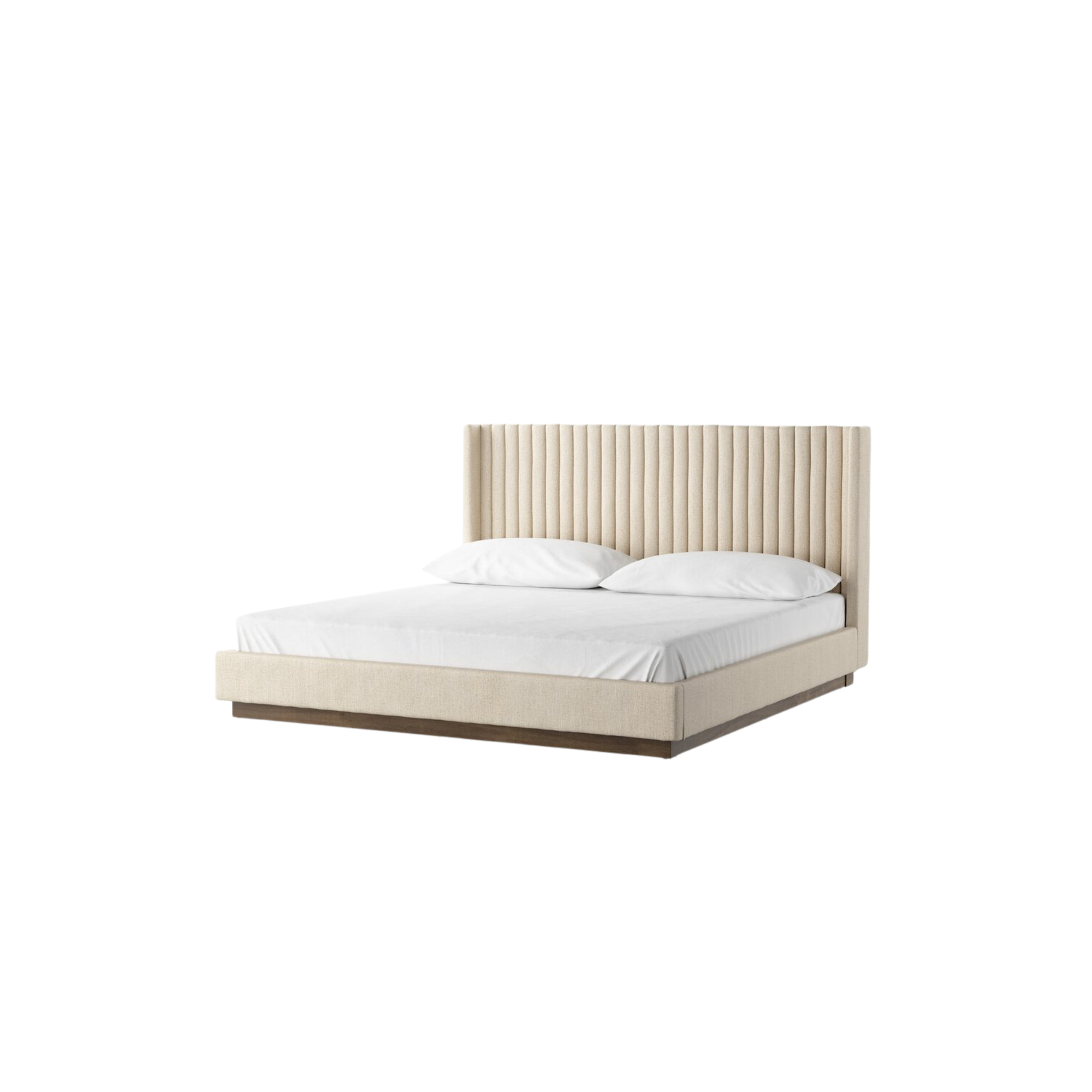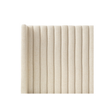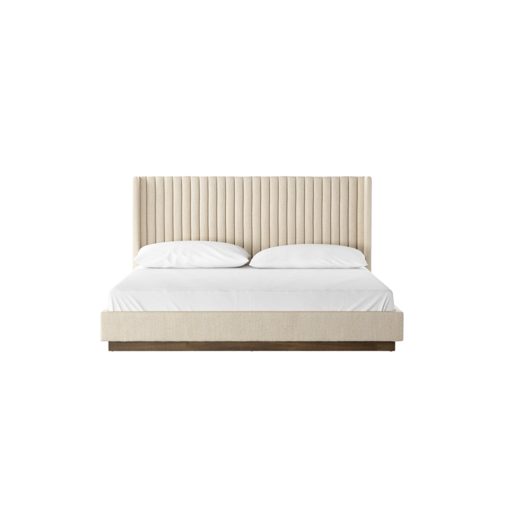 A tall, vertical-channeled headboard is upholstered in cream high-performance fabric for a sensible take on modern bedroom styling. A parawood plinth base grounds the whole look. Performance fabrics are specially created to withstand spills, stains, high traffic and wear, ensuring long-term comfort and unmatched durability.
