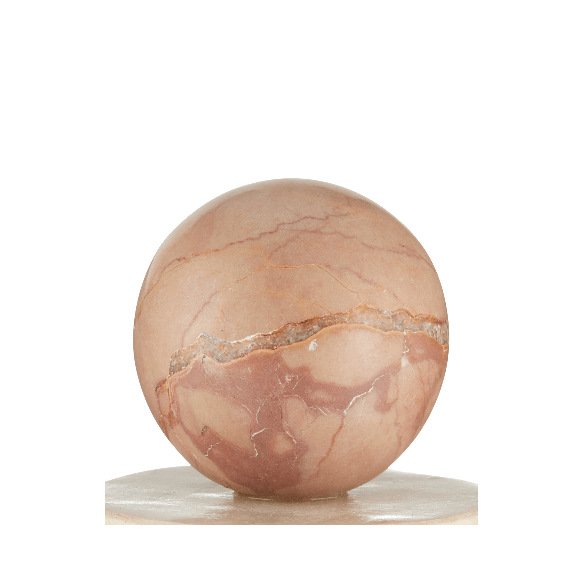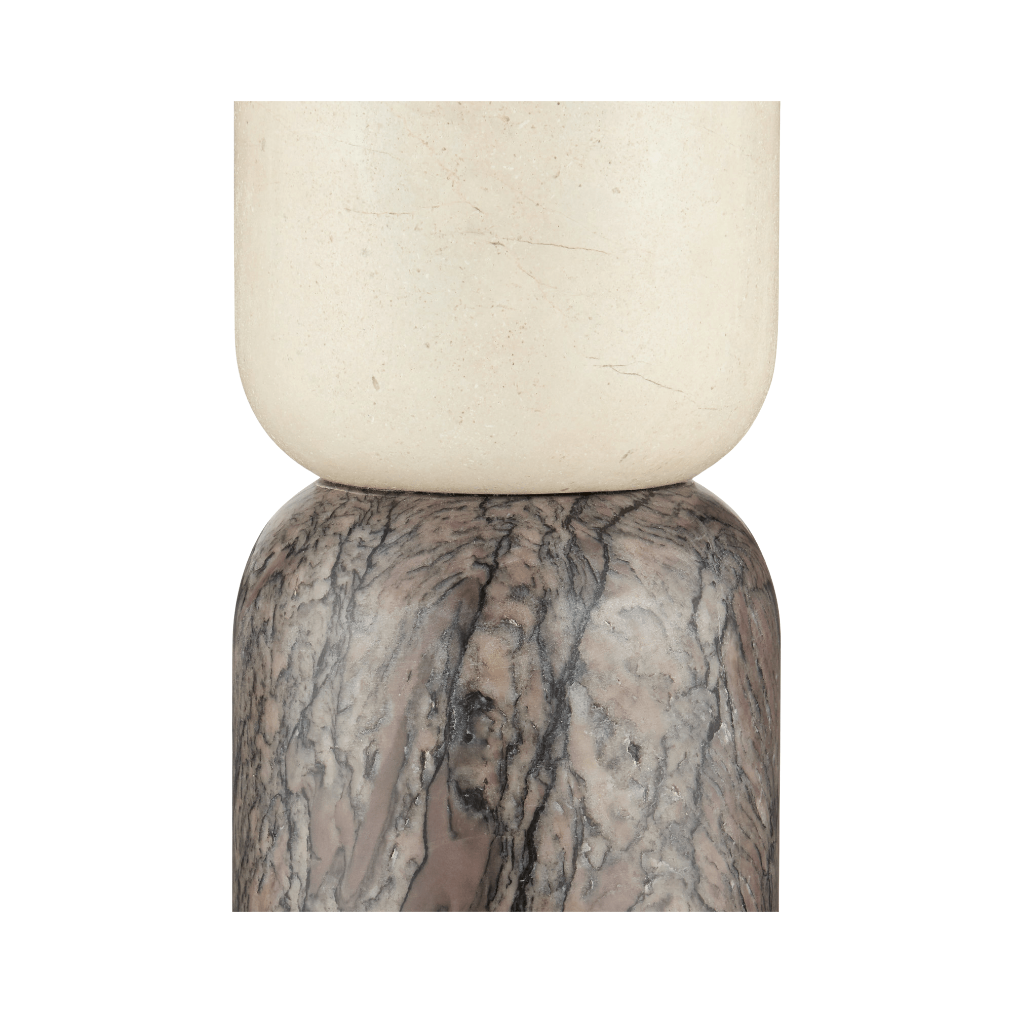 The Moreno Marble Objects Set includes two sculptures made of Rosa Cappuccino Marble, Camello Neve Marble, and Breccia Marble. The geometric sculptural pieces have tremendous personality because of the veining on two of the marbles, and the fact that the dynamic surfaces of the black and pink marbles contrast the pale softness of the other. The surfaces of the objects will vary from piece to piece, given the sculptures are made of natural stone.