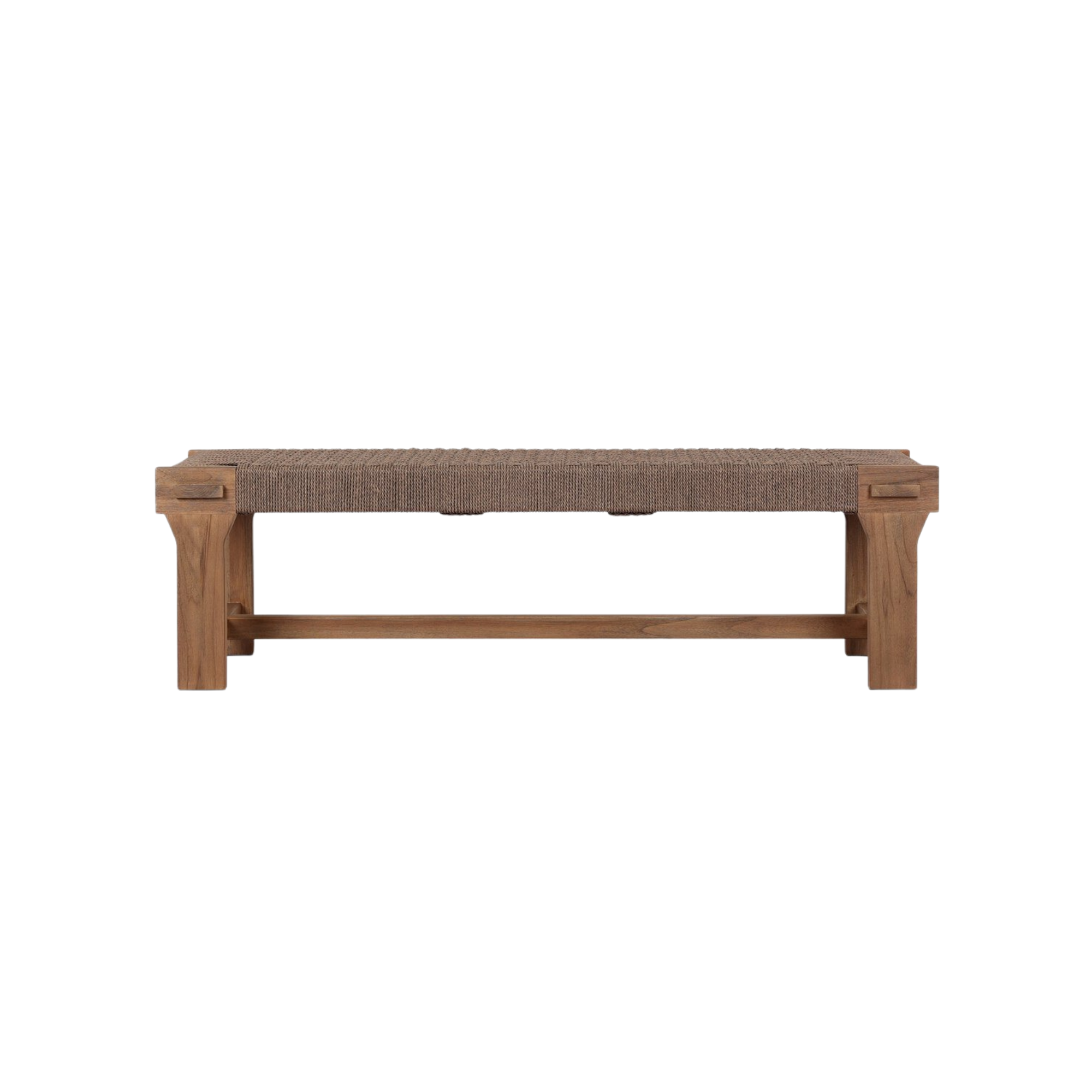 Create an outdoor space that transports you to far corners of the globe. Inspired by traditional designs found throughout Indonesia, this outdoor bench features a beautifully crafted frame made of FSC-certified solid teak with pull-through details and monochromatic weaving throughout. Cover or store indoors during inclement weather and when not in use.