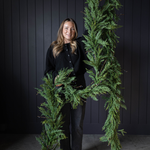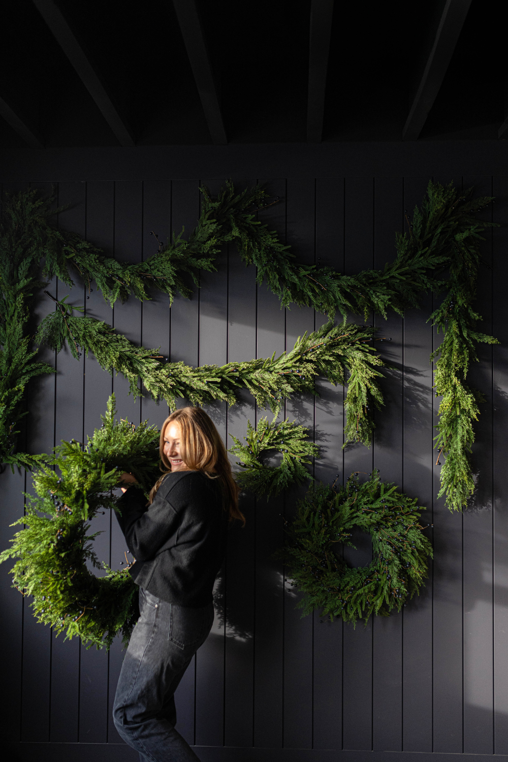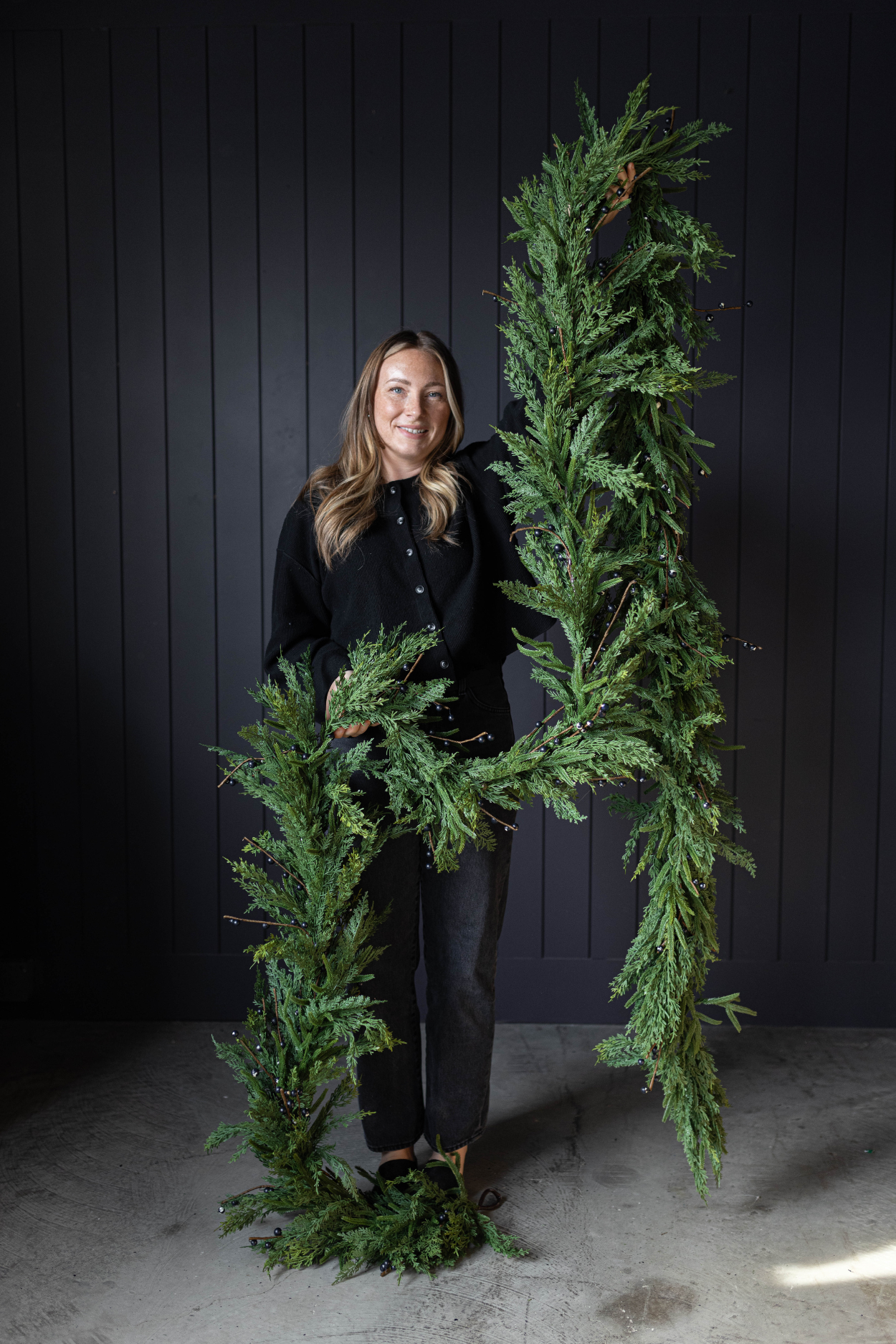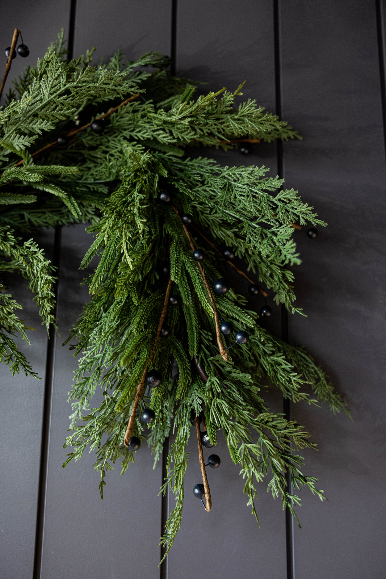 The Navy Plum Berry Norfolk Cypress Real Touch Garland is a high-quality, realistic holiday decoration option. This garland is perfect for capturing Christmas in an impactful way. It can be used to decorate front entrances, stair railings, mantles, tablescapes, and outdoor fences.
