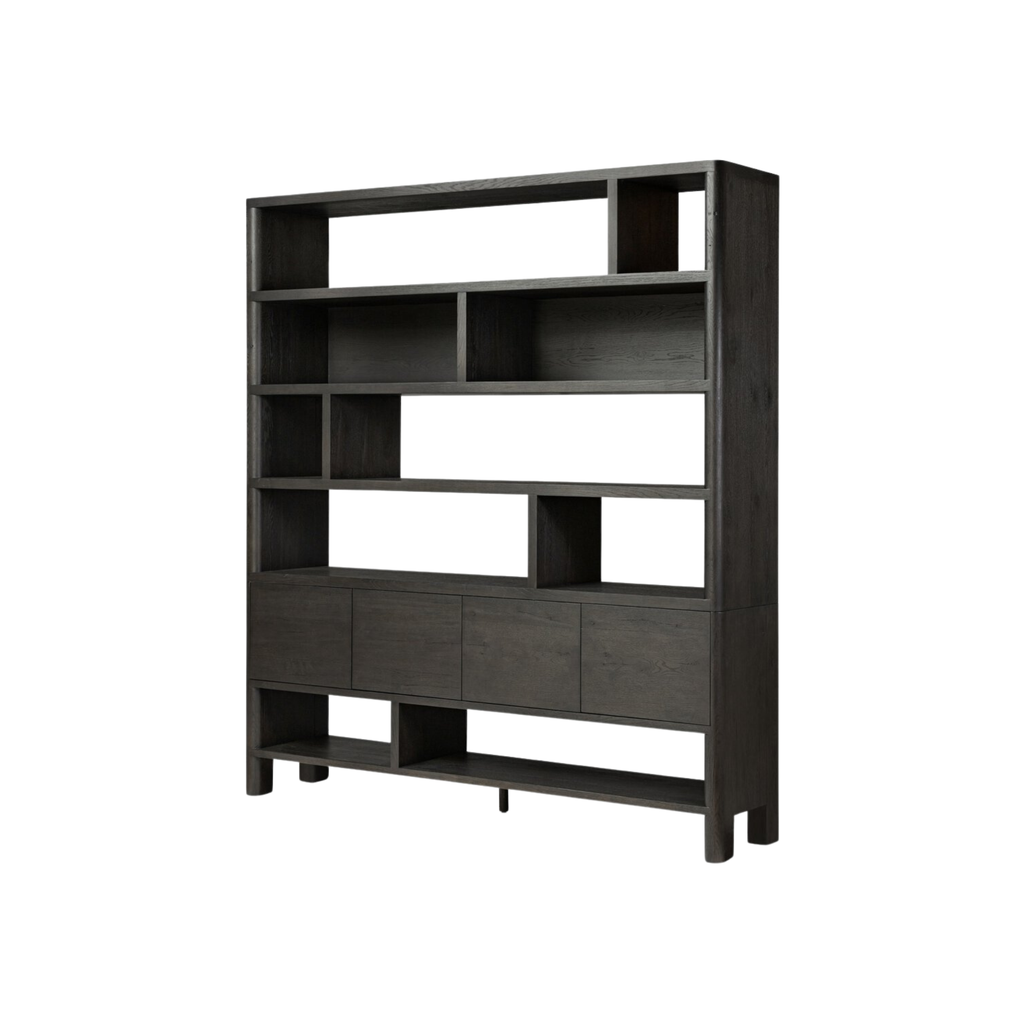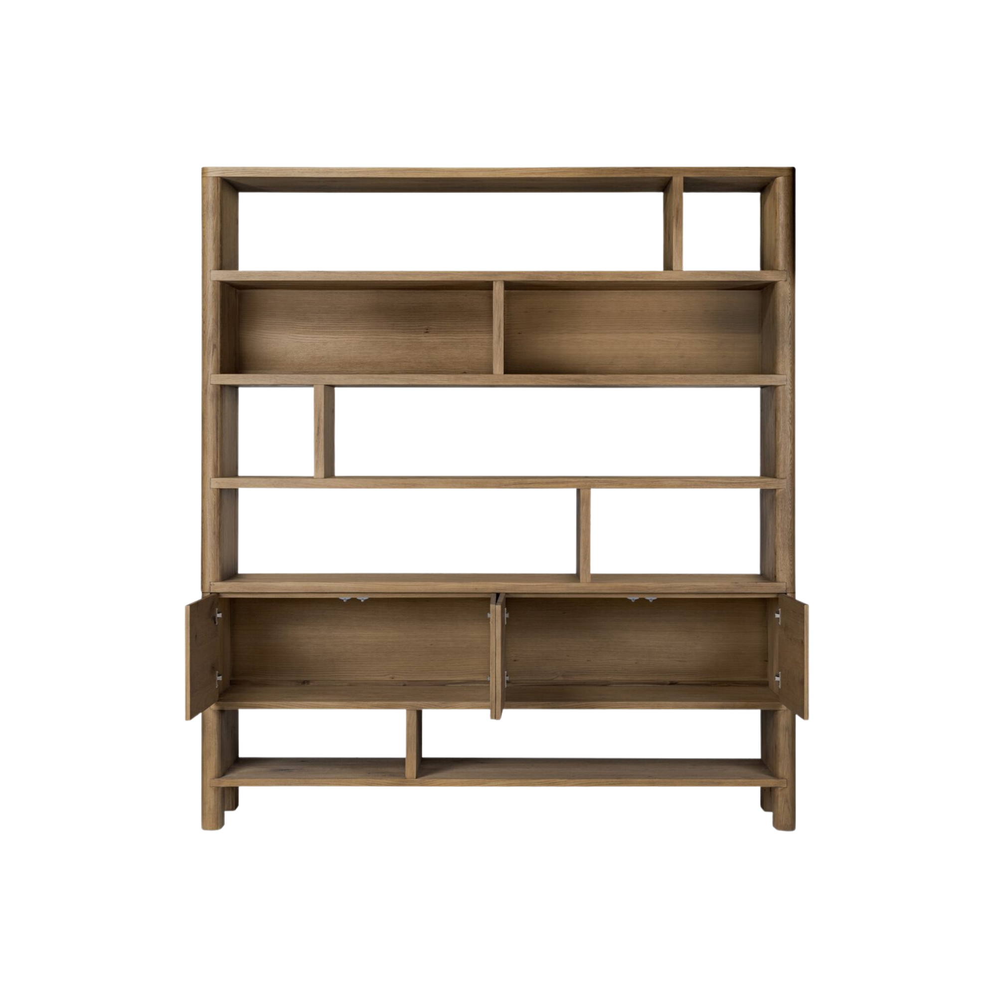Constructed from solid oak and oak veneer, the Noeline Wide Bookcase features a harmonious blend of open and hidden shelving, offering both optimal display space and functional storage. The push-latch doors create a seamless facade, while gently rounded edges introduce a subtly to its sturdy frame, making it an expert choice for sophisticated interiors.