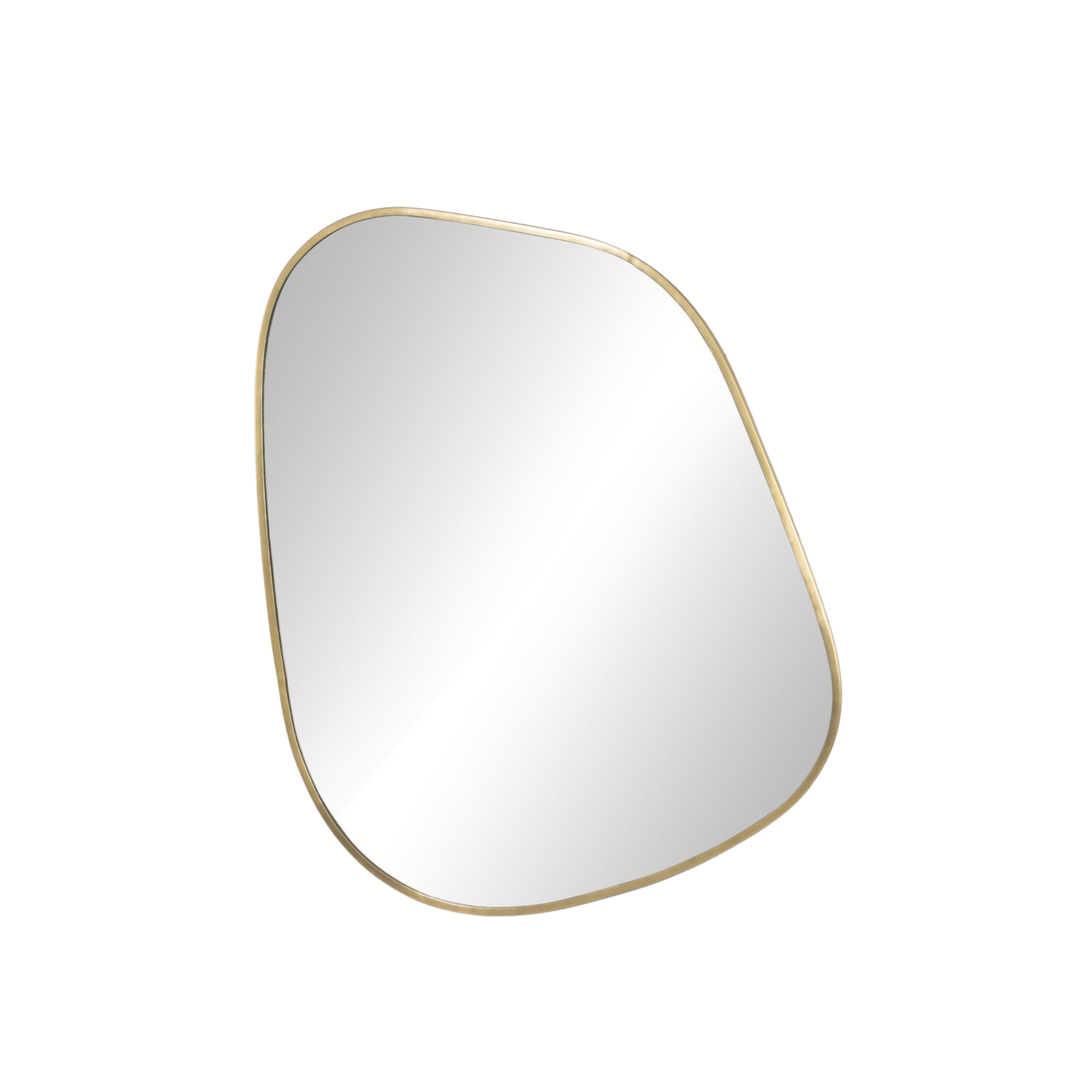 Hand-forged iron with a deep brass finish forms this wall mirror's frame, showcasing fluid, asymmetrical curves that blend character and texture along its outer edge. The modern swooped form adds a striking visual statement to any space.