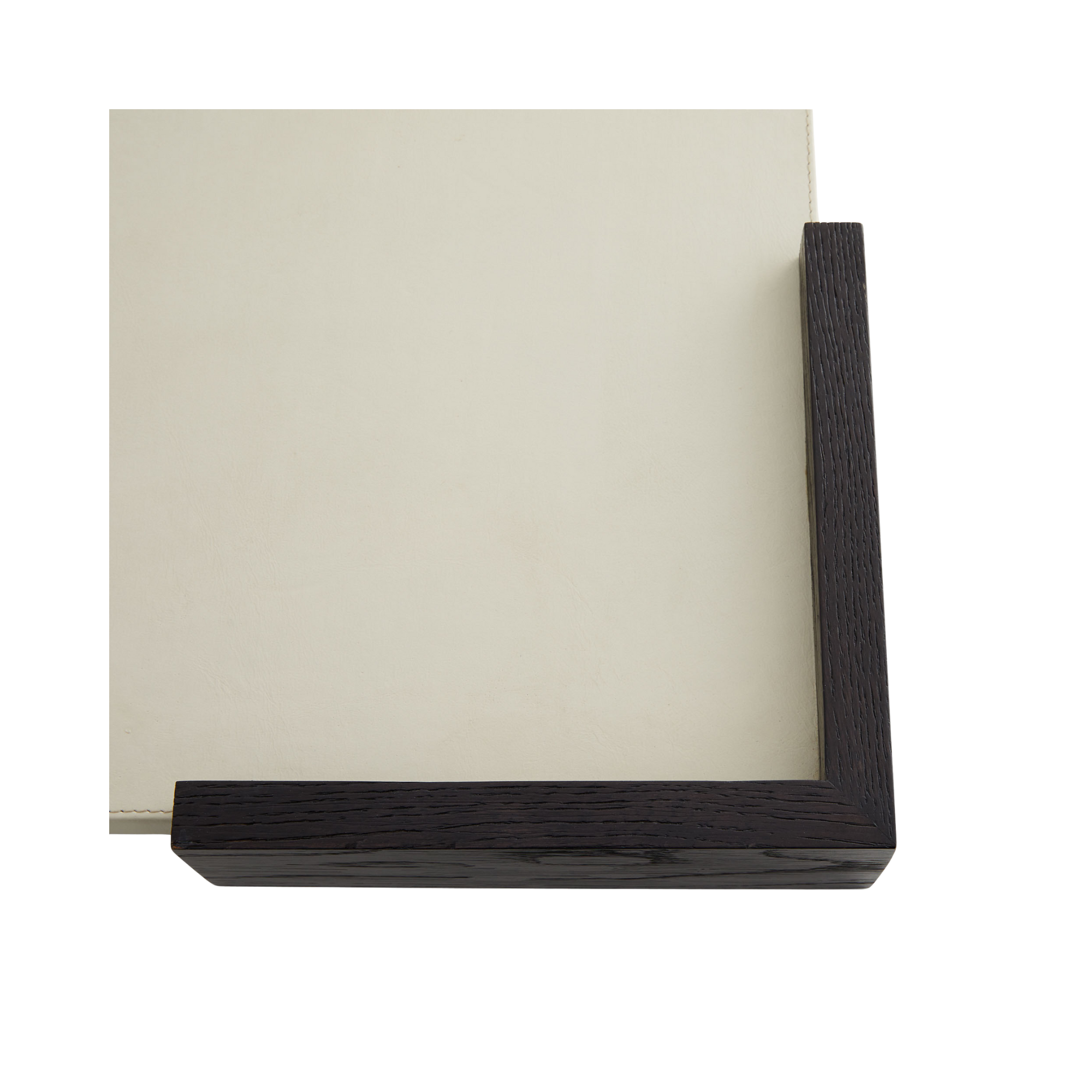 This tray, made from a pairing of oak and leather, is an eye-catching piece on its own. The unique, modern design recalls the Bauhaus movement, with dramatic angles and bold presence. The plank is wrapped in rich, ivory leather for a sophisticated touch, anchored on adjacent corners in ebony-finished oak. Leather and wood will vary.