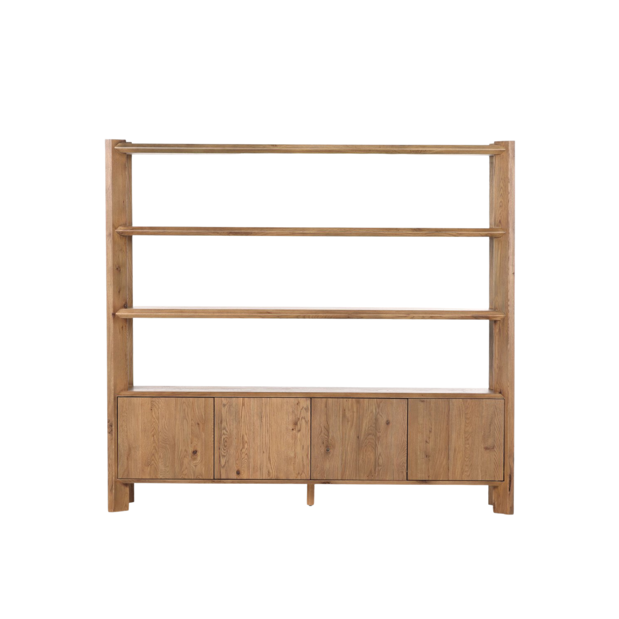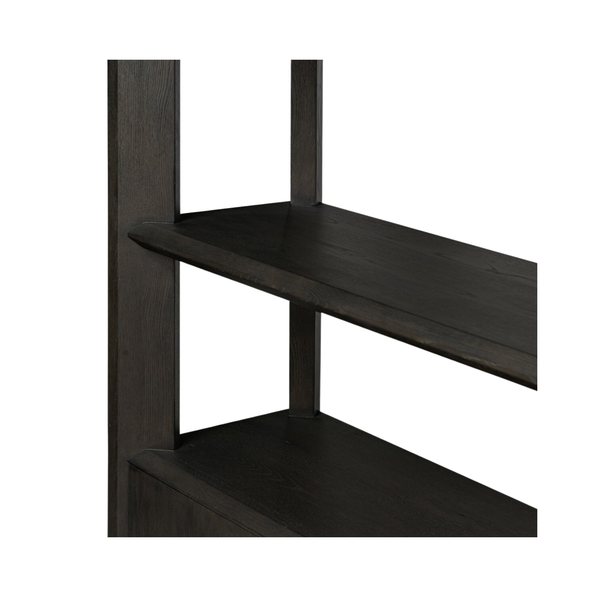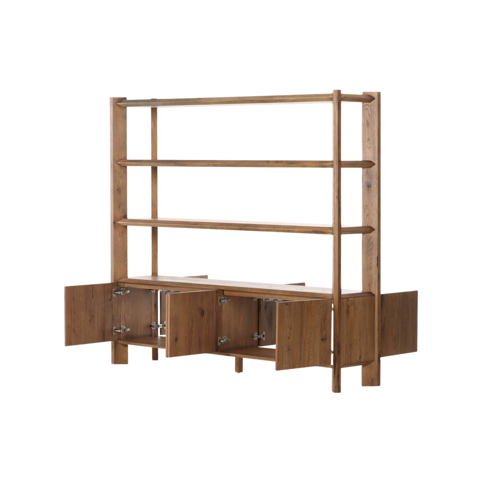 The Orwin Wide Bookshelf combines craftsmanship with design. Made from a blend of solid oak and thick oak veneer, it showcases chamfered edges along the shelves and angled outer legs. This overscale piece offers generous storage while adding a refined sense of movement to any space. Cabinets open from both sides, making this piece an excellent room divider. Perfect for displaying your collection with style.